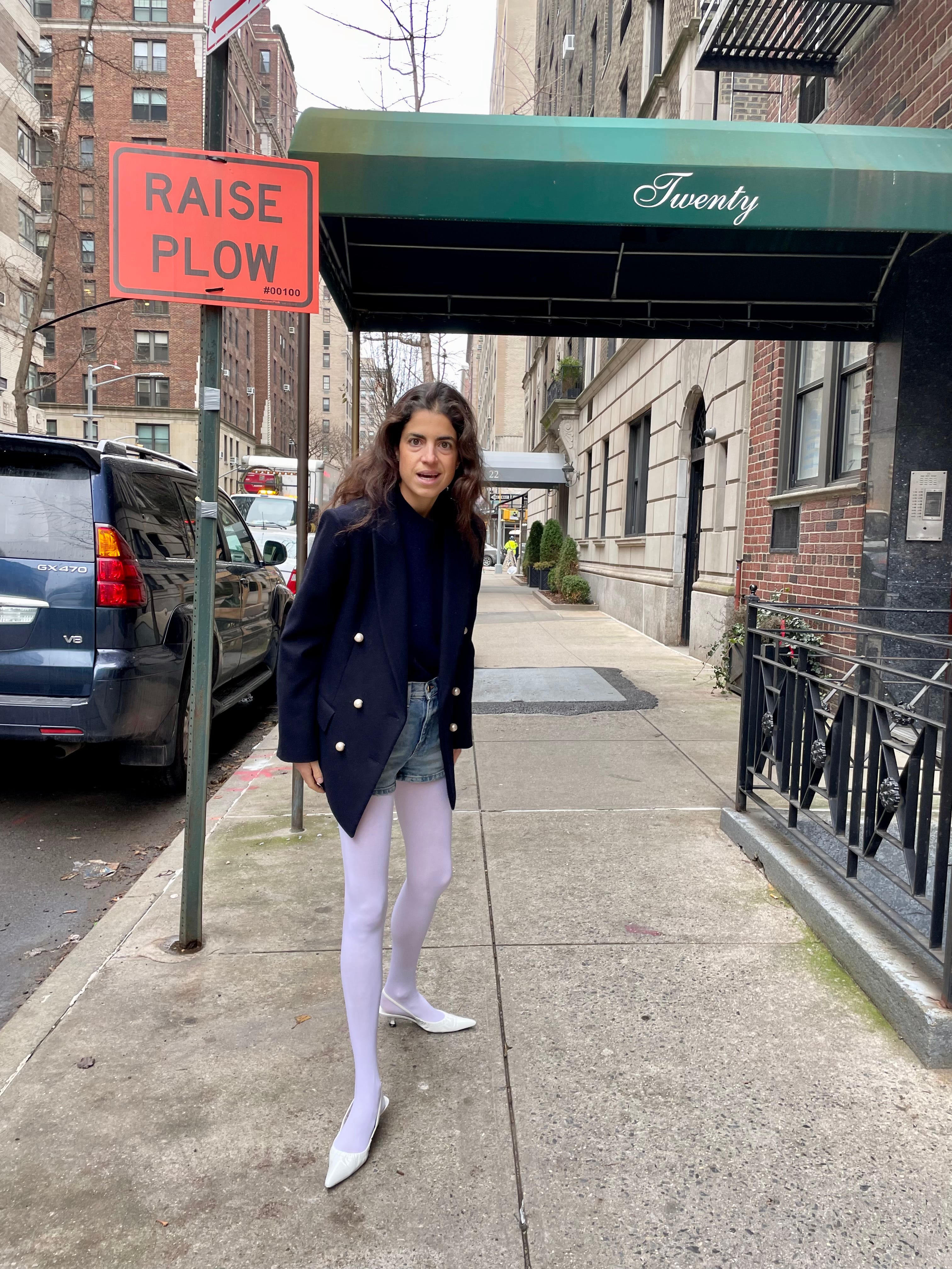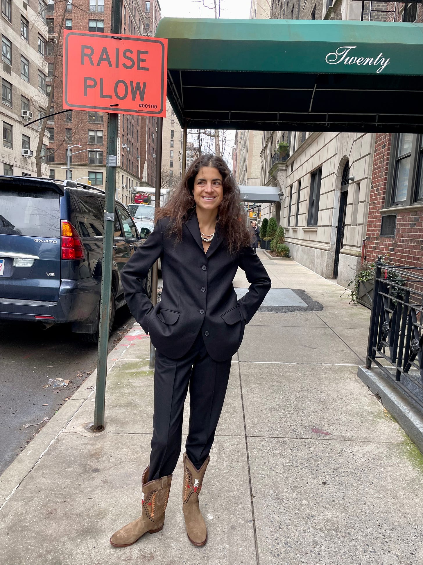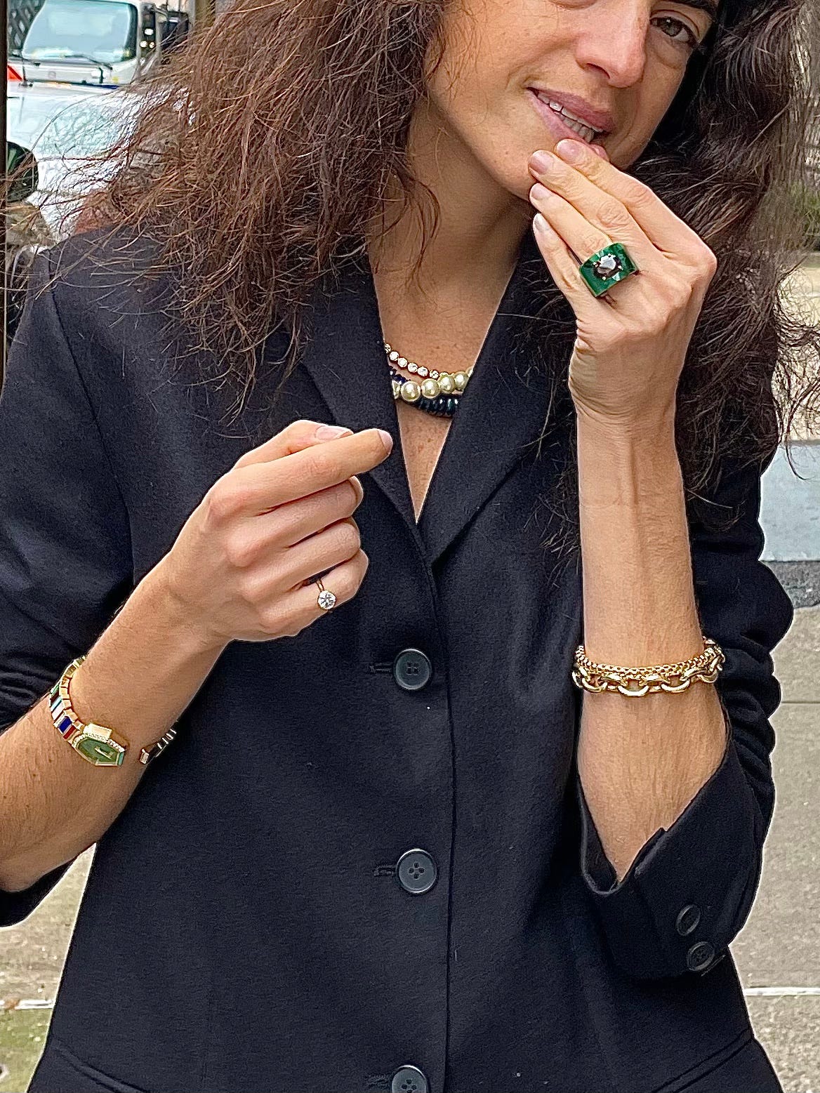 Which is the primary reason I’m not wearing anything under the blazer, and why I added a strand of pearls (love this one from Sophie Buhai), a “tennis” necklace (not real — Daphine) and navy blue opals (very fancy! By Arielle Ratner), plus some gold chains that dangle up and down my wrist when I move (important because it calls attention to your bare limbs, which is unexpected in the cold when we are so covered up), and a couple of rings. The green jade ring is actually more of a nod to the boots — and per the boots: