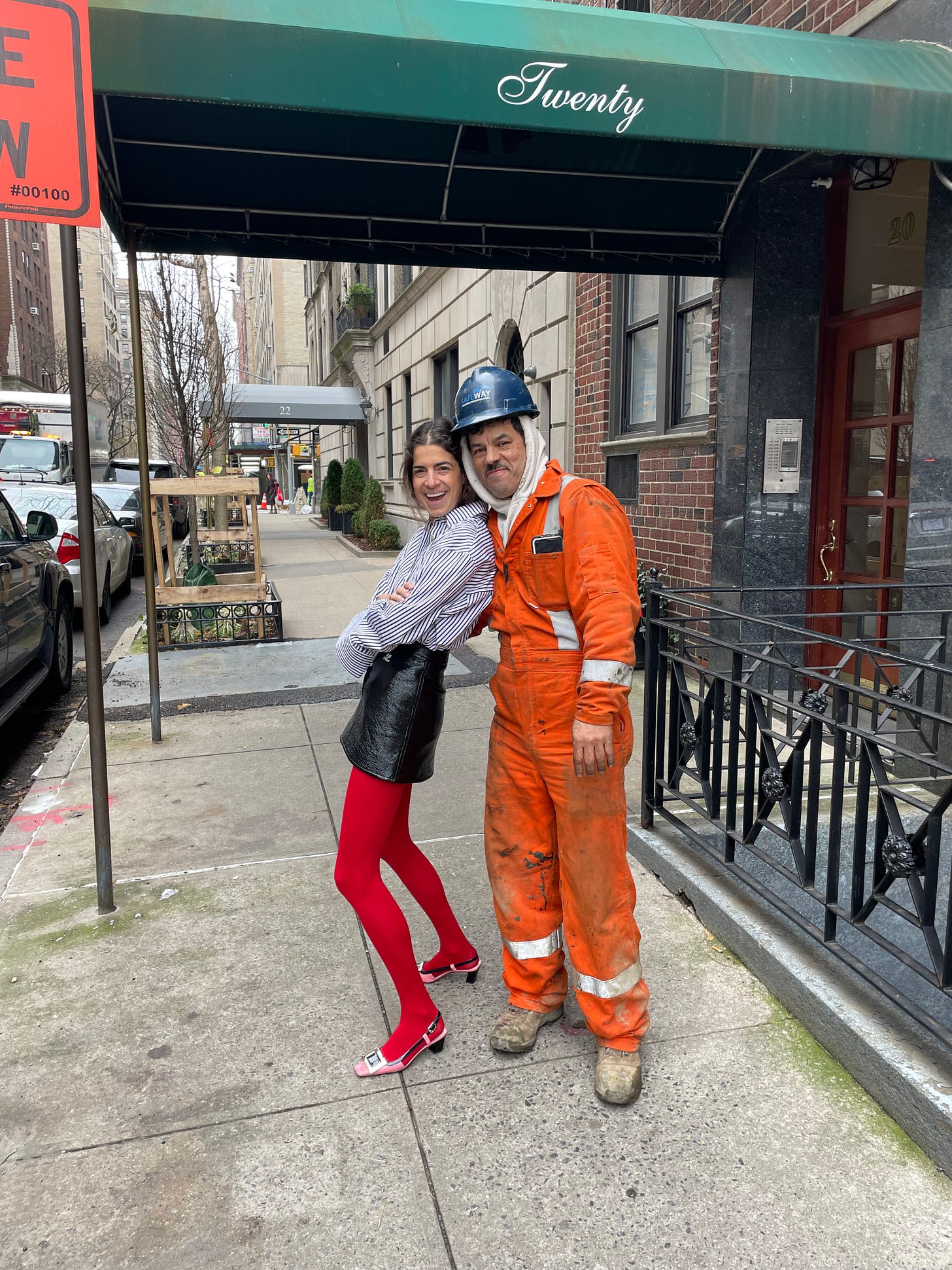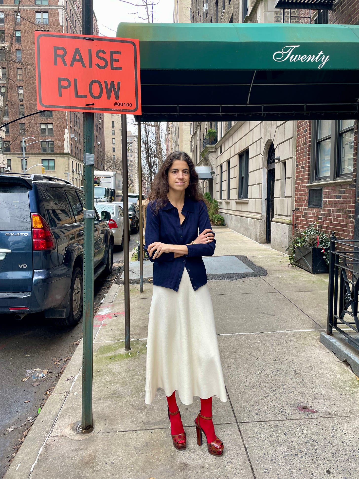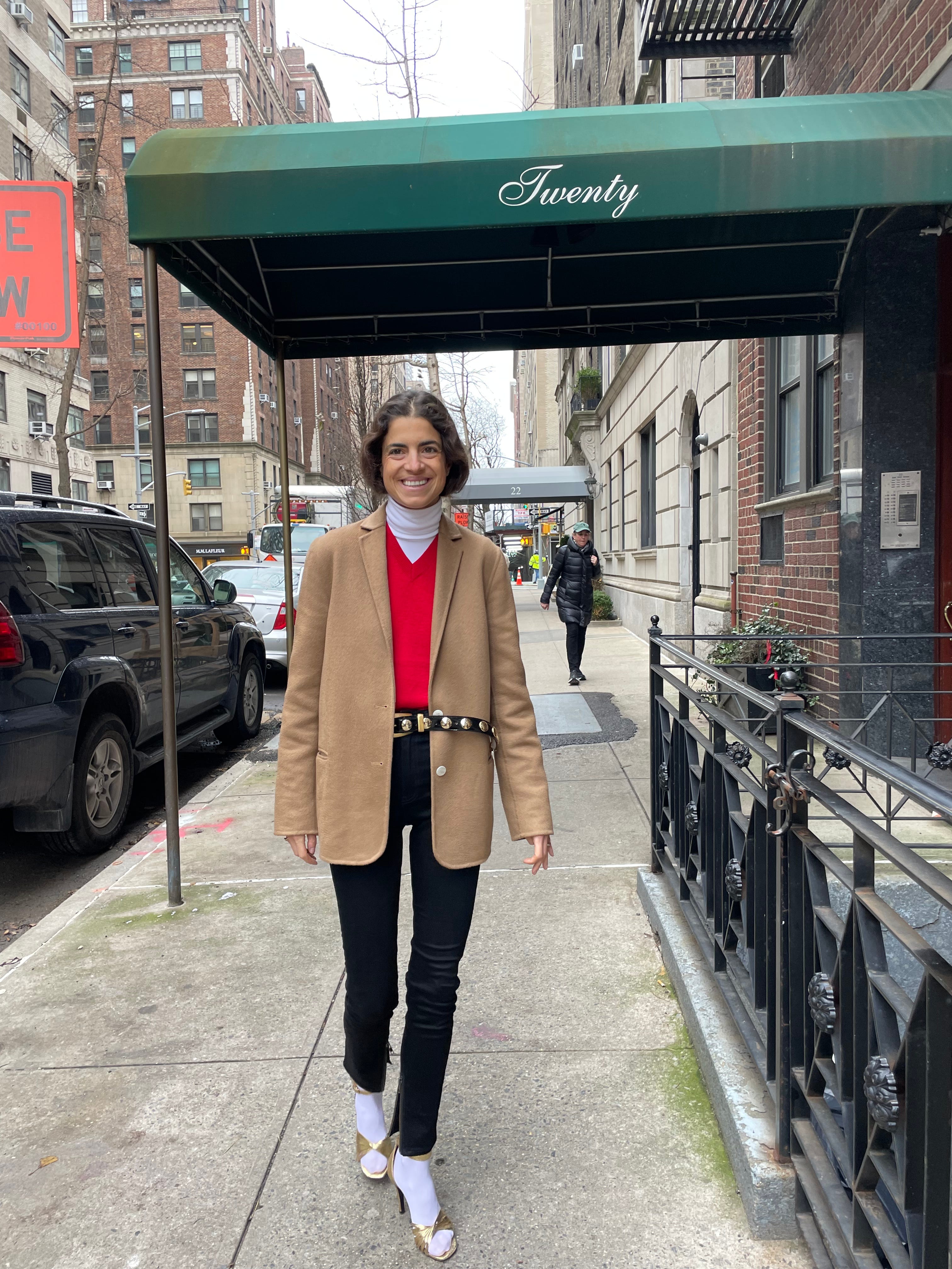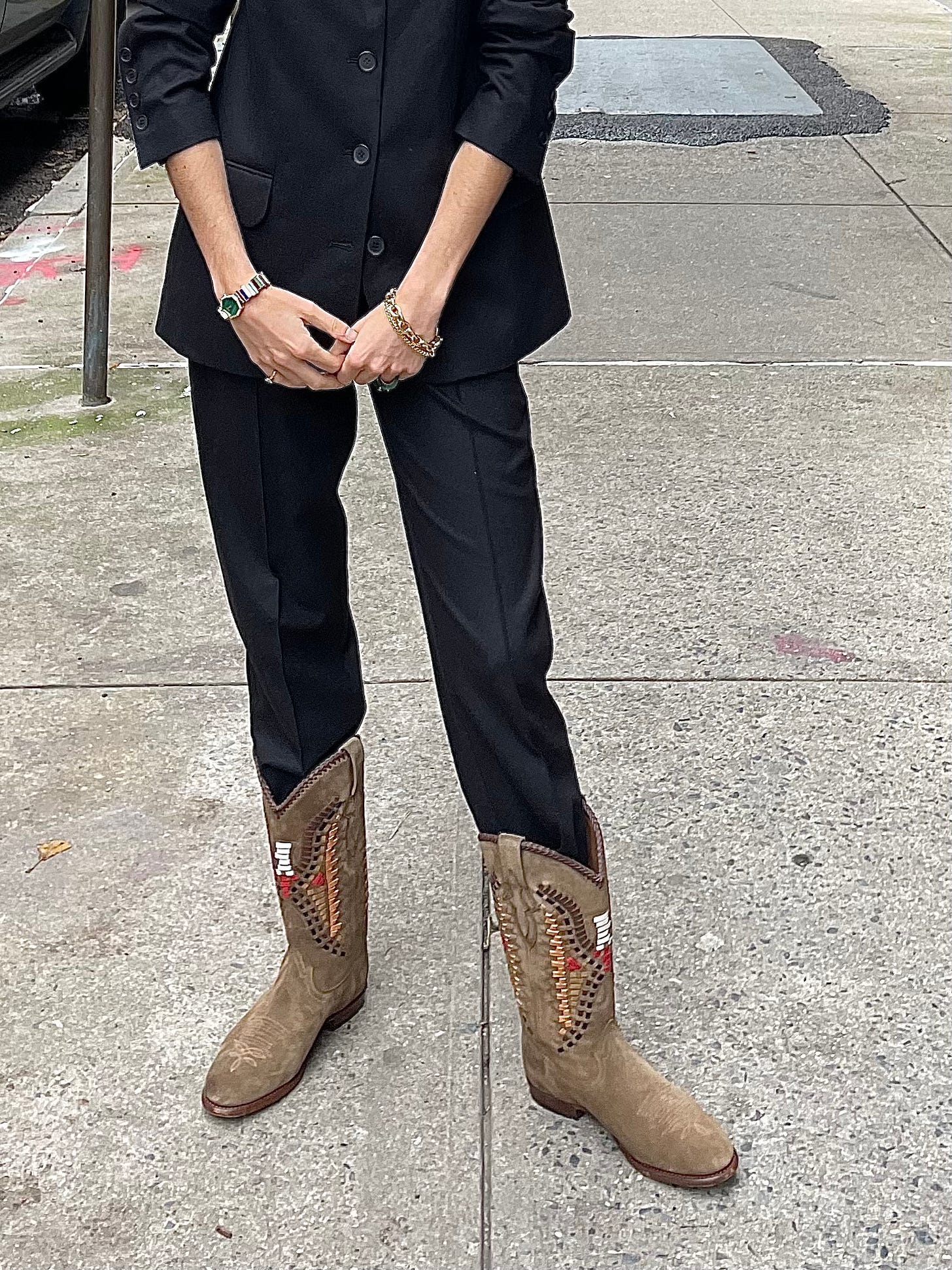 Which is the primary reason I’m not wearing anything under the blazer, and why I added a strand of pearls (love this one from Sophie Buhai), a “tennis” necklace (not real — Daphine) and navy blue opals (very fancy! By Arielle Ratner), plus some gold chains that dangle up and down my wrist when I move (important because it calls attention to your bare limbs, which is unexpected in the cold when we are so covered up), and a couple of rings. The green jade ring is actually more of a nod to the boots — and per the boots: