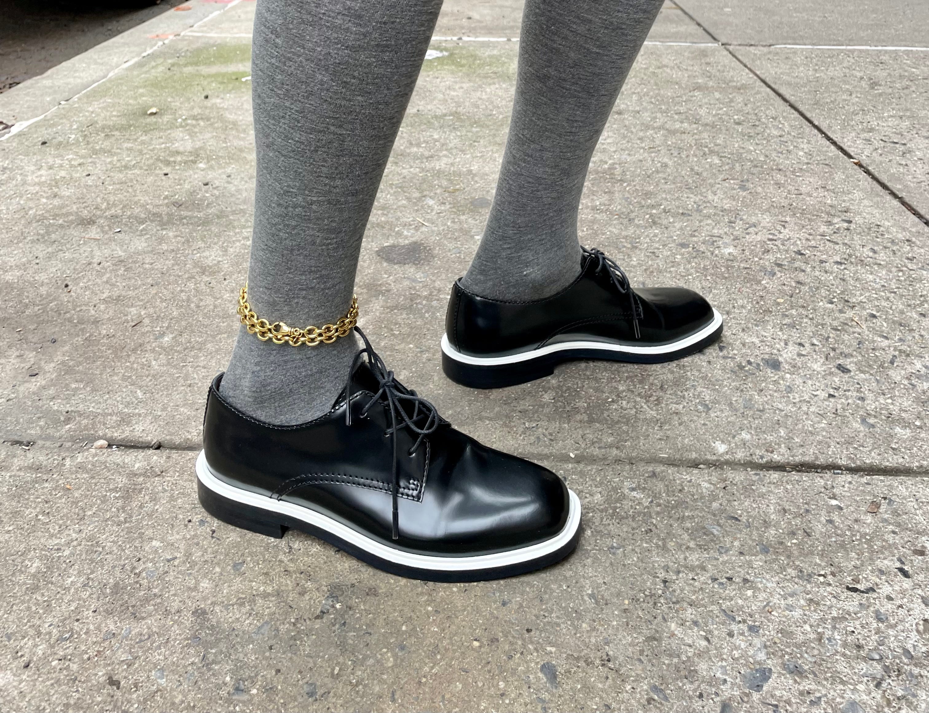 This style tip is also a great way to (1) eschew color in an outfit without actually eliminating it altogether (2) recontextualize any shoes (colorful or otherwise — maybe brown) you haven’t worn in a while.