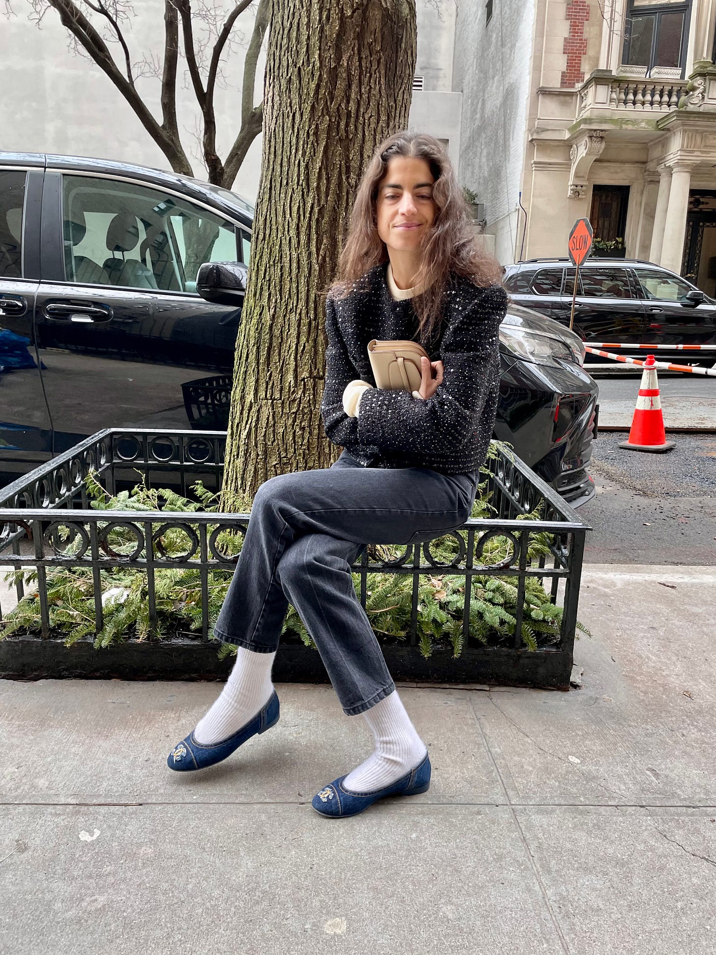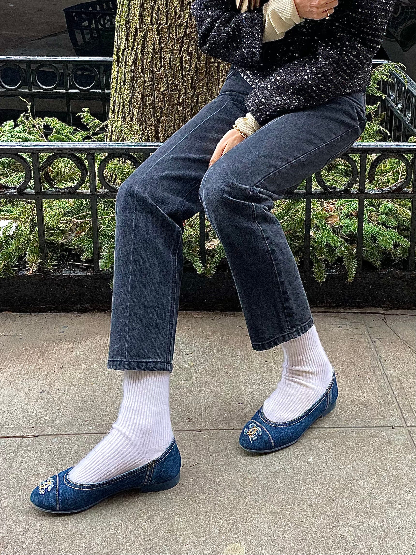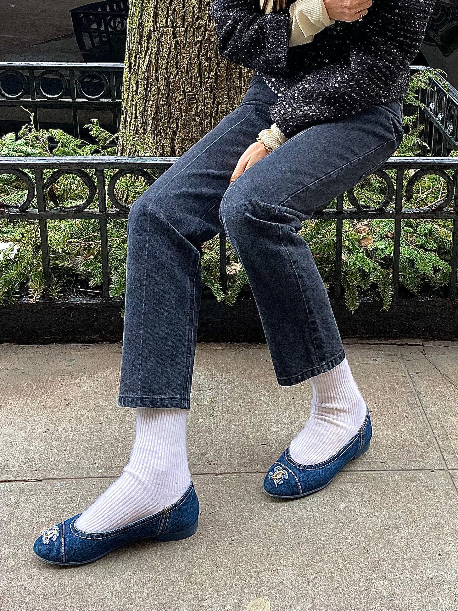 and it set off a lightbulb that helped me reorient how I think about when to wear a more structured ballet flat. The Miu Miu/actual ballerina way (above) employs chunky knit socks to wear with the supple flats a la: