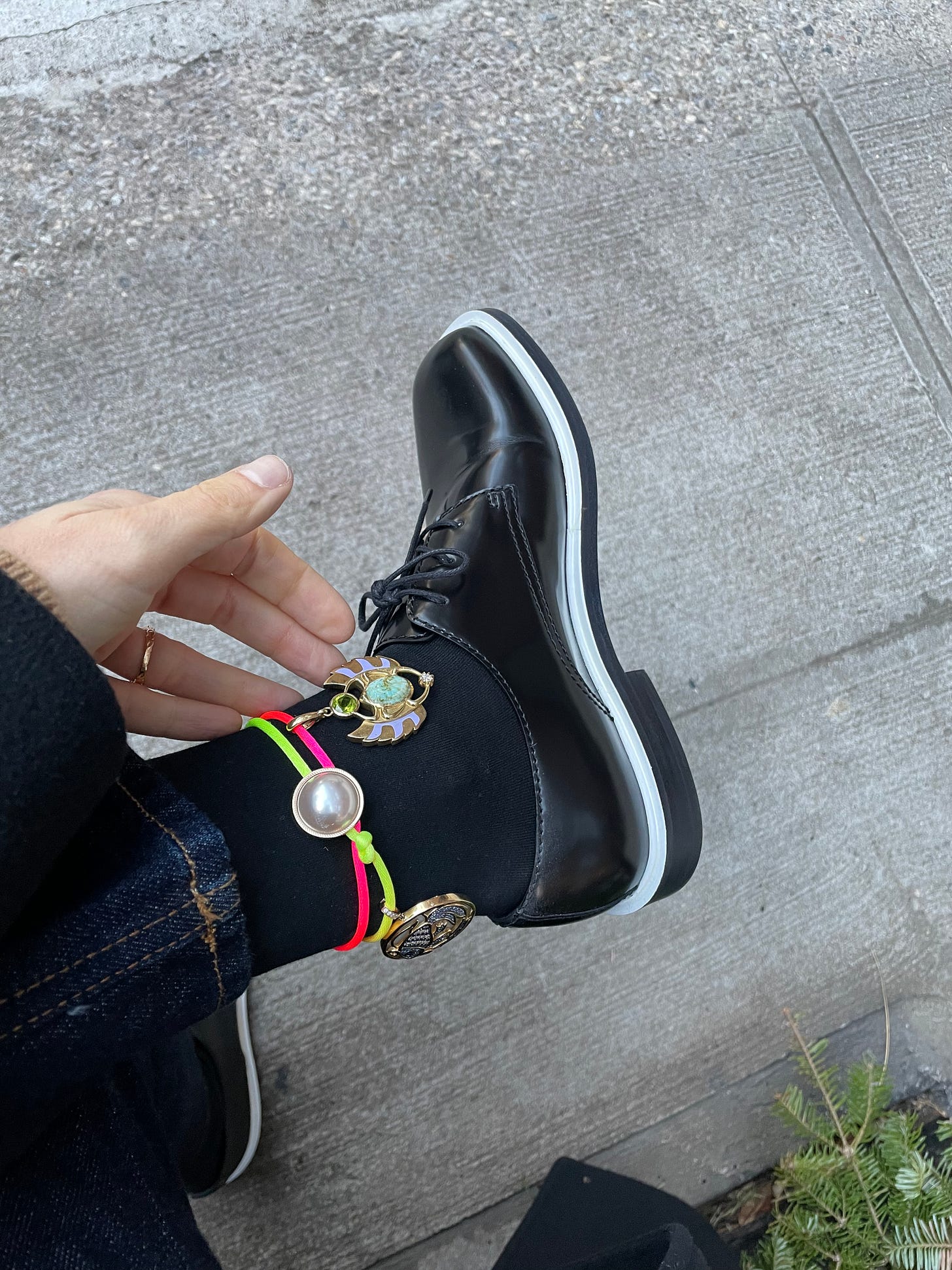I’m noticing this thing lately where I feel like I’m dressed too plainly if there’s no hardware/embellishment on the look — if I’m styled into an amalgam of “soft garments” (that is, no explicit buttons/snaps/shiny buckles). One easy way to counter this is with a belt. Another is by wearing a pair of shoes in an attention-seeking material (like satin or patent leather), or by wearing shoes that have hardware — something like this. These are really the platonic ideal of the moment but if you don’t have a pair like it, as I don’t, and don’t really wear heels (even if they’re block/kitten) during the day, affixing something to your ankle, in partic when it’s over your tights or socks achieves the same effect a buckle would. Go ham on your other appendages too.