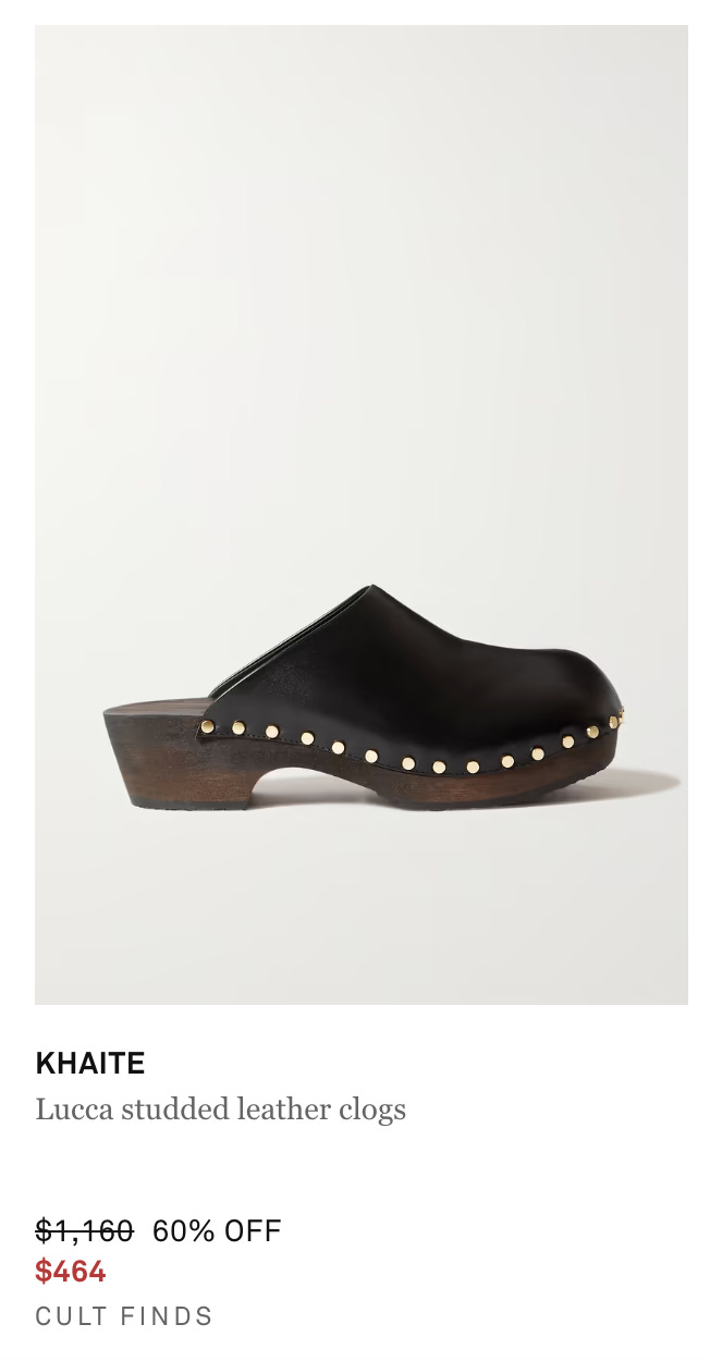 Khaite clogs, $464 If the wood sole is not your thing, implicit in this recommendation is the classic Birkenstock clog. The only thing I’d say there is that it’s def better with pants than skirts. These are also pretty good, actually.