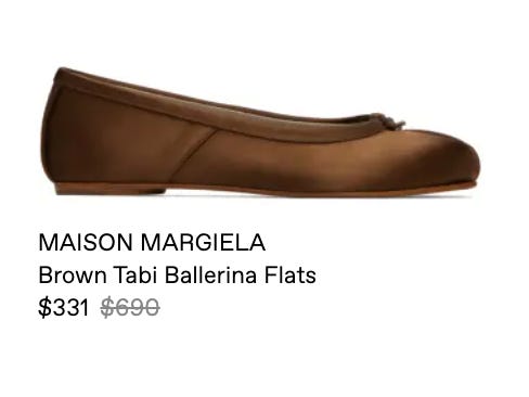 The tabis: The most specific/niche rec., and also the most subversive because we’re talking about a ballet flat, which is actually quite refined a shoe shape. But the toe is split and fairly wide, so you get a good dose of ugly from these in perhaps the least risky way of the whole range. (I do like these too…)