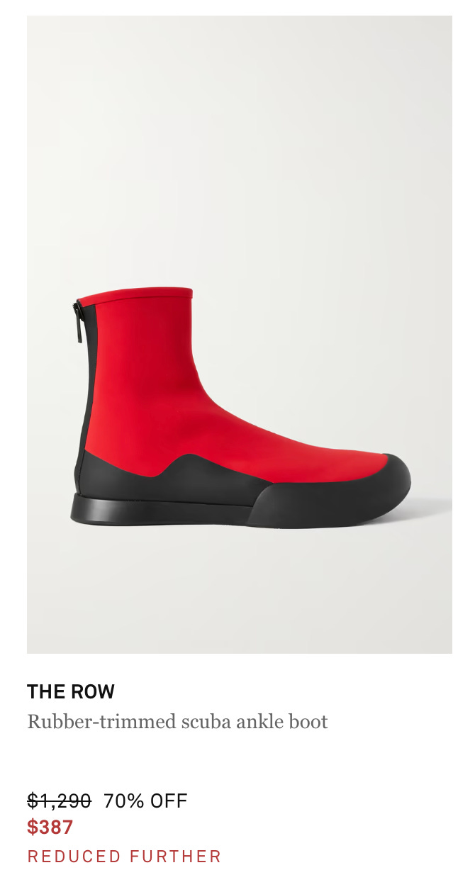 The Row’s sneakerboots, $387-$516 Serves as a good foil, too, on account of the rubber sole for the unexpected pairing of boot and delicate necklace to hit you right around breast line (see: pearls, gold chain).