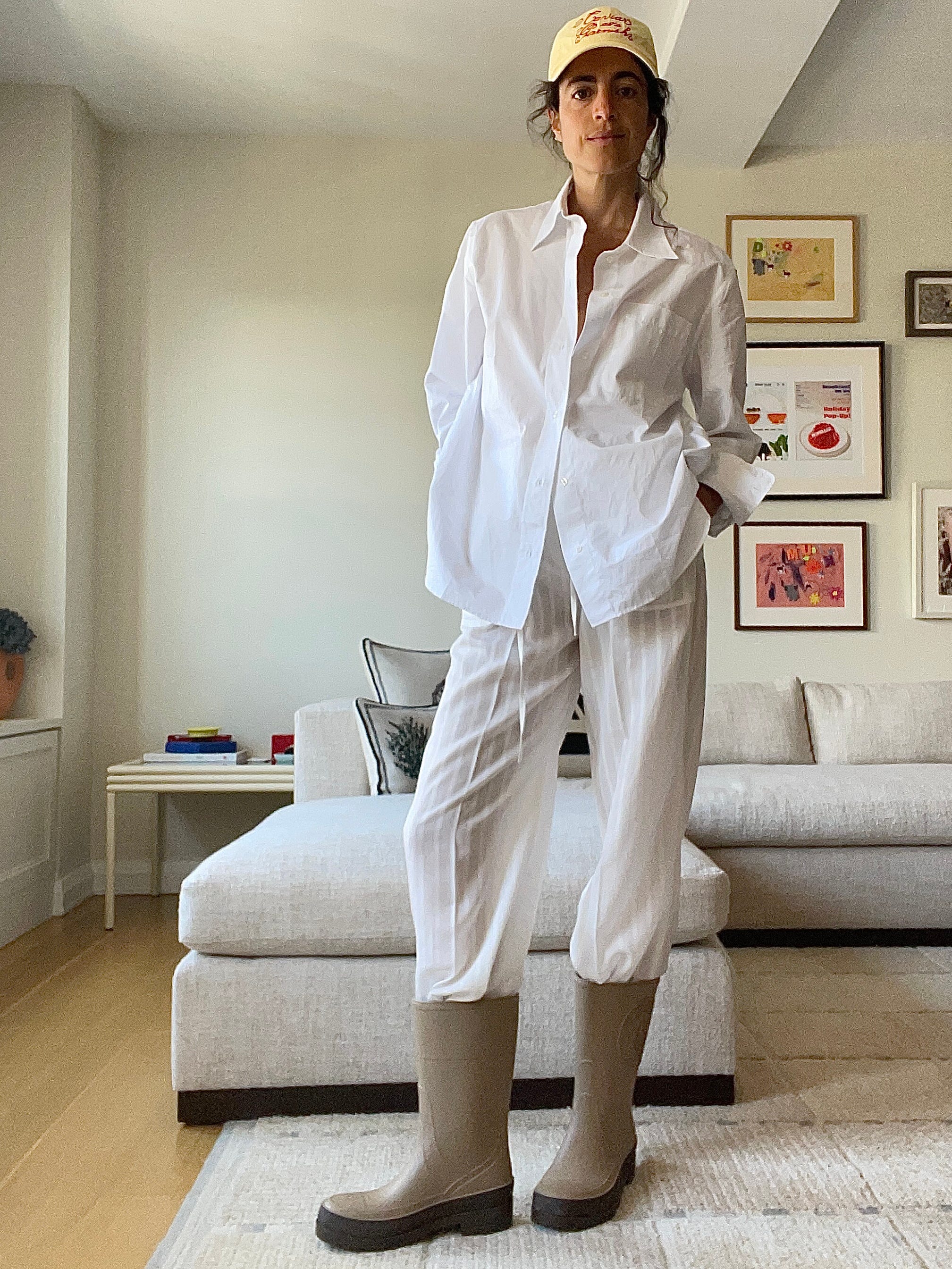 Soeur shirt, Dior boots. Maybe khaki (Matteau, on sale for $110) could have been a more fitting drawstring pant accent here, but you work with what you’ve got! The hat says “Caviar as garnish” - I like the colors! And Nora Ephron!