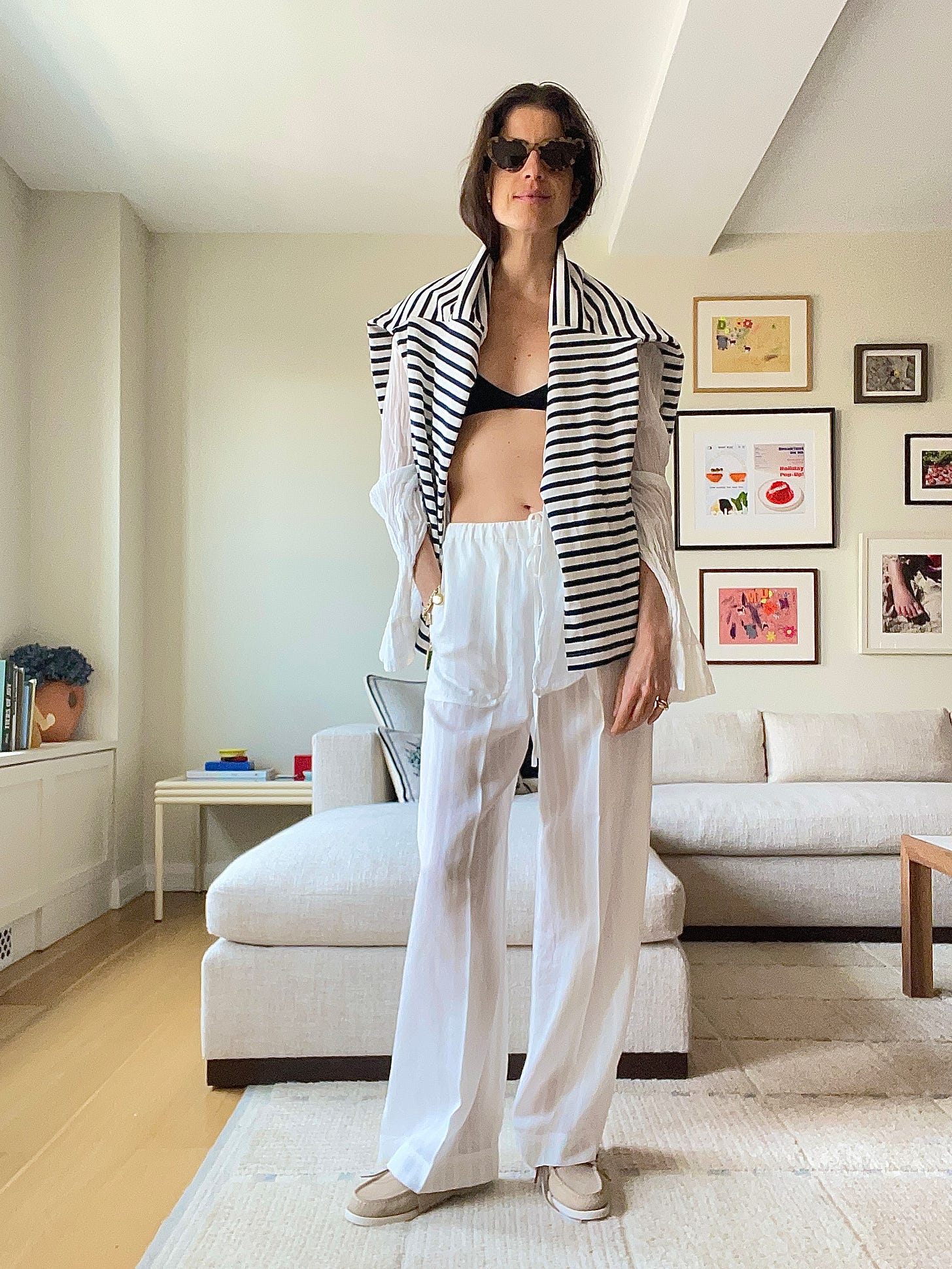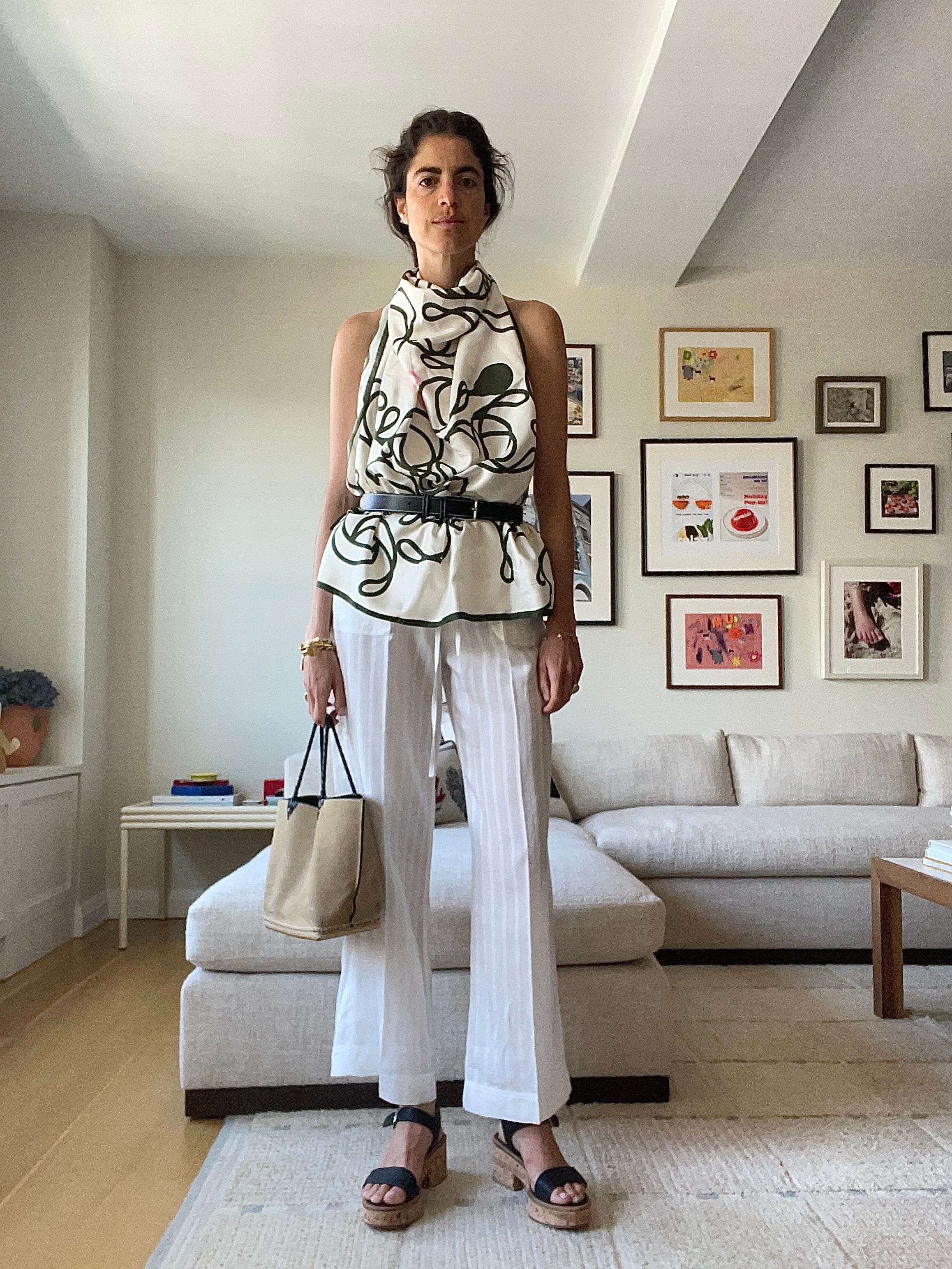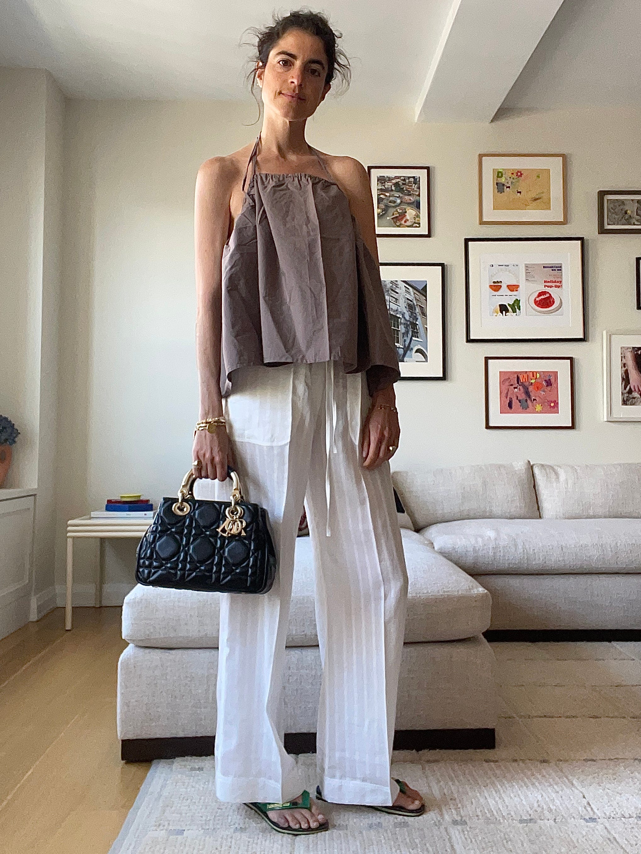 Deiji Studios halter top, which maybe I should have ironed, Toteme white cotton-voile drawstring pants (worn throughout; these with the drawstring hem are a go too), Havaianas x Rotate flip flops