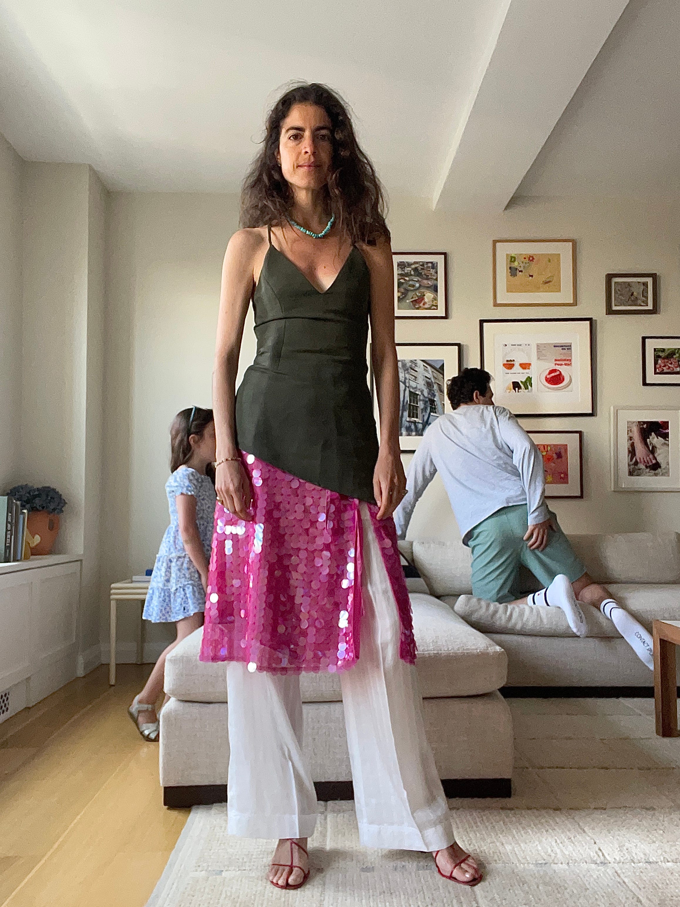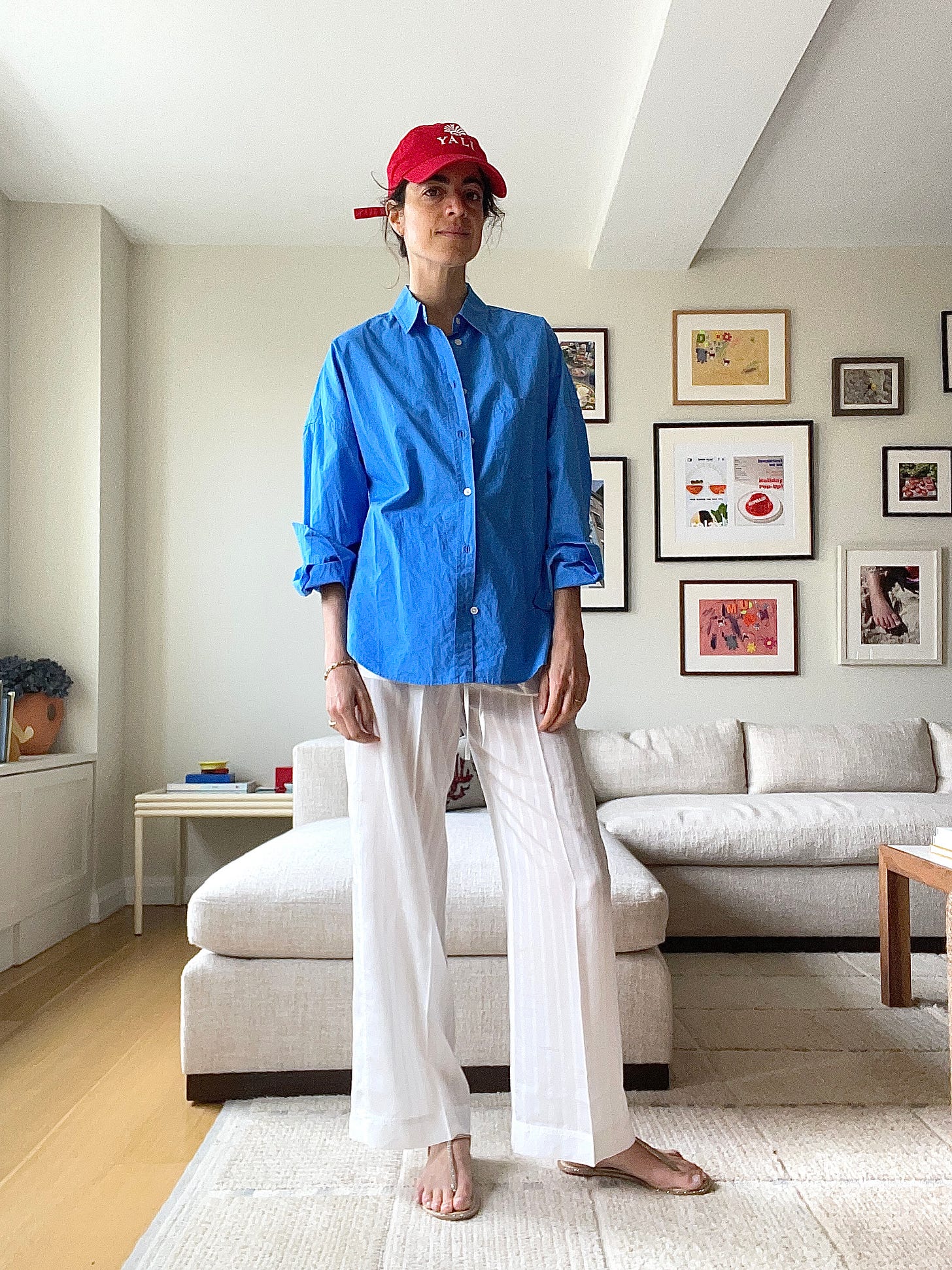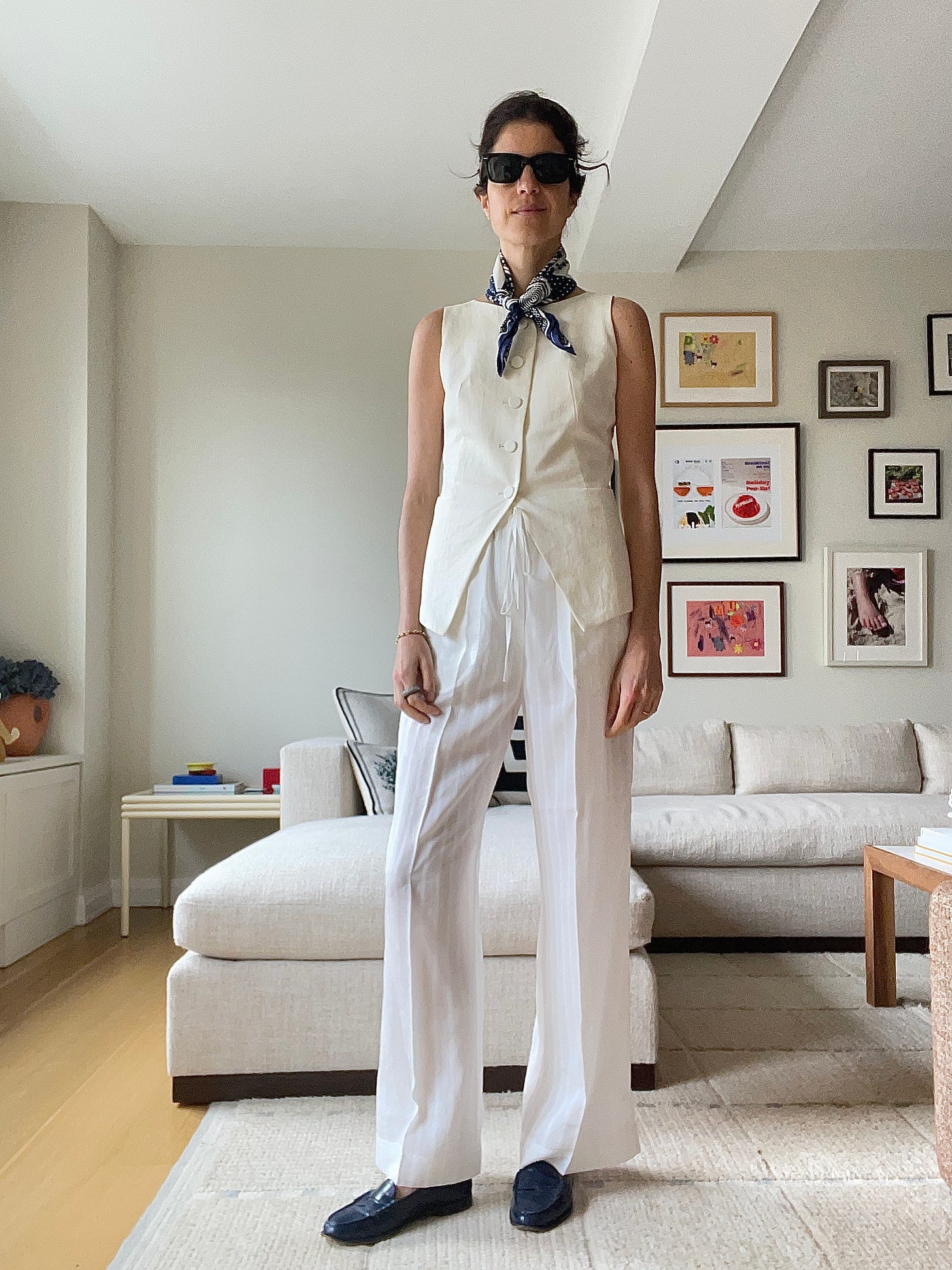 Deiji Studios halter top, which maybe I should have ironed, Toteme white cotton-voile drawstring pants (worn throughout; these with the drawstring hem are a go too), Havaianas x Rotate flip flops