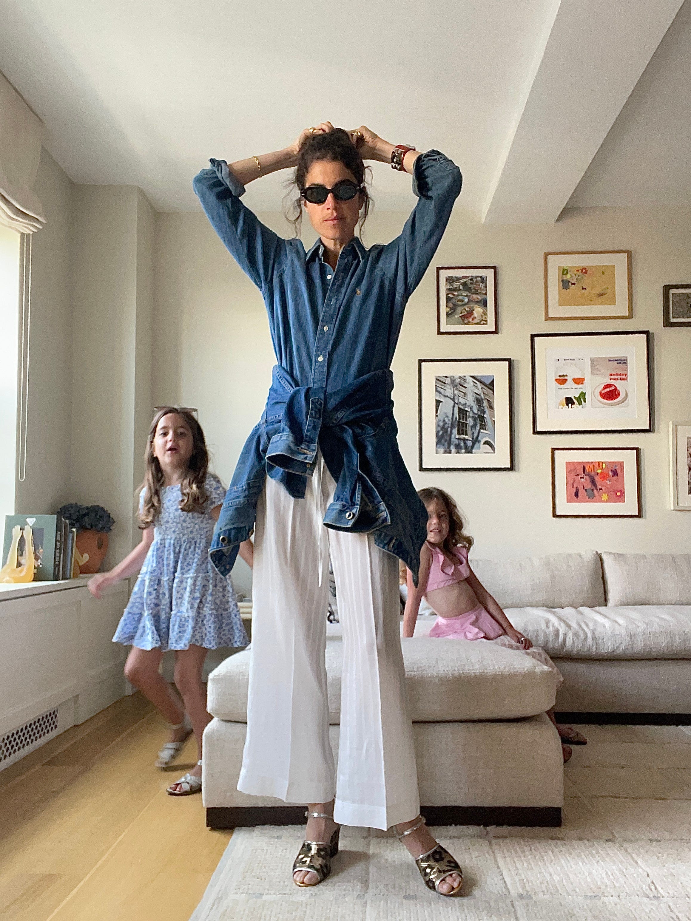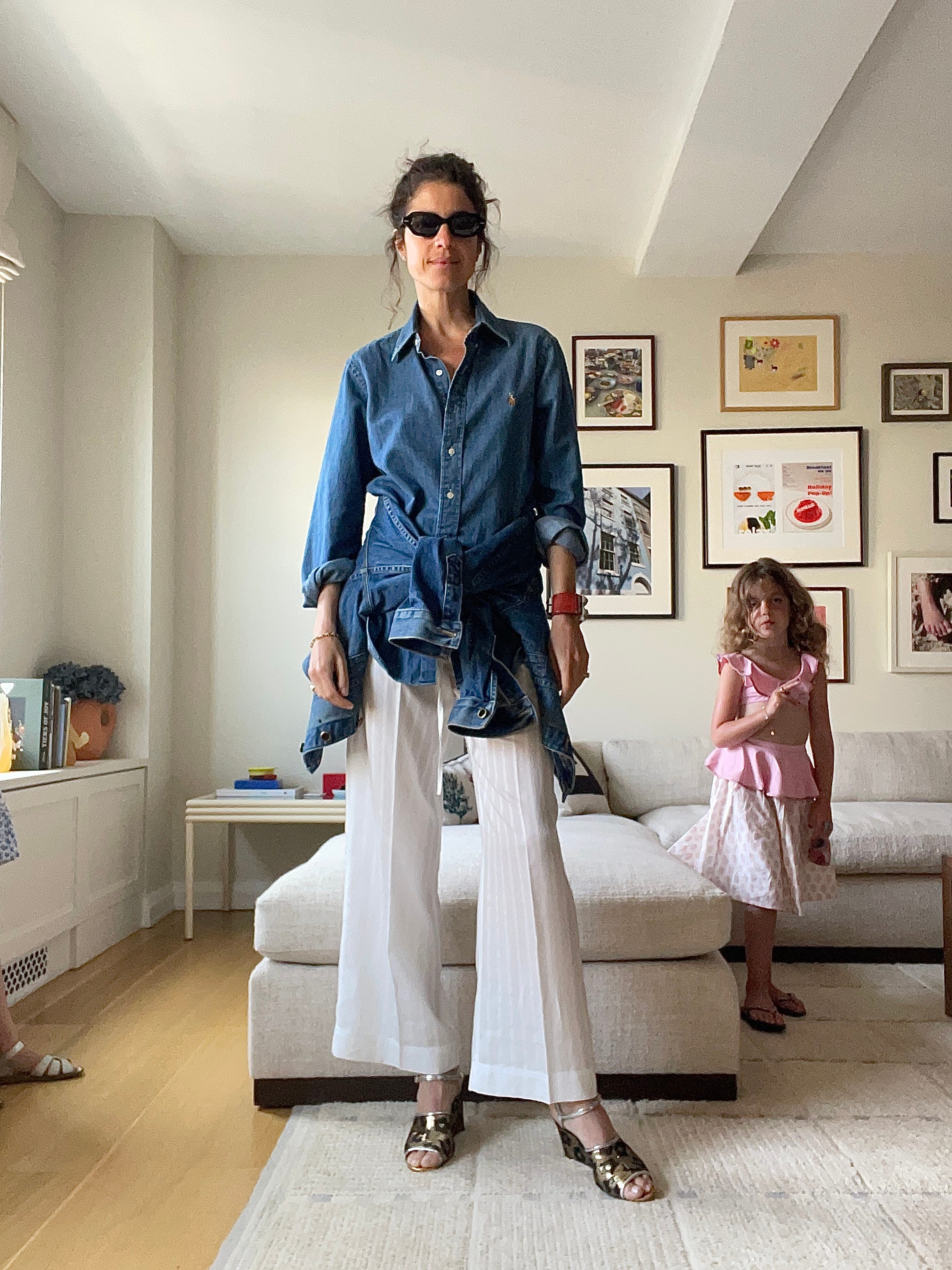 Polo RL denim shirt styled with a jean jacket around my waist and La Double J wedges (on sale for $364 here; the sunglasses are Oliver Peoples