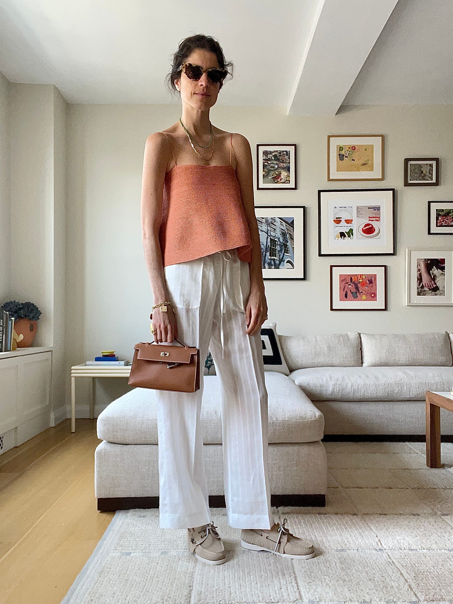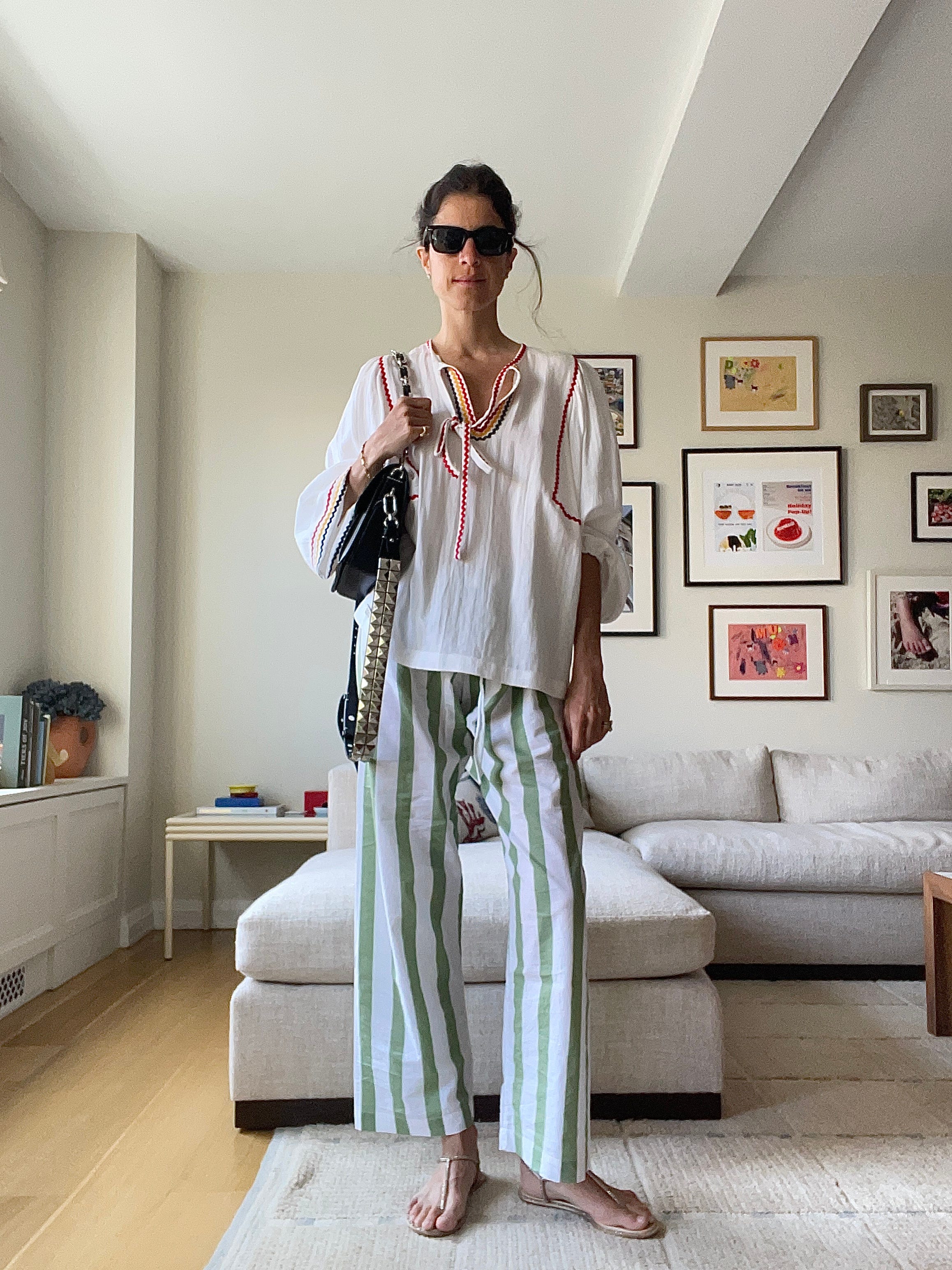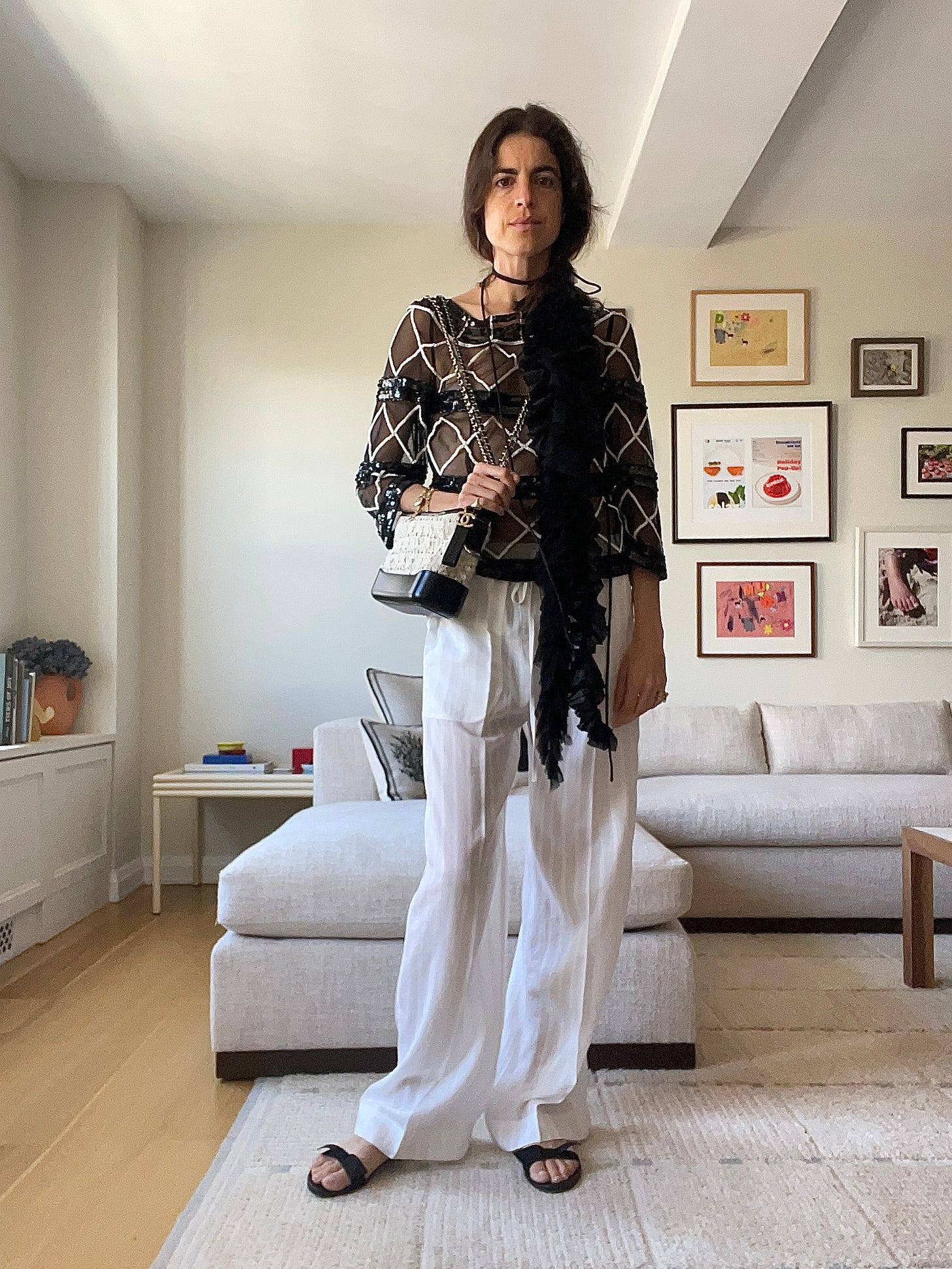 Femme Maison top, TK pants (from an actual pajama set!), Rene Caovilla sandals and Michael Kors bag (here’s the closest I could find — the chain strap is coming back fastandhard; but maybe one of us needs this one too)