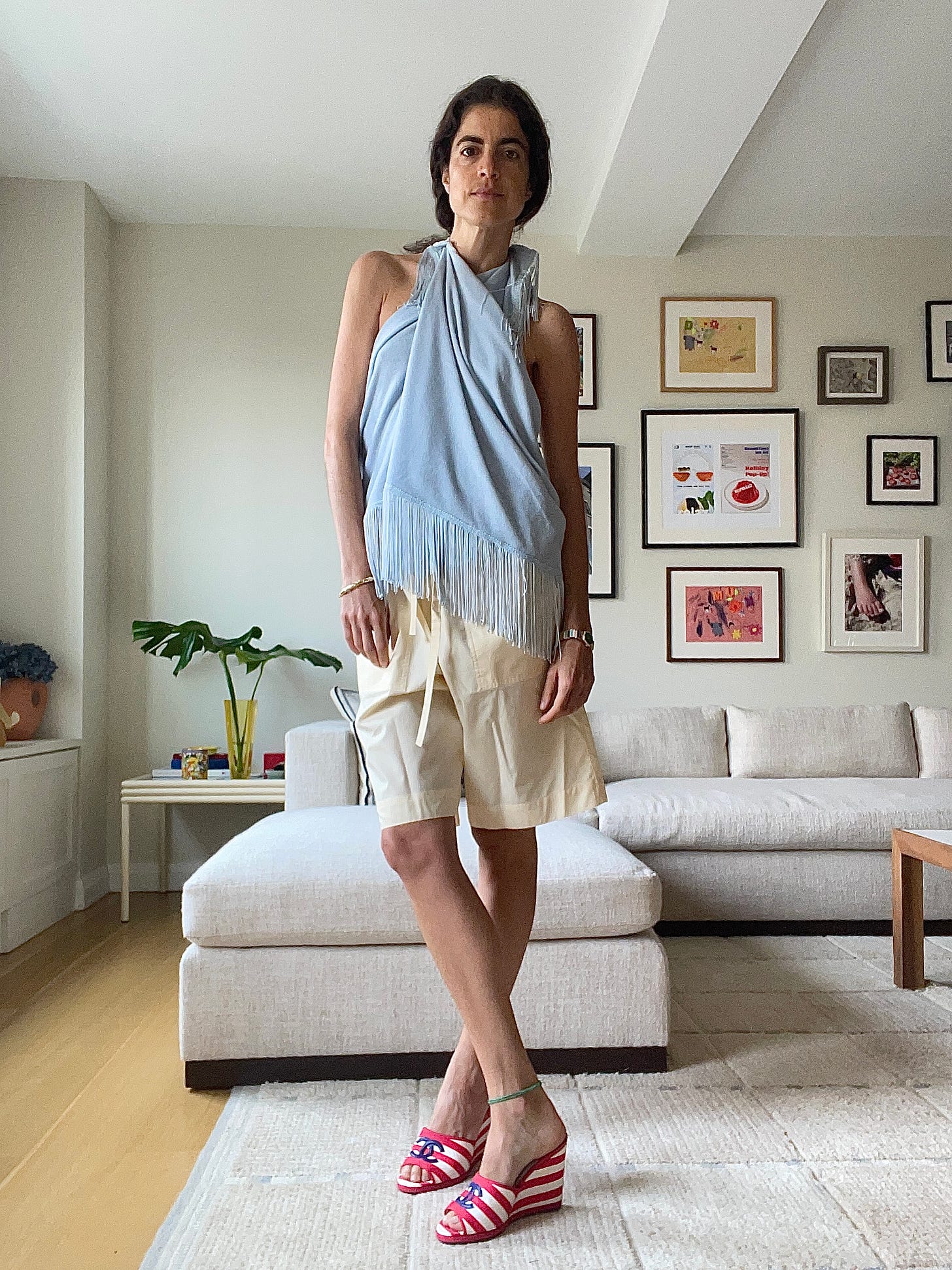 Gabriel Forsach terry halter top (it’s also a wrap skirt/sarong!), Cafe Leandra x Soeur shorts, Chanel striped wedges (not the same, but I love these too, and these lace up, but they seem v practical)