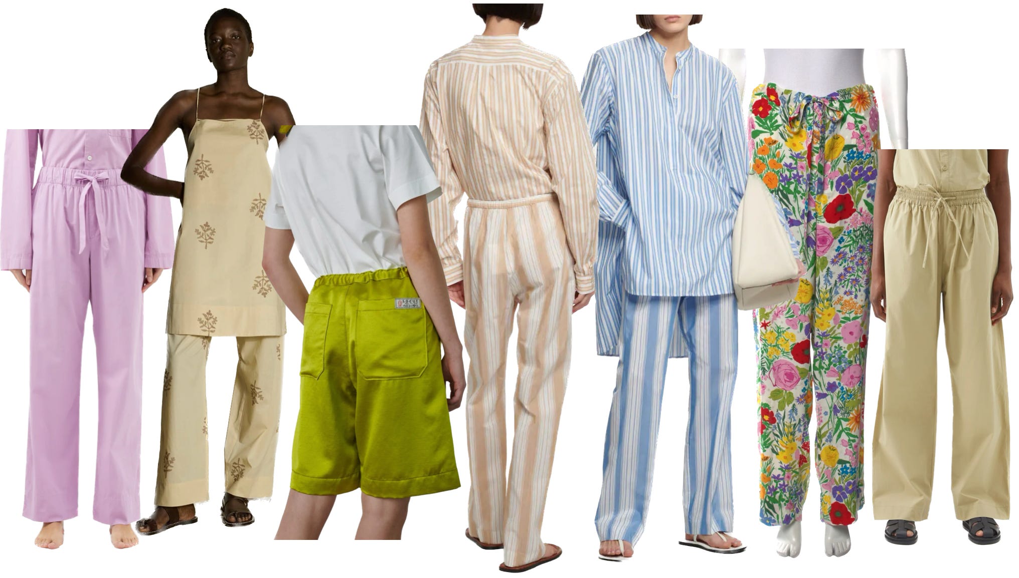 From left: Tekla pants, $140 (they come in stripe for $119 too); Soeur pants, $185 and shorts (from our collab), $165; beige striped Toteme pants, and the blue version too, $420 (they come in solid navy for $305); floral cotton Gucci pants, $545 on TRR; Matteau khaki pants, $110 and here, gratuitously, is this one pair of jersey pants that look like they could do the same thing as this pair from The Row. I just learned how to cut images out of their backgrounds with my iPhone.