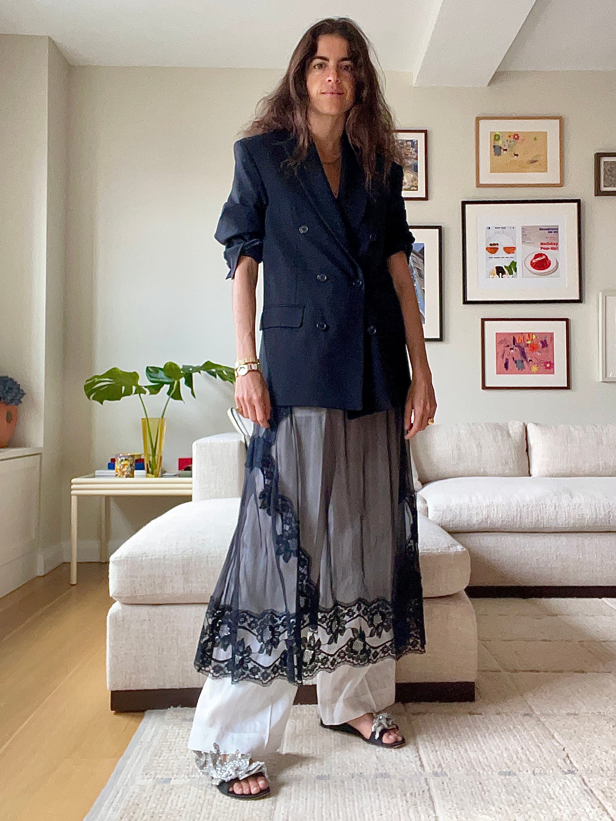 Wardrobe.nyc blazer (single breast version here), Dolce and Gabbana slip, which I got from The Outnet a bunch of years ago and have surprisingly worn every season in some new way (here are somecomps), Balenciaga sandals, but these will do!