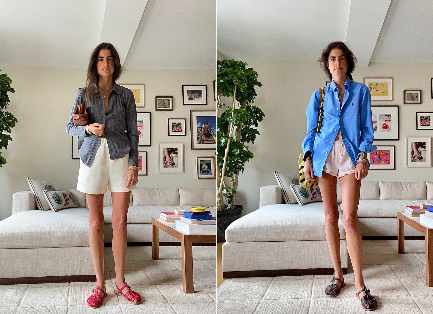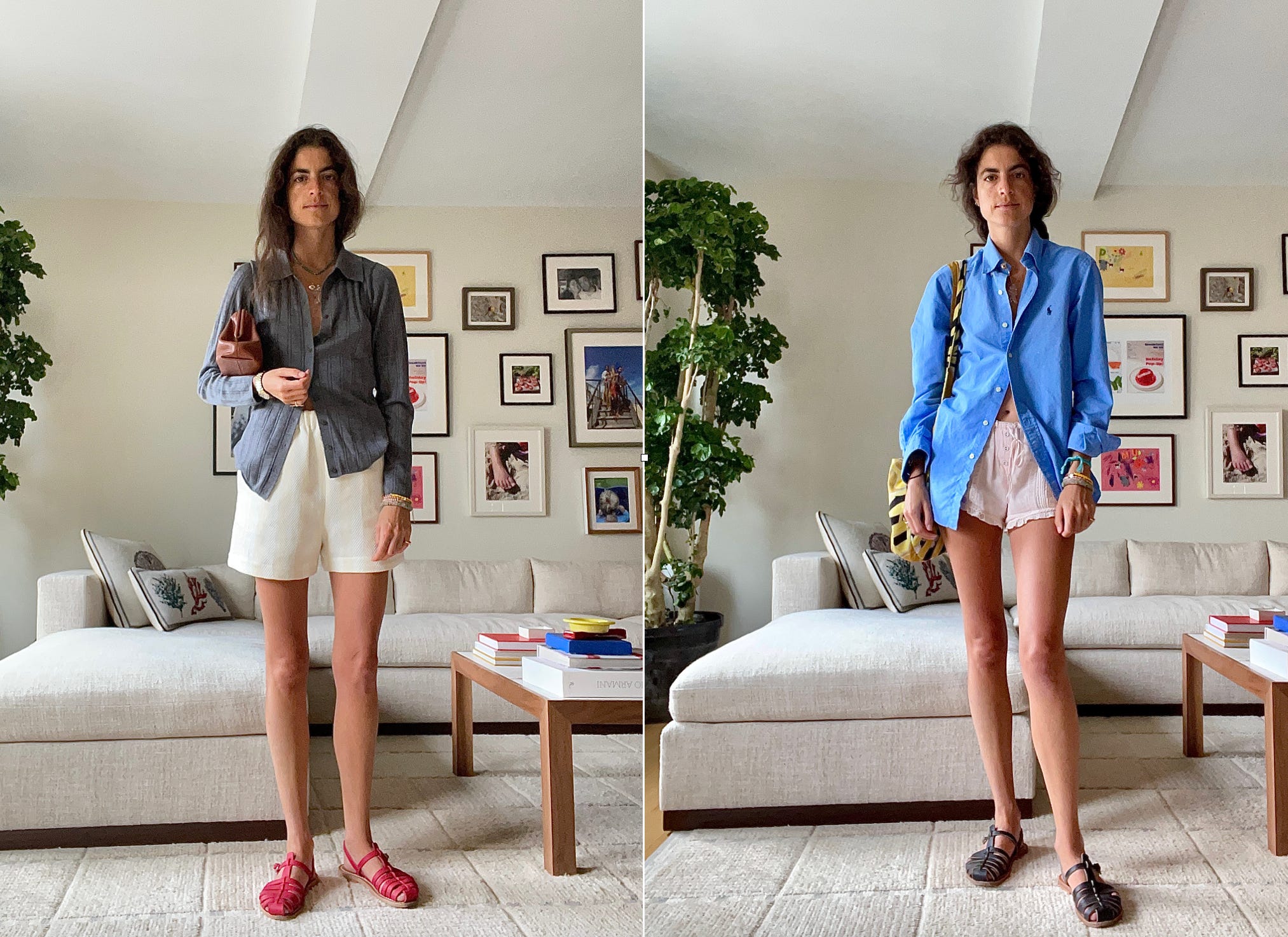 It’s effectively the same outfit, but the collared shirt is poplin instead of knit, the shorts are flimsy and my bag is bigger (full of toddler provisions). It occurred to me that this express lane idea is actually a formula consisting of every tried and true I have worn all summer (in my case, pajama-style shorts, button-down shirts, and fisherman sandals), all in the same outfit.