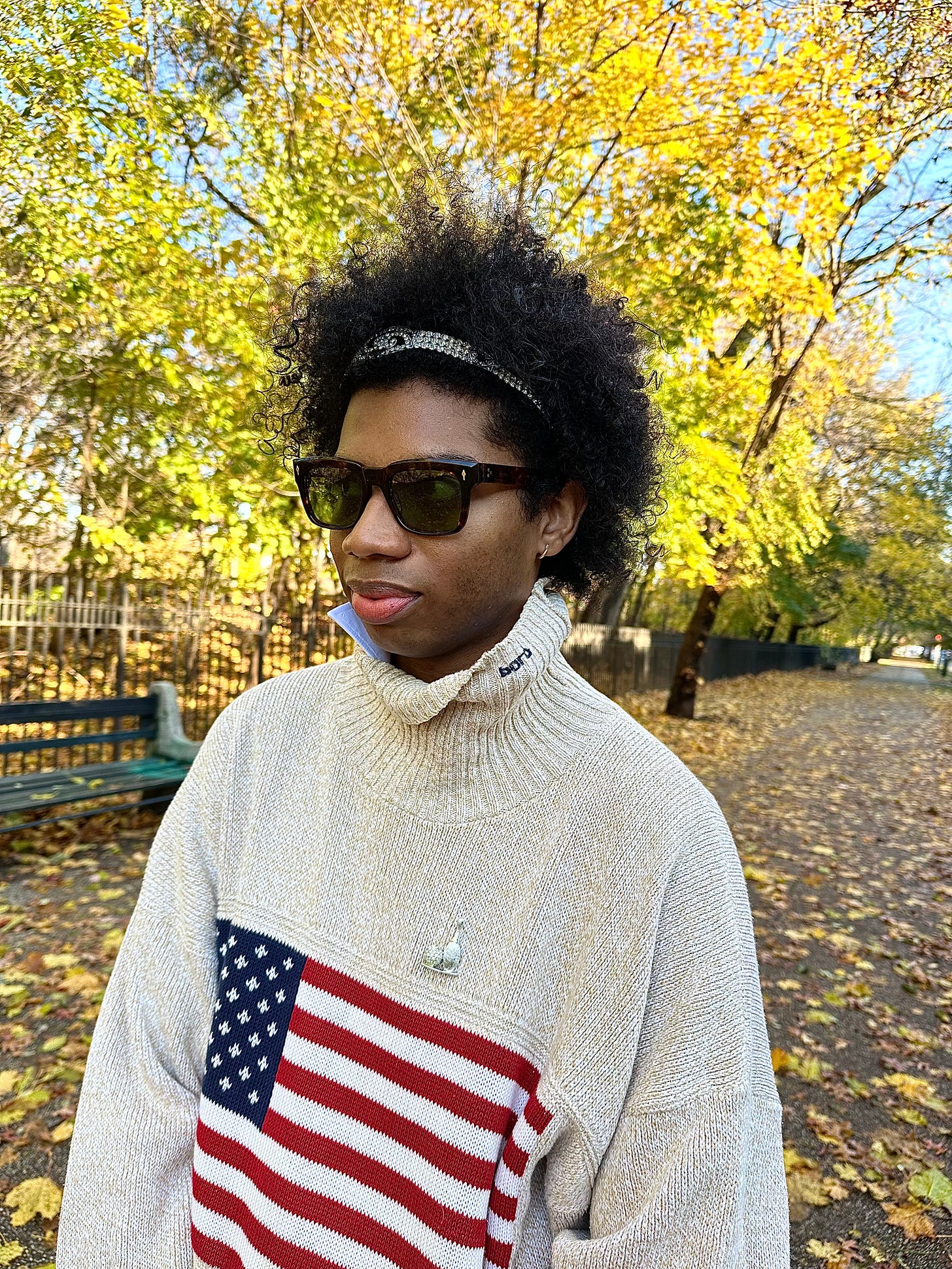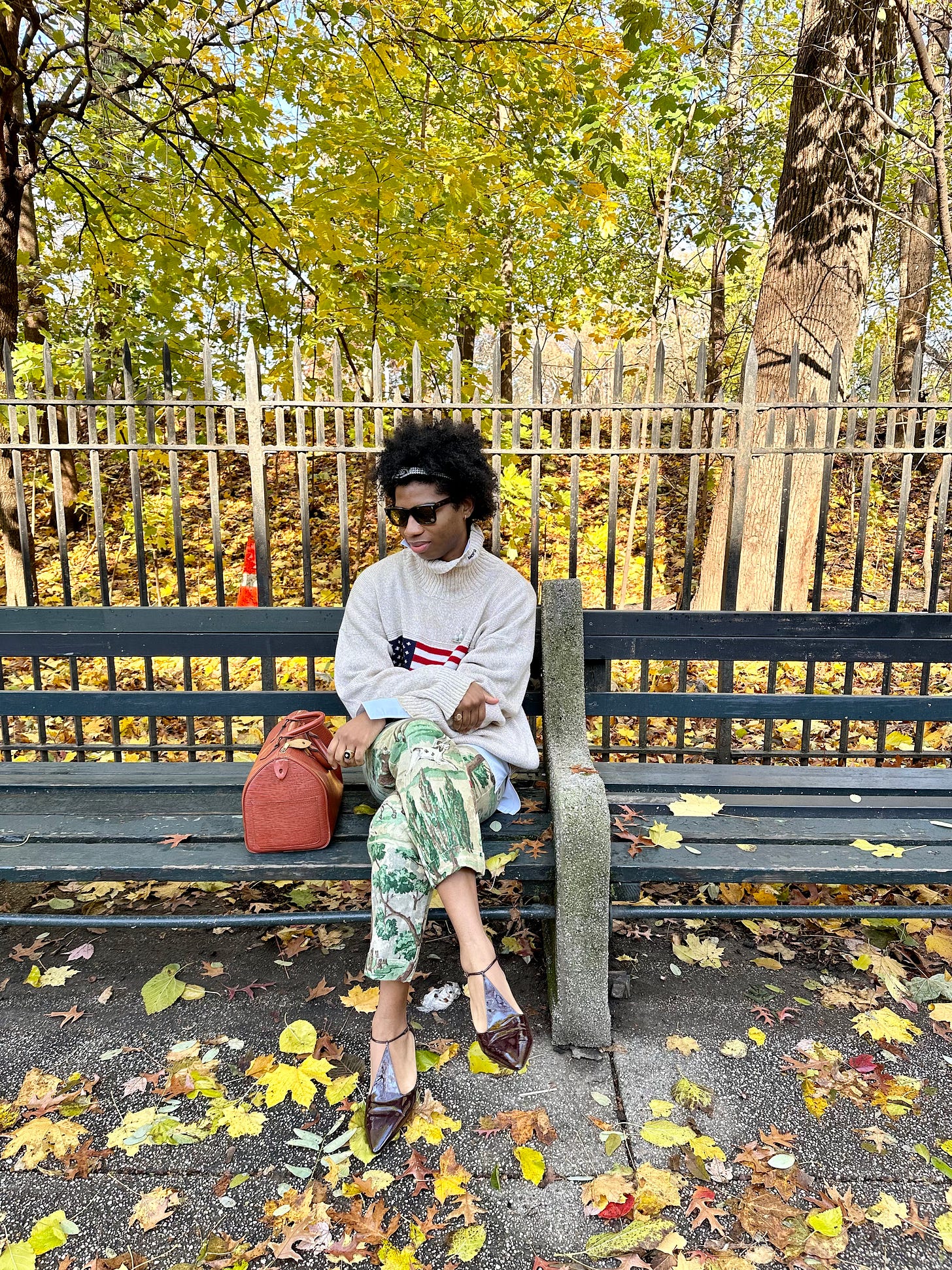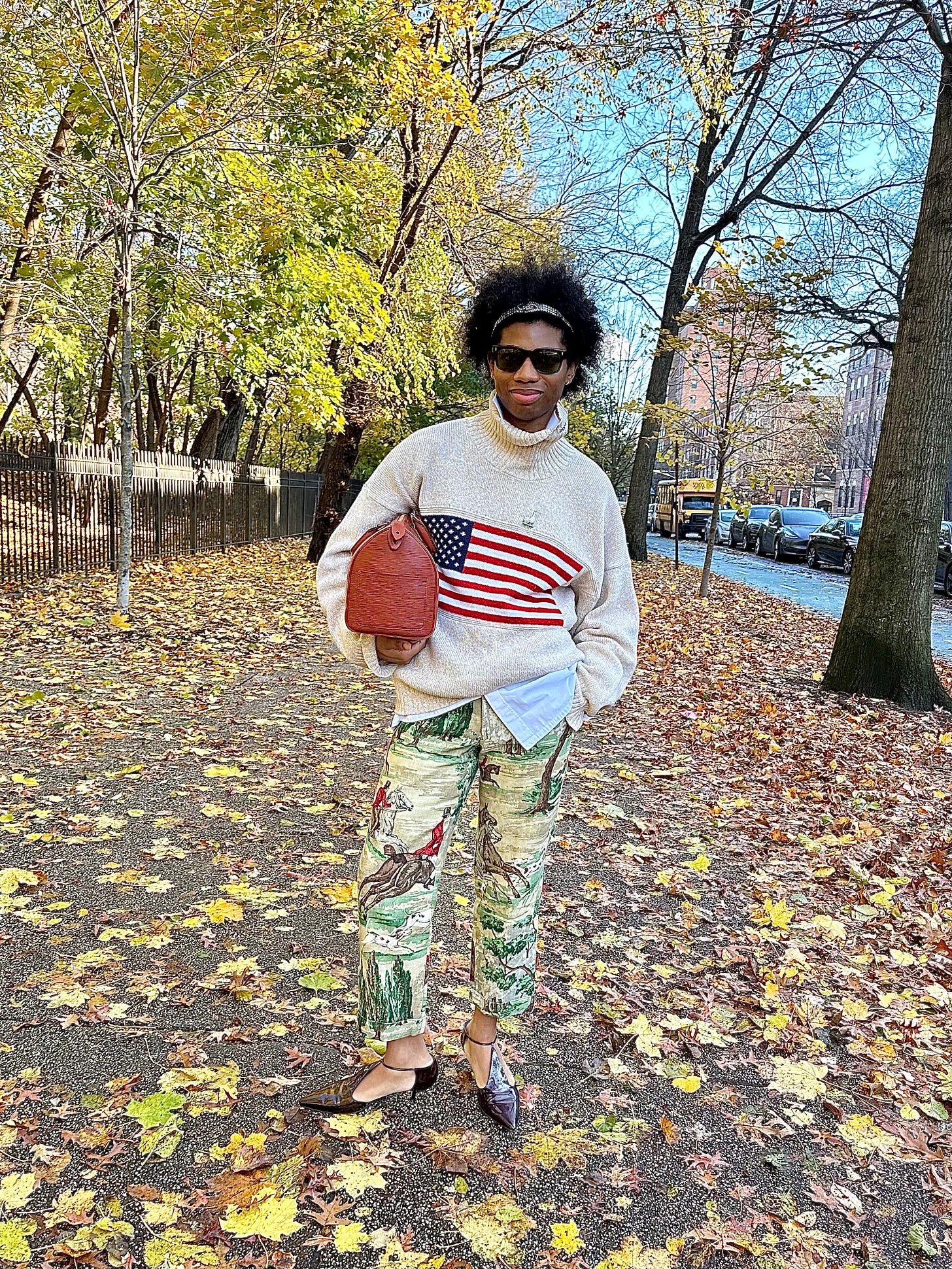 I still want to look dressed up, but also feel comfortable, a bit cozy. You get that with the sweater and pants. I got the sweater on eBay — my search term was “American flag Ralph Lauren turtleneck sweater.” I was walking down Mulberry Street just beforehand and saw these two women fully decked in Ralph (or Ralphism, really — one had on a beaten hat that didn’t have any insignia but looked like it belonged to his world) and at first, I was just amazed at their commitment to encapsulating the brand, then I did a double take, noticed the sweater and was like oooh, that’s really nice, so I went home and launched my search.
