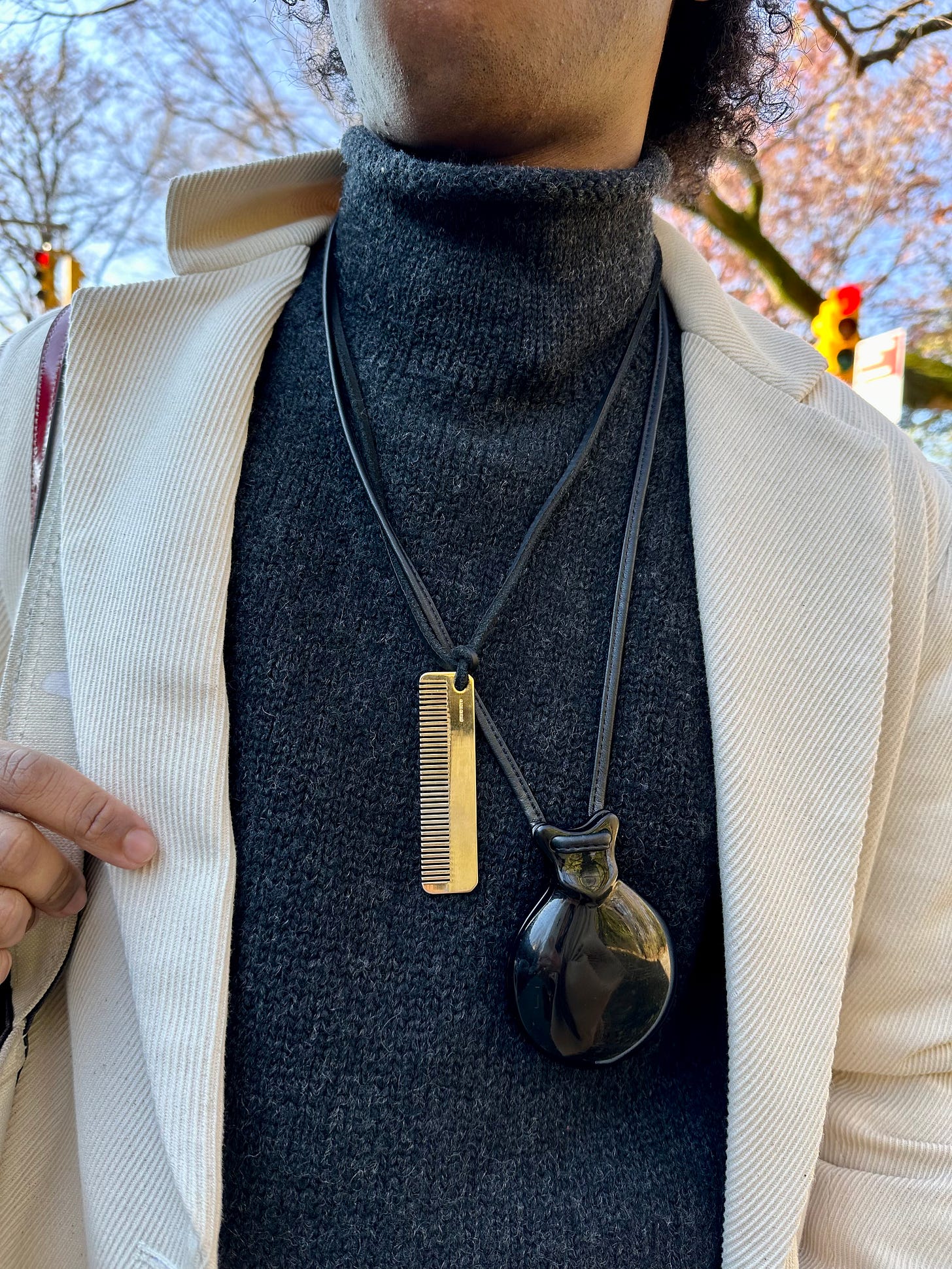 The compact mirror necklace is Lemaire — I got it this summer after Tommy Ton showed it to me. The gold comb is Judith Lieber — I found it on The Real Real and strung a string from the shoe cobbler through it.