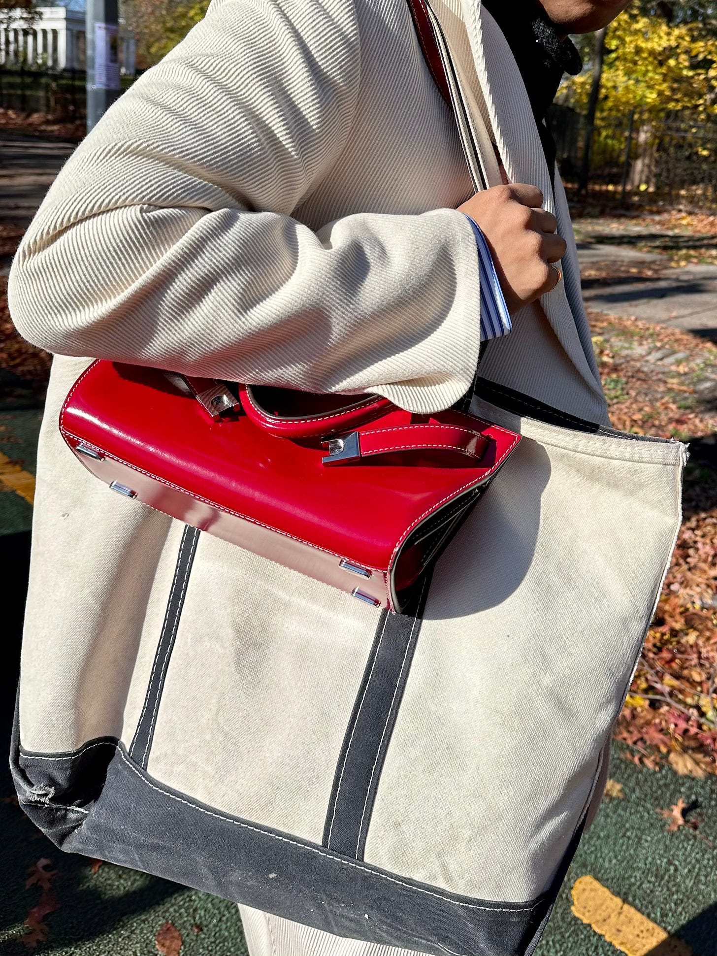 I’m wearing my L.L. Bean tote. I got it about two years ago directly from L.L. Bean. I originally had this one, but the straps do not fit over a coat. Then the bag slung over is Tory Burch — I got it at the beginning of Tory Burch-issance.
