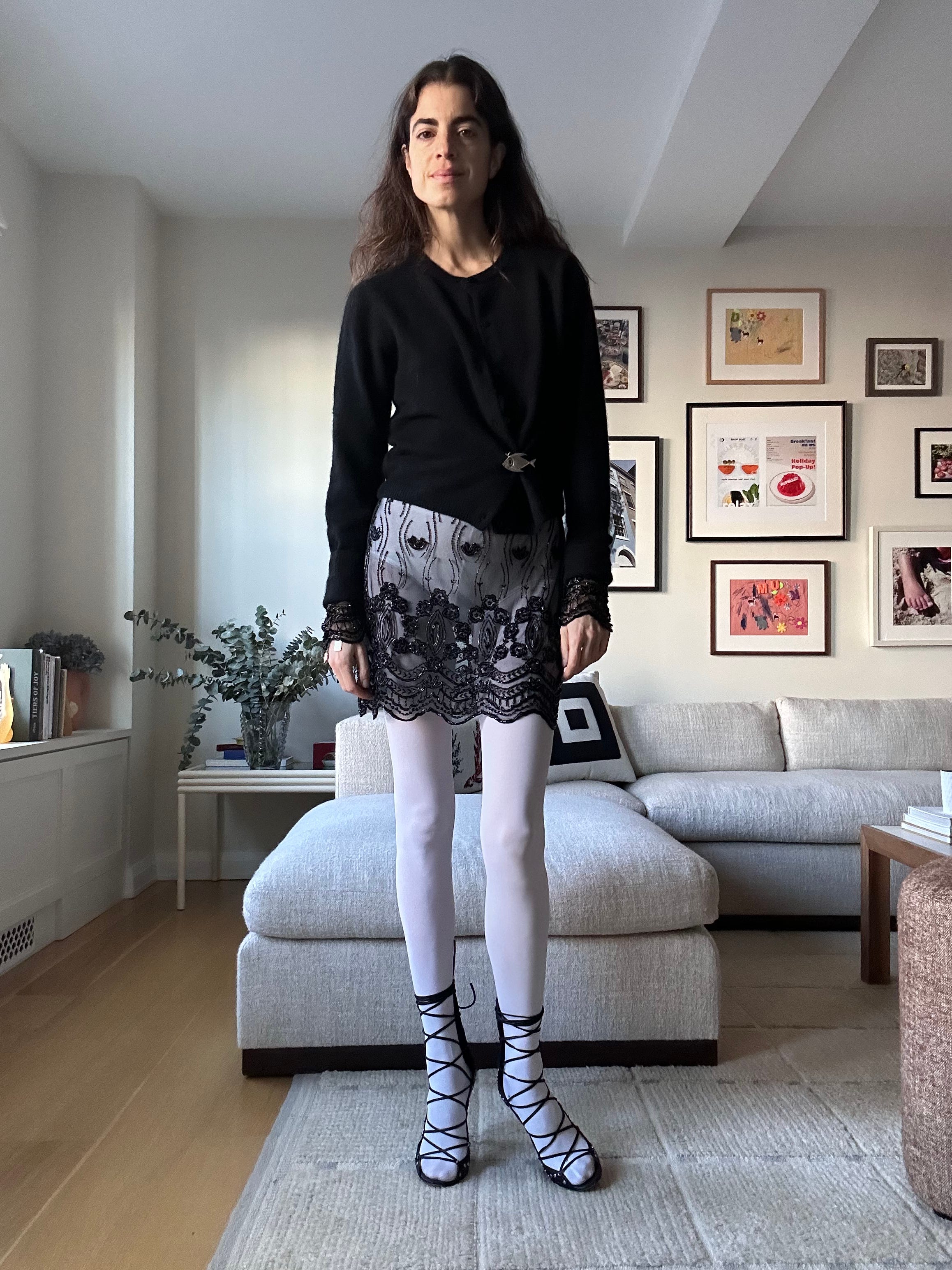 Sliver of white, ambitious textures (tights, patent leather bag), intentional belt buckle sheen (styled over a cardigan I intentionally peplumed), gold hardware on shoes! But something sheer to wear over your undies totally works too. Remember this from the holiday dressing extravaganza?