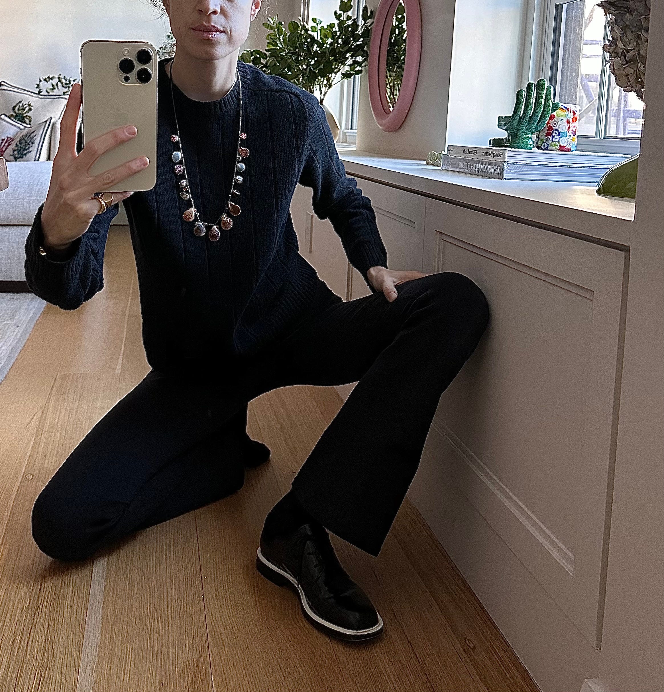 The right jewelry is character-changing too — and doesn’t have to be as literal as a pearl or gold or silver necklace. You can defy seasonal odds by styling an unlikely, summer friendly piece over a plain knit like the above.