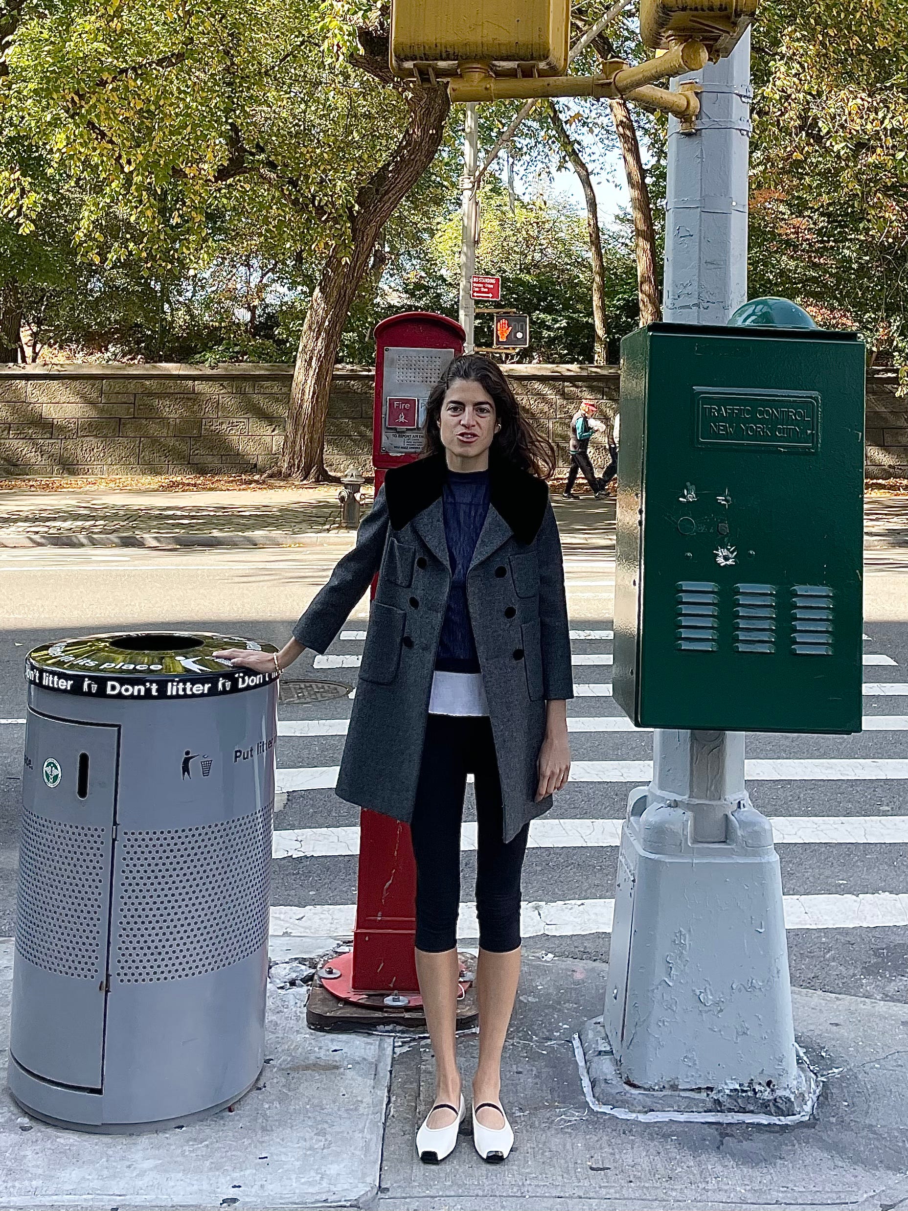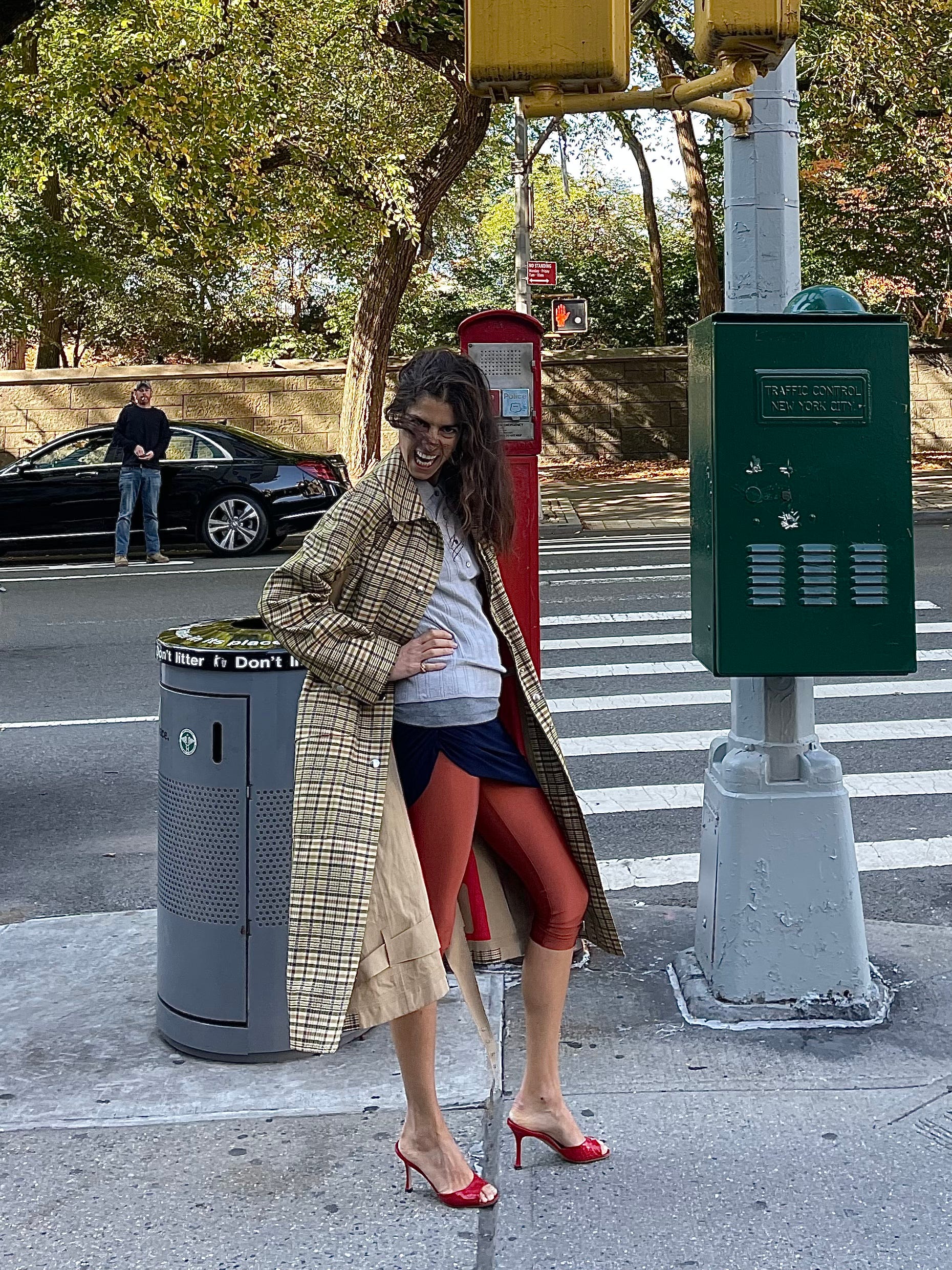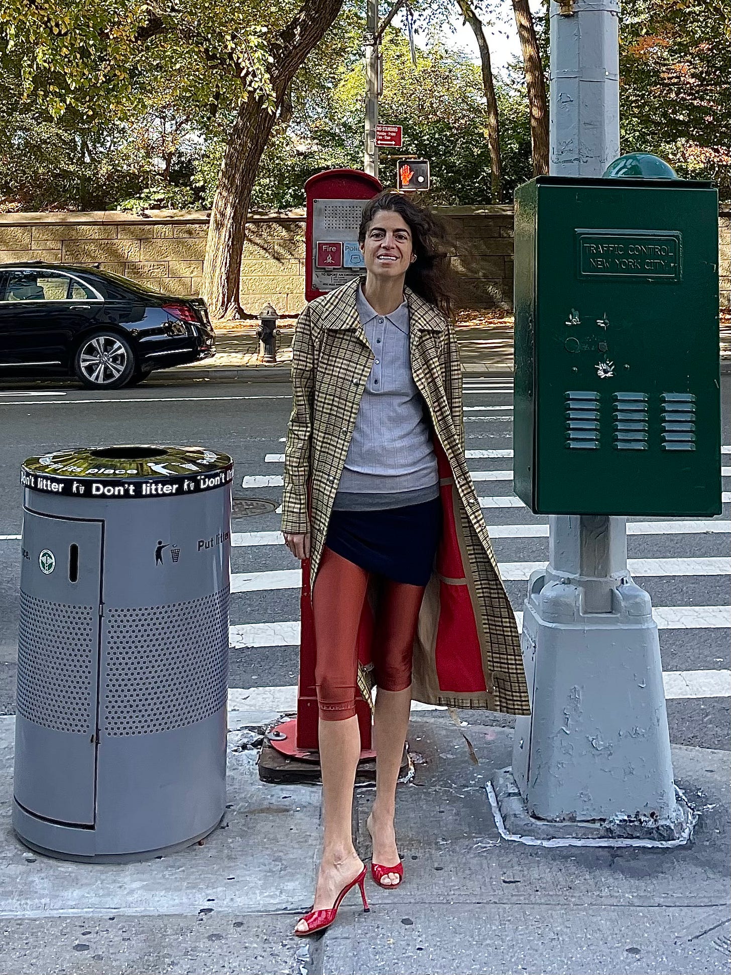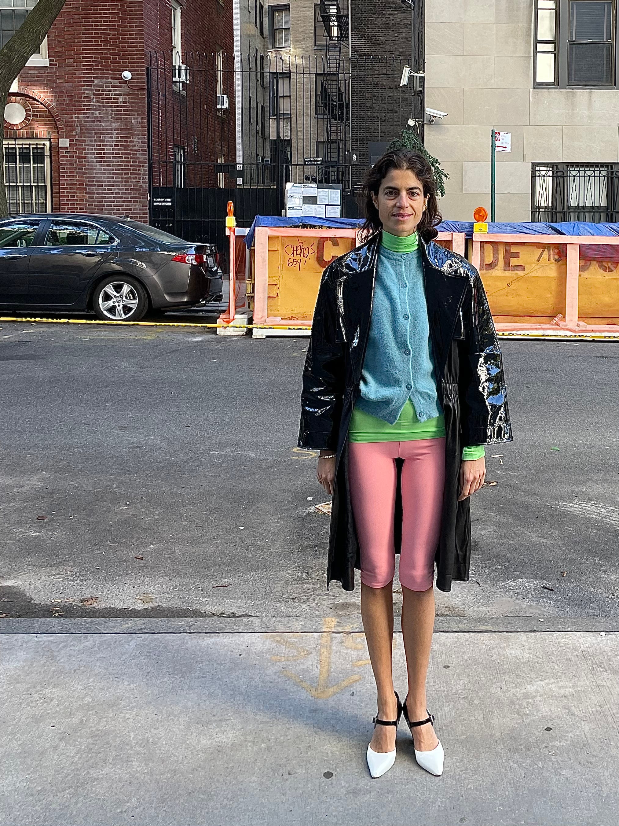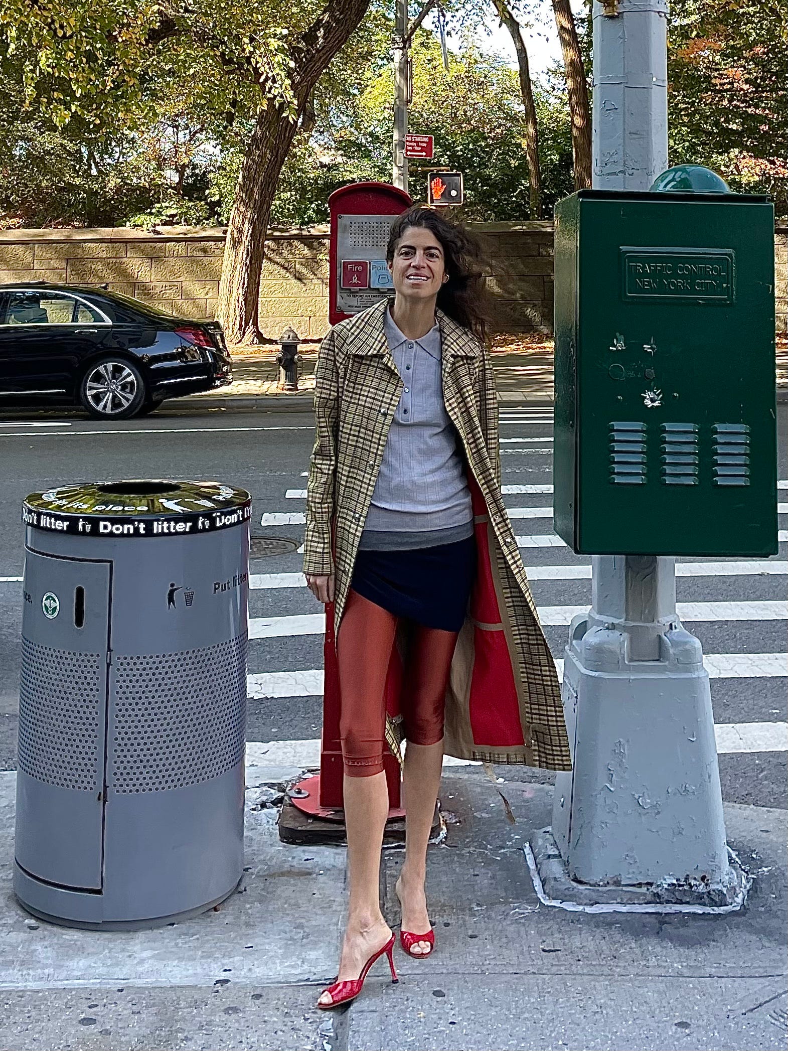 Recreated the look using an Old Celine coat, a tight grey tank (mine’s Toteme, but any permutation that is longer than the shirt you layer over should work), a Venstore polo, red mules (from The Real Real, by Manolo Blahnik; they’re a particularly prideful score from a few years ago in that they came unworn and cost me $80) and a pair of cropped leggings from a Turkish brand called Cult Form. The skirt is a Norma Kamali bathing suit bottom that I hard recommended over the summer as an unconventional but very useful skirt option. Now I mean it even more. But I think any bodycon mini skirt (or dress!) or even just crazy long tank top should work.
