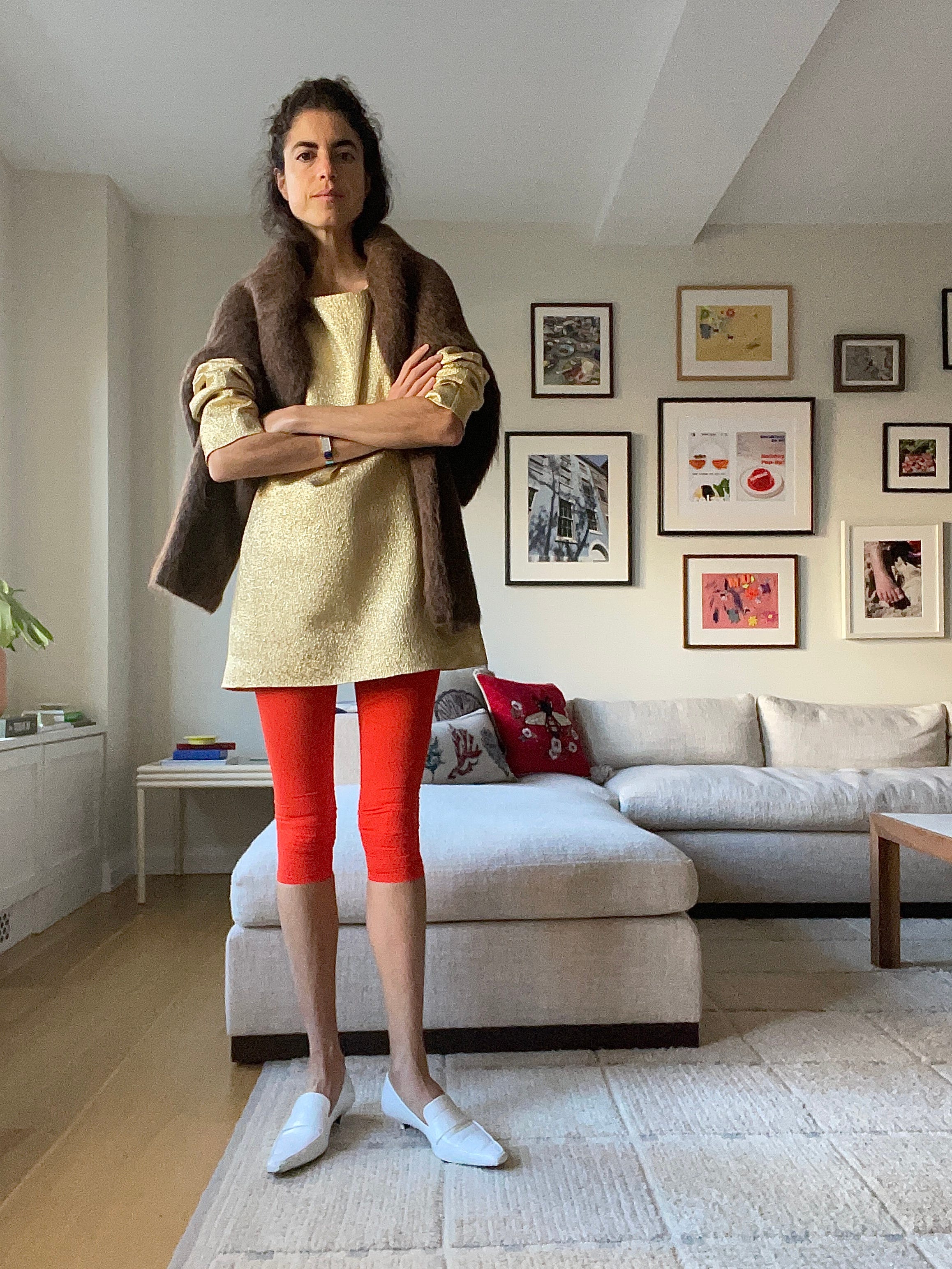You’ll notice I went completely off script — I wanted to follow the color scheme presented by the first Tory look shown in this post and paired the gold Michael Kors dress that keeps on giving with full length red leggings that I rolled up into a knee cap crop, with a brown Toteme sweater over my shoulders and these white loafers from last year.