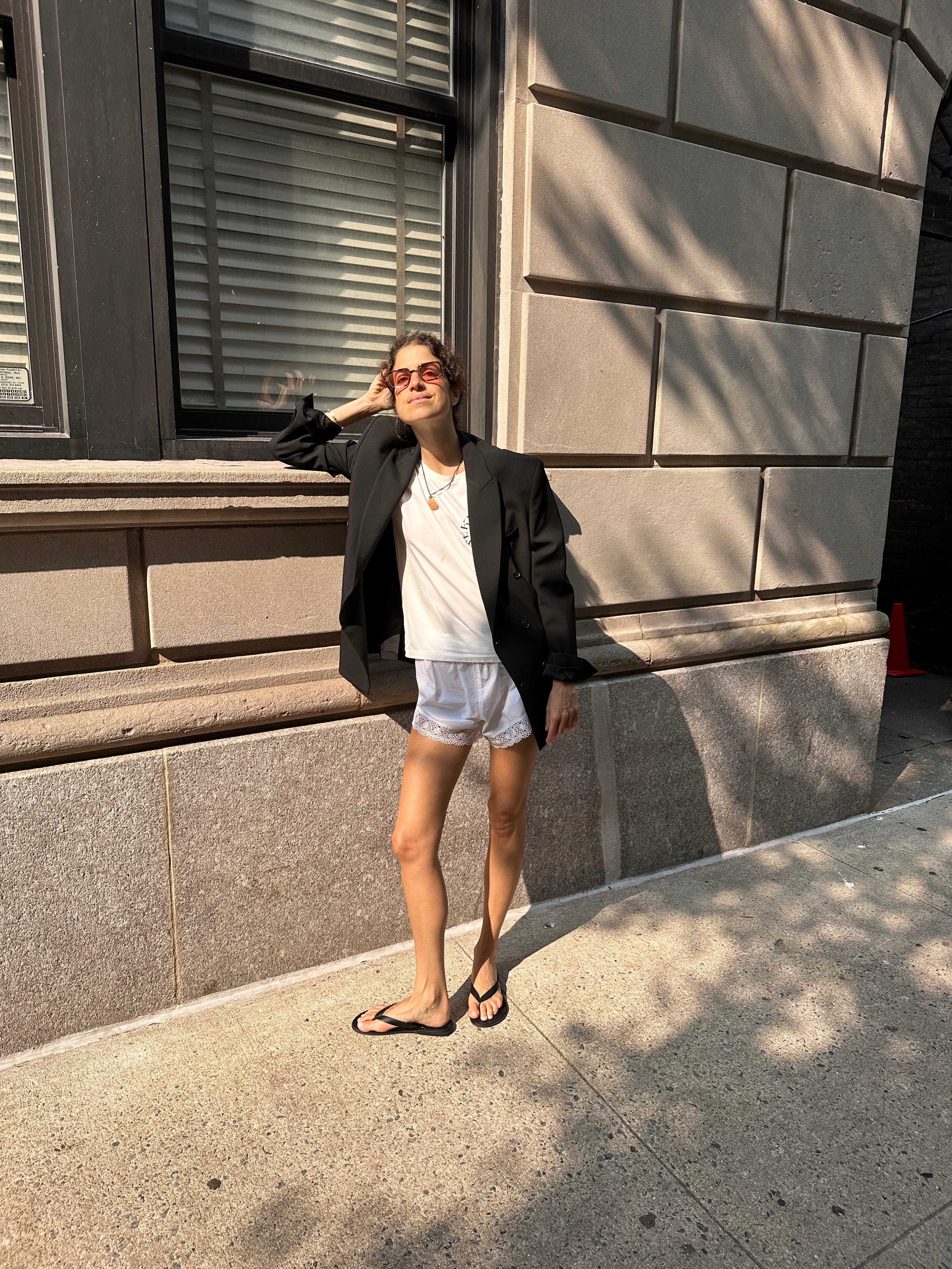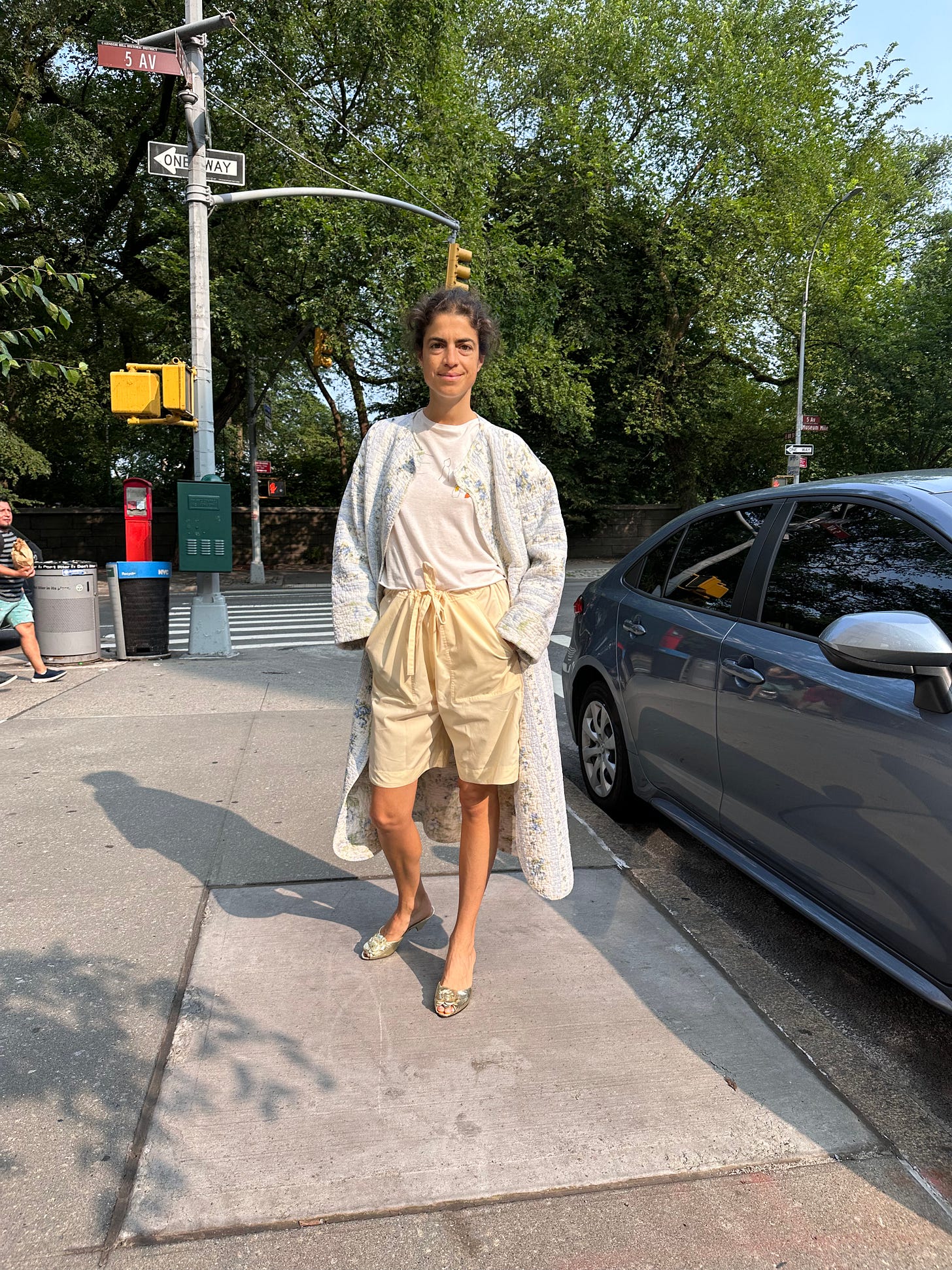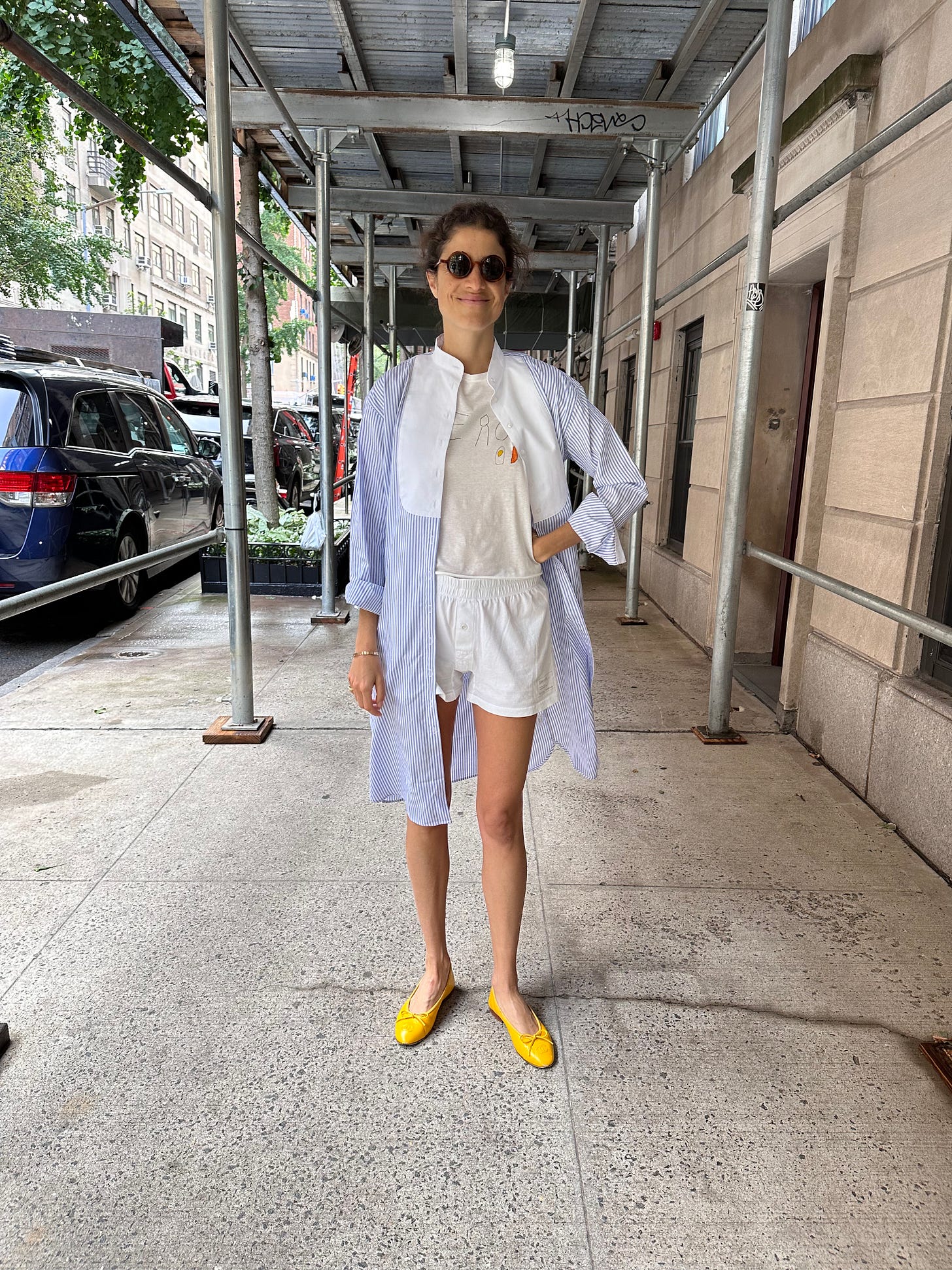 Dressing for this occasion became an escapade unto itself and I realized that much of the content of my summer wardrobe could fit into the bracket of in-between: beach shorts that looked like silk or cotton boxers, elastic waist pants, worn-out t-shirts, almost all the button downs (especially those that were striped); cotton nightgowns or slip dresses. All the clothes were already there — they just had not yet been called a trend.
