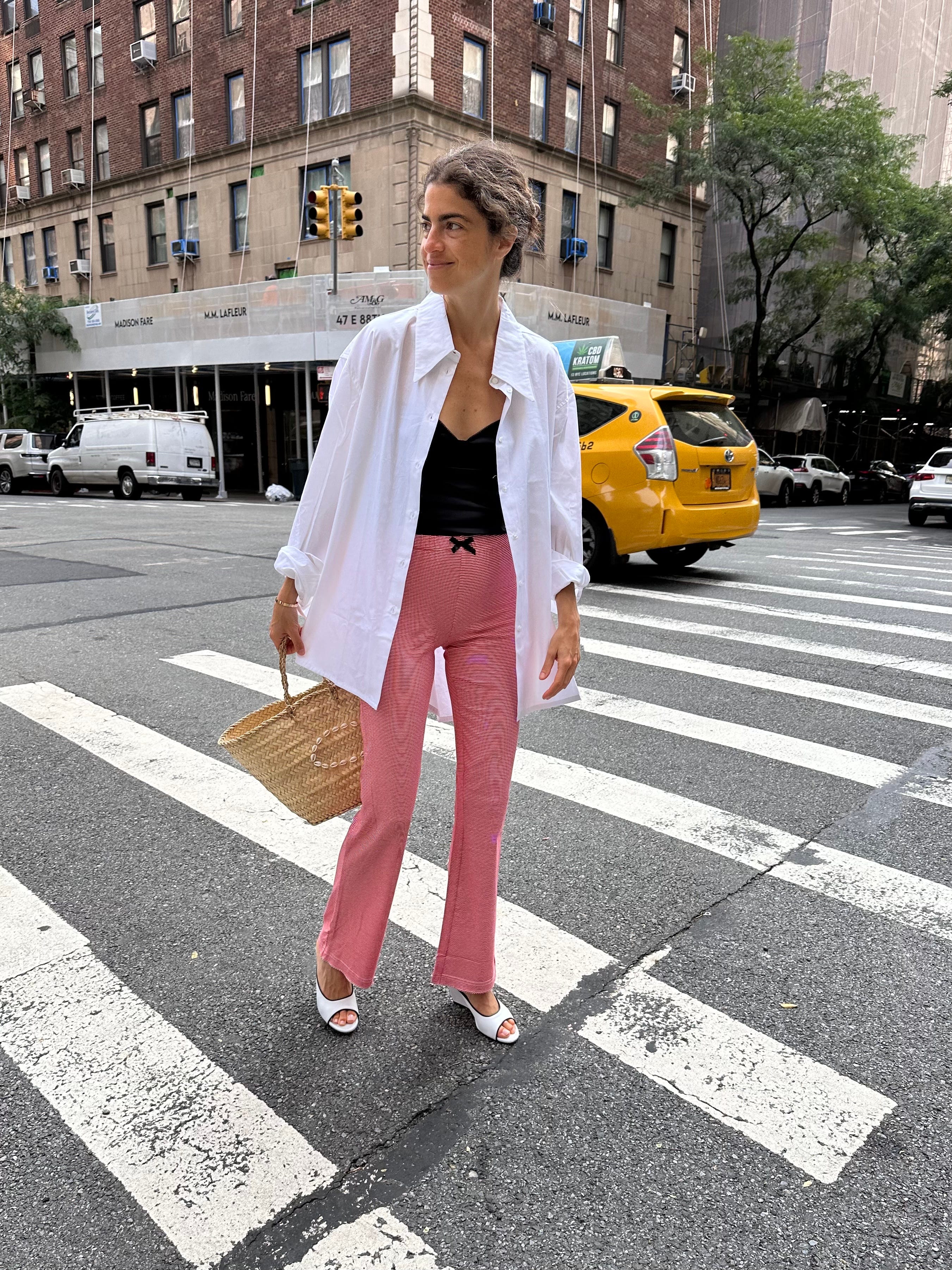 The shorts are best served with a boxy/flimsy t-shirt and closed-foot shoes — think loafers, but they can get as creative as these/these. Both the shorts or elastic waist pants (like the ones I styled into a million outfits here) would work like this or with a button-down shirt worn as a shacket with a “going out” top like this: