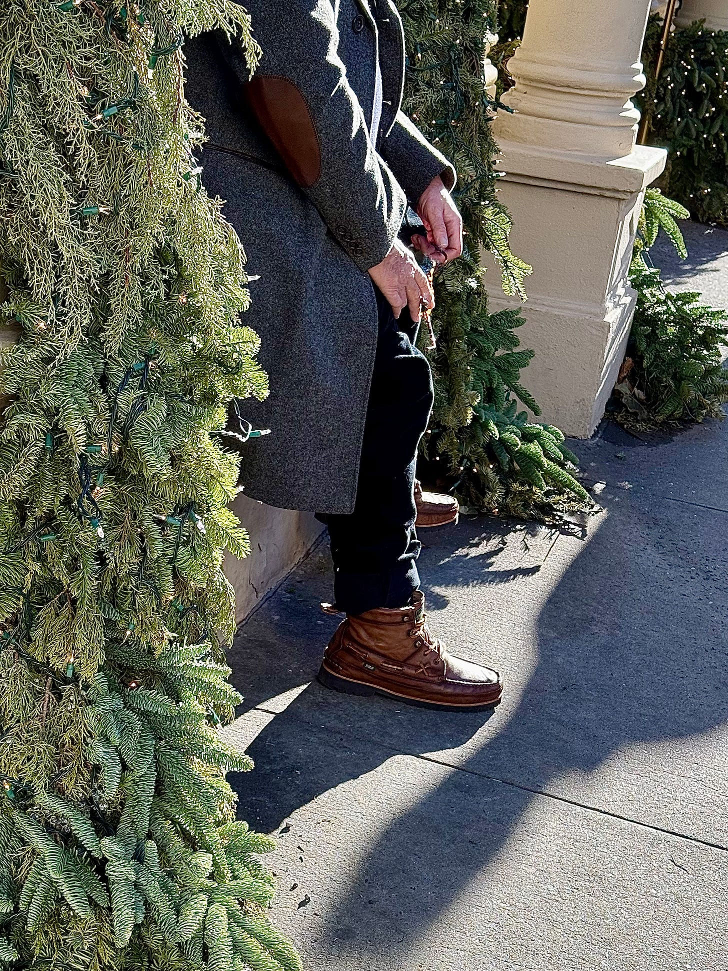 The leather patches on the elbows of one tweed coat, coordinated with a pair of all-weather boots and his skinny cigar, smoke emanating outwards.