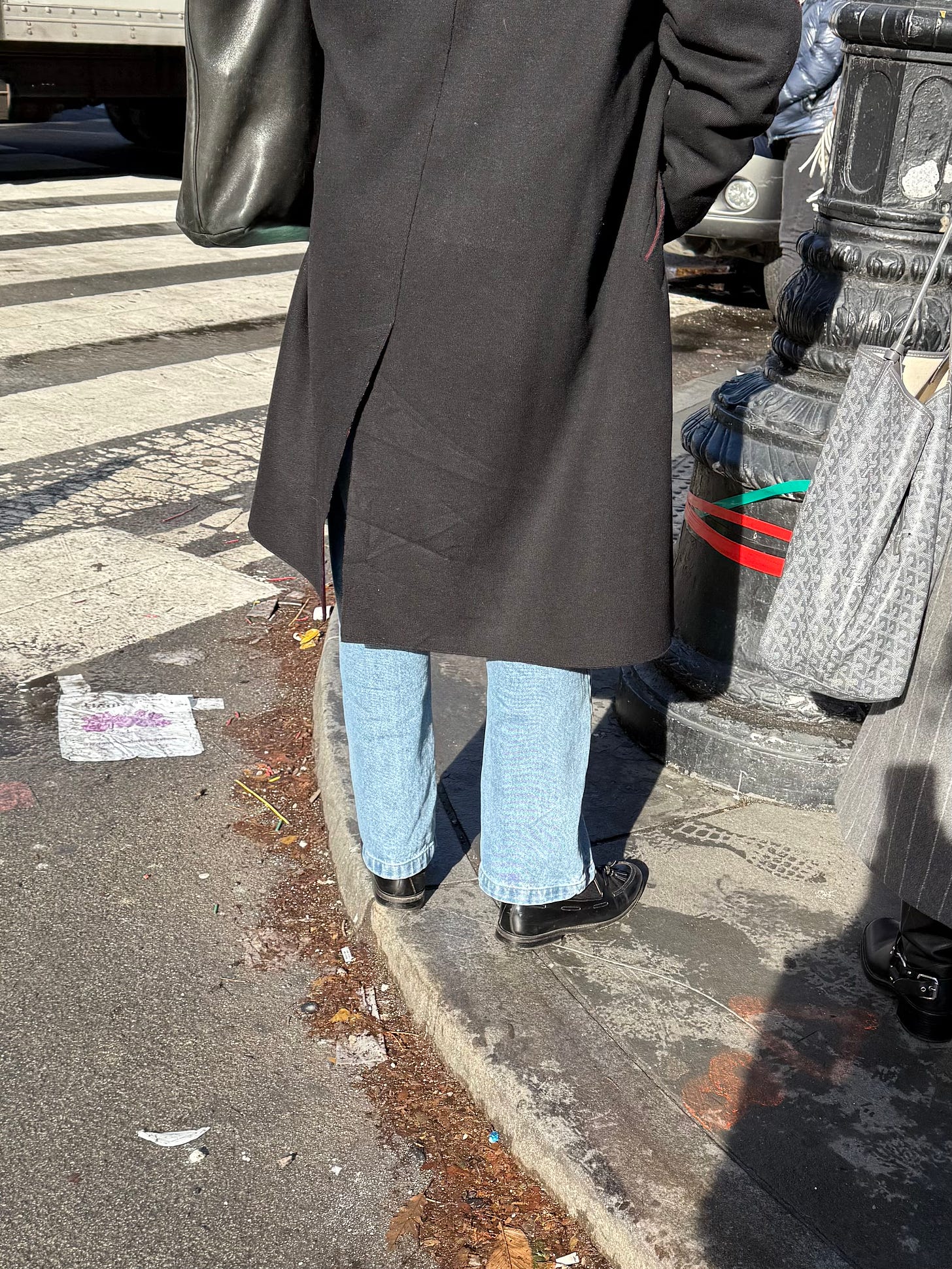 How jeans and a mid-length coat hit their wearer in precisely the right places.