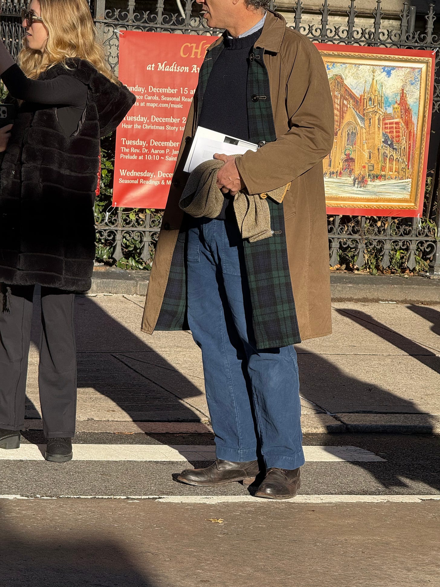 And I loved how the plaid inner of a single breast trench coat looked flipped out over worn blue pants.