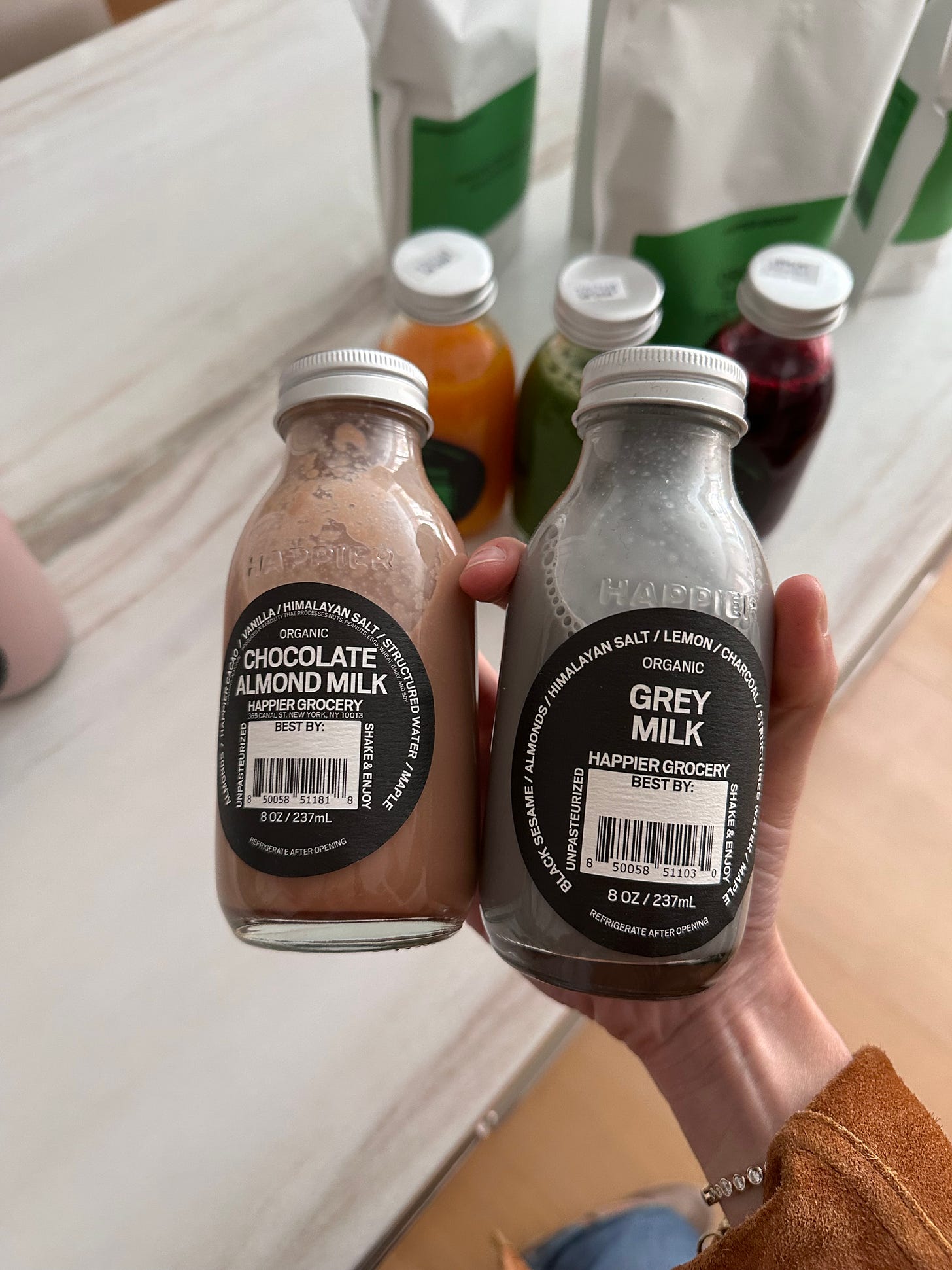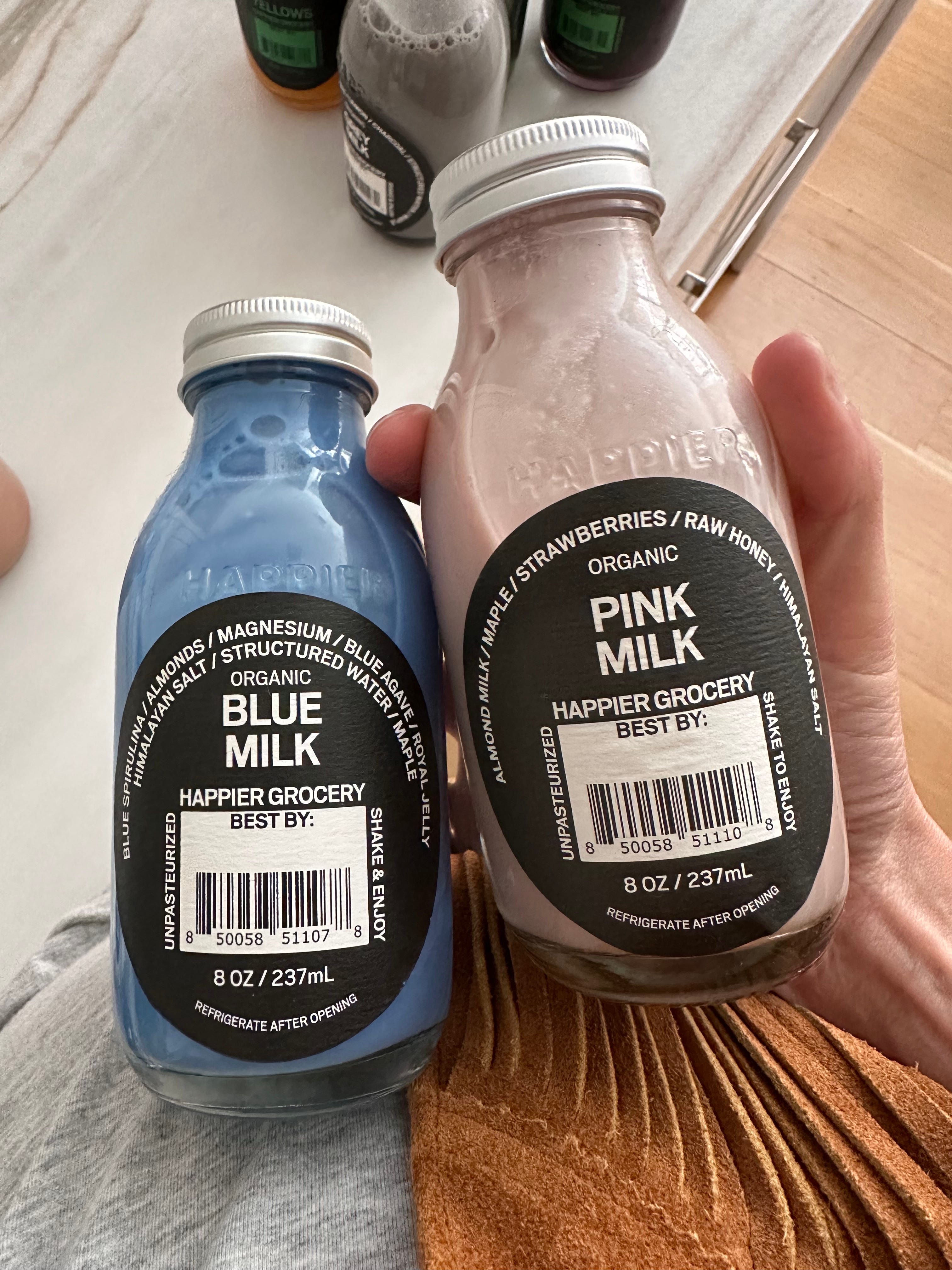 The rainbow milks are a good alt to an afternoon latte if you usually have one because you want something sweet but can do without the caffeine. They’re also fun to look at/taste good in a bowl of cereal. My favorite of the flavors is a tie between the pink milk (don’t mix with cereal, too sweet) and the grey milk (sesame-yo-licious; great with granola).