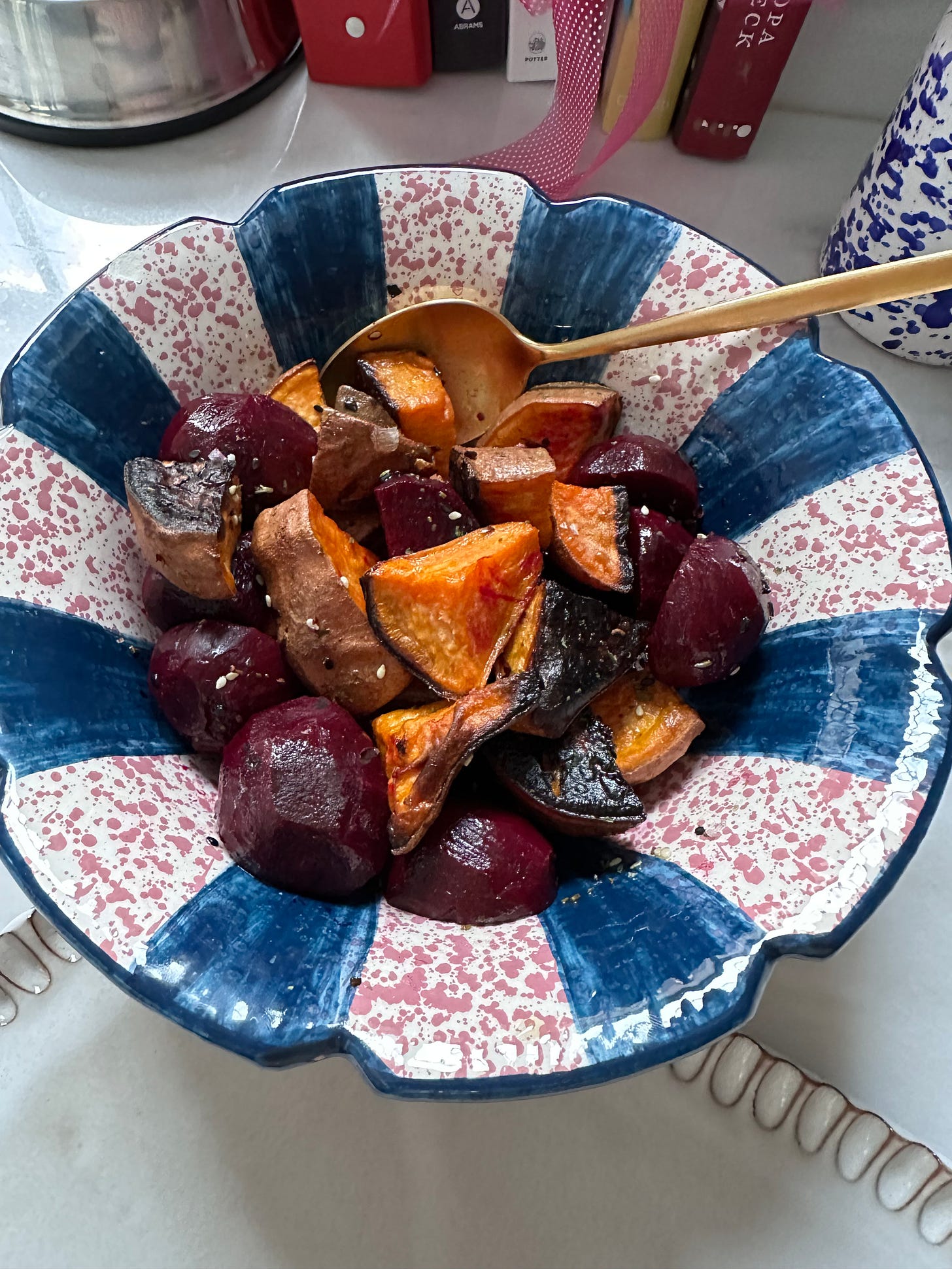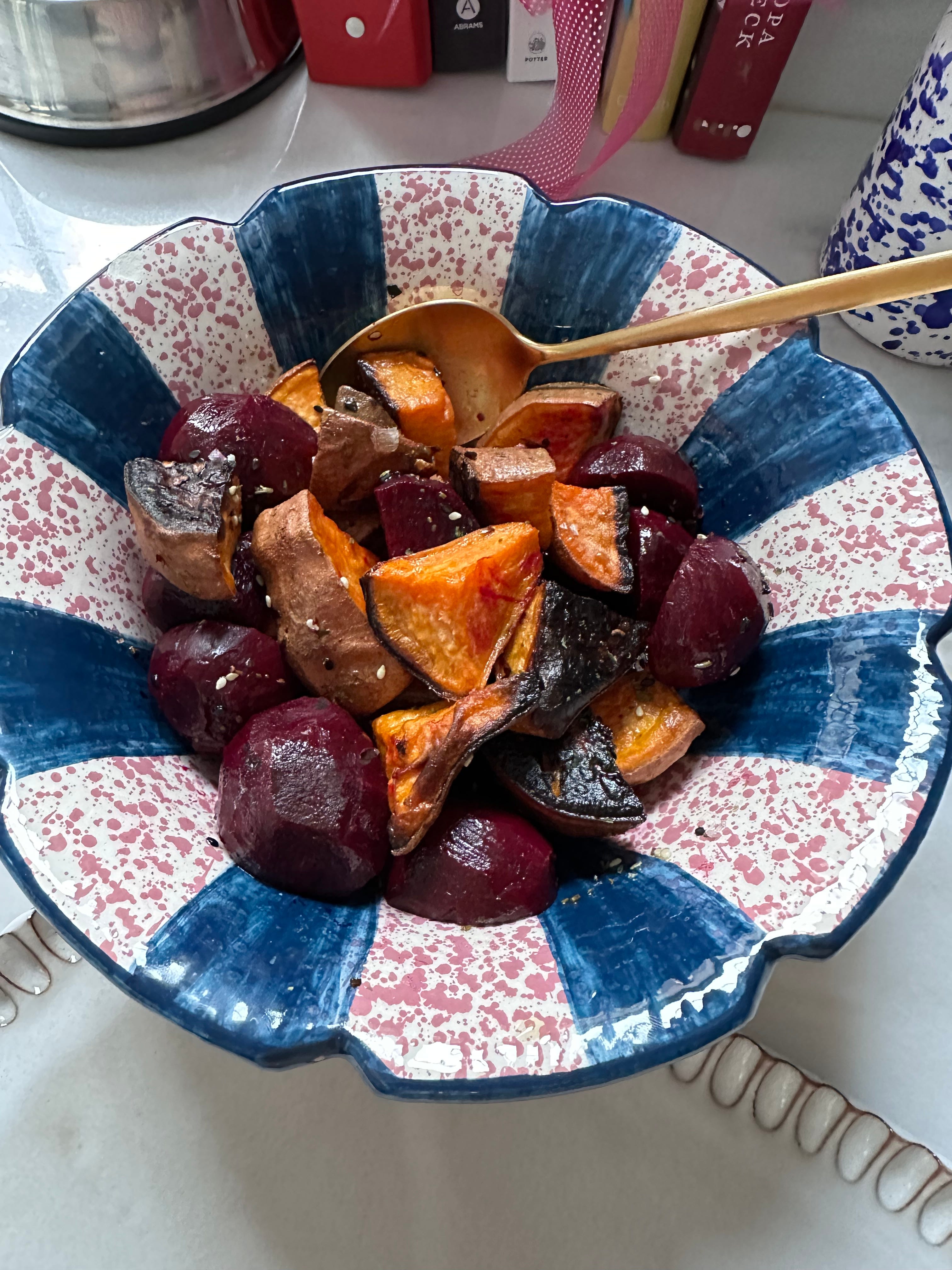 Also served a medley of boiled beets and roasted sweet potato in a dressing of mustard, oil, salt and chili flakes that night. What made all the difference though was topping it off with pumpkin, fennel, caraway and sesame seeds.