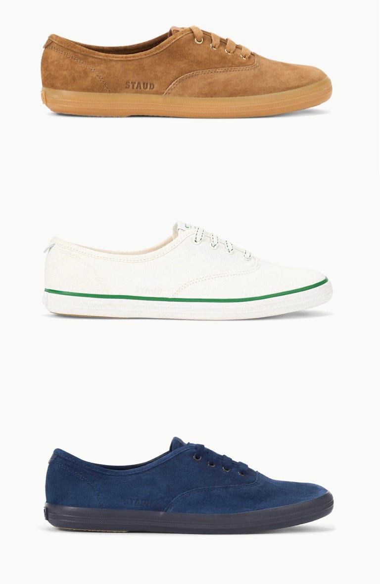 Staud and Keds launched a collaboration on Friday of the classic lace up sneakers. In this collab, they’re rendered in navy or camel suede. There are two canvas styles too — one is multi color and the other is white with a green stripe across the top of the rubber part of the shoe. A good way to save yourself the urge towards these! I’d go for the navy suede. Love that the sole is black.
