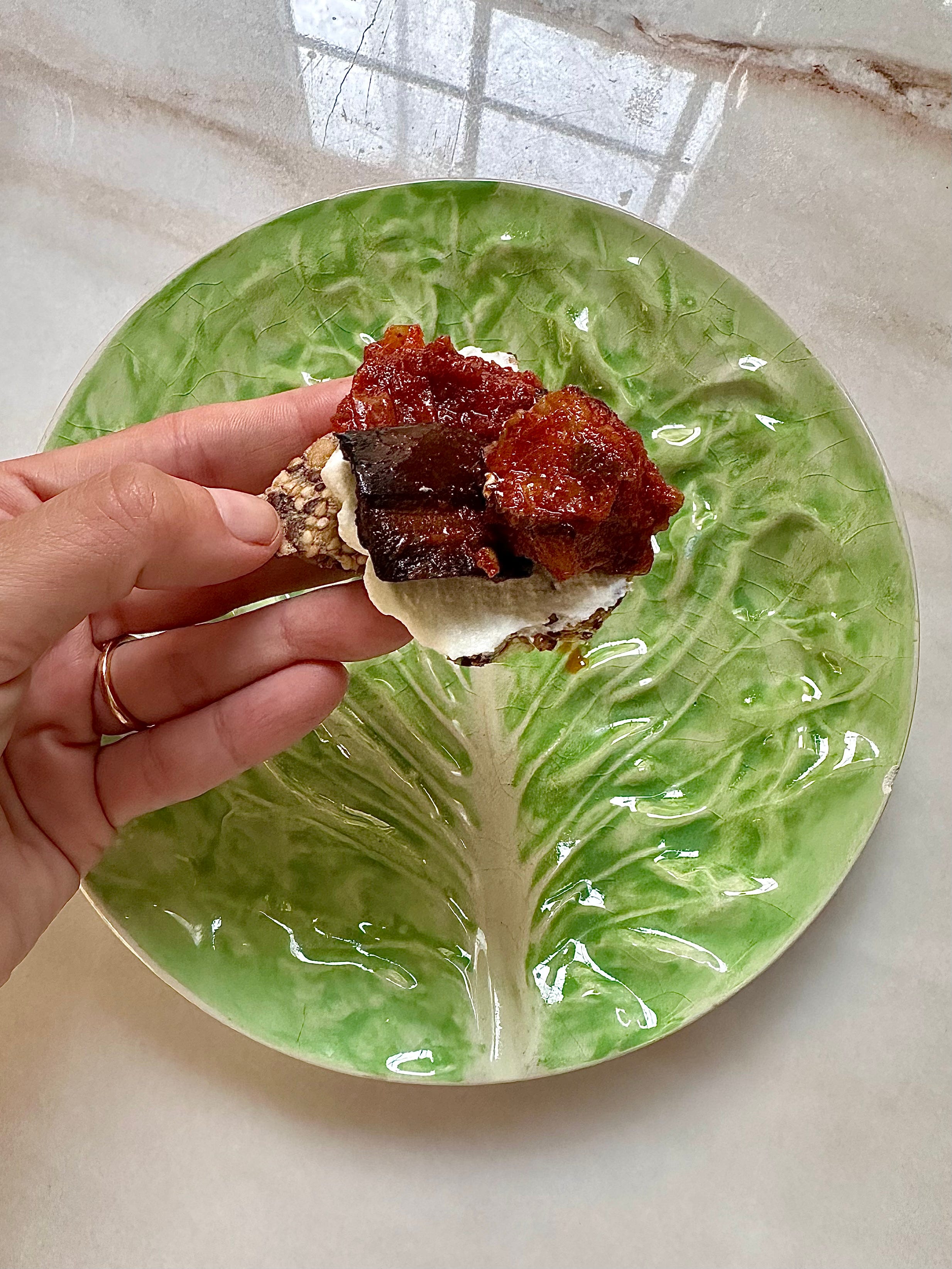 Labne smeared on a seed cracker, with roasted eggplant on top. This was one way to create a little pre-dinner thrill on Passover.