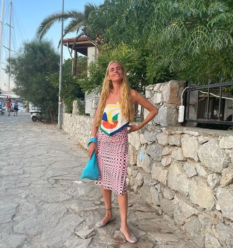 All winter I saw this woman walk up and down Maidson Avenue in the upper 80’s wearing a long-ass fur coat that swung out at the hem with leggings underneath and very chunky socks (Elder Statesmen style). She had on a red baseball cap (no mention of making anything great again, just reinforcing her allegiance to Martha’s Vineyard) and khaki boat shoes. The way to wear them (the boat shoes) when it’s warm is to acquaint yourself with a European seaside sensibility — think Ibiza, St. Barths. They’re too literal the American way. I’ll break this down sometime soon, but in the mean good thought starters exist as mere reflections of her personality on Blanca Miro’s Instagram page.