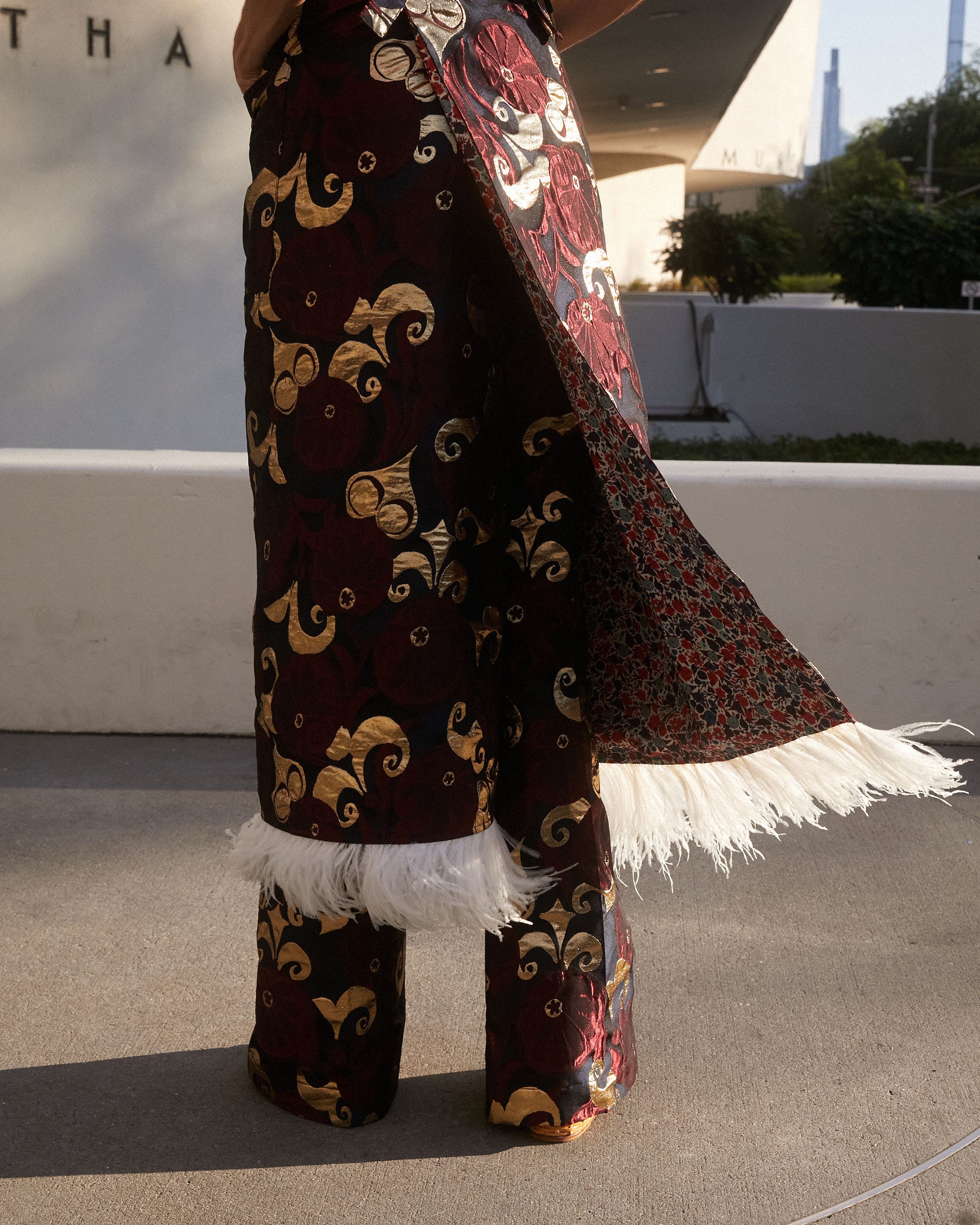 I told JJ (as in, the Jx2 that is in the brand name) that she should make apron dresses for the rest of us. To this, she answered, “Why don’t we do it as a collaboration?” which prompted my responding that if we were to do that, we should make them brocade with a dramatic trim. And add matching pants. Now ~27 months later,