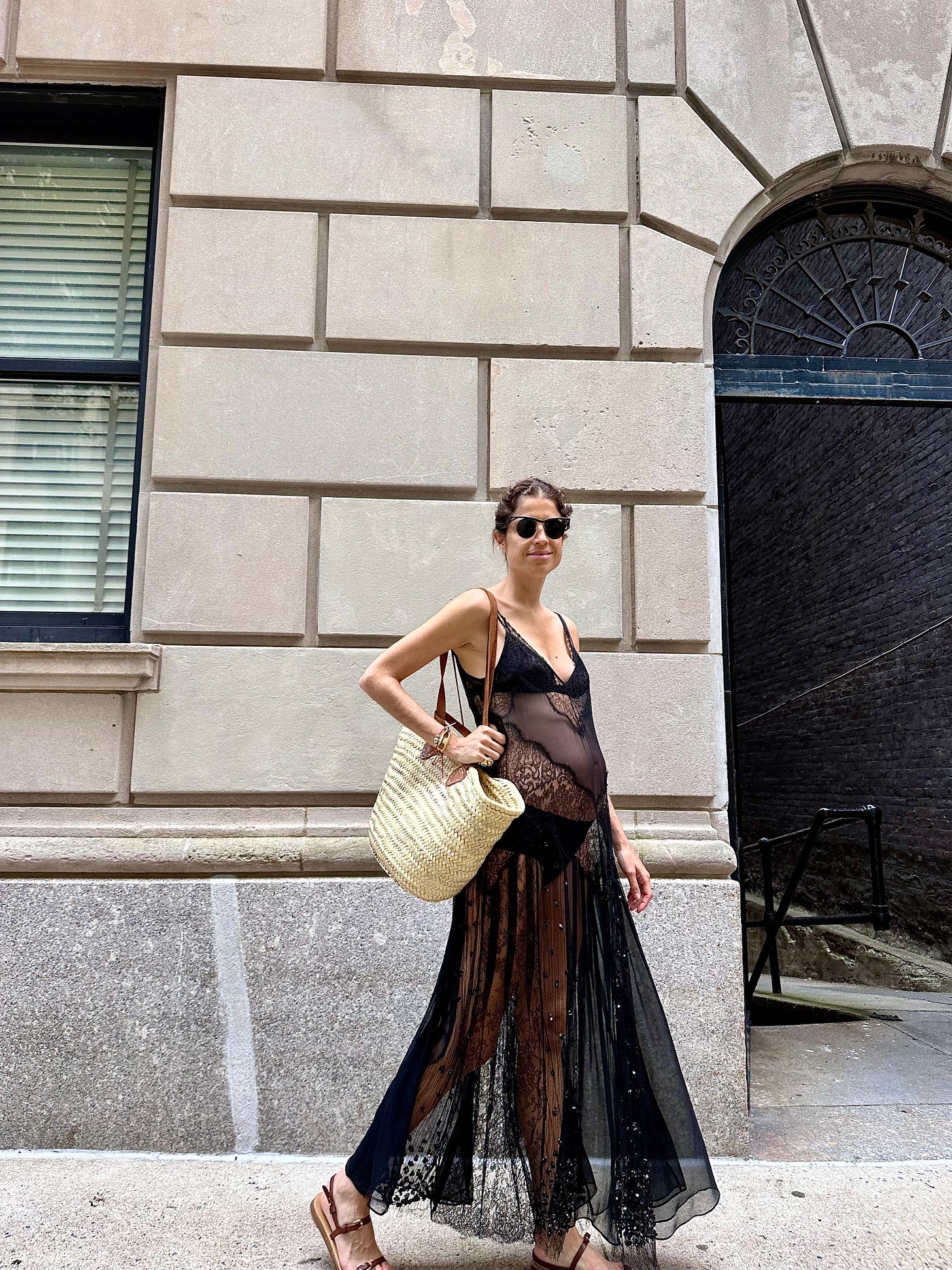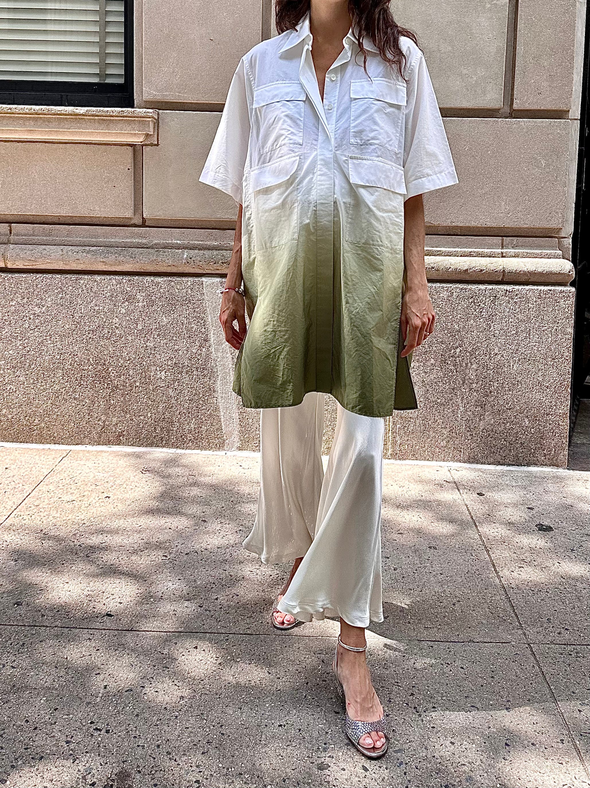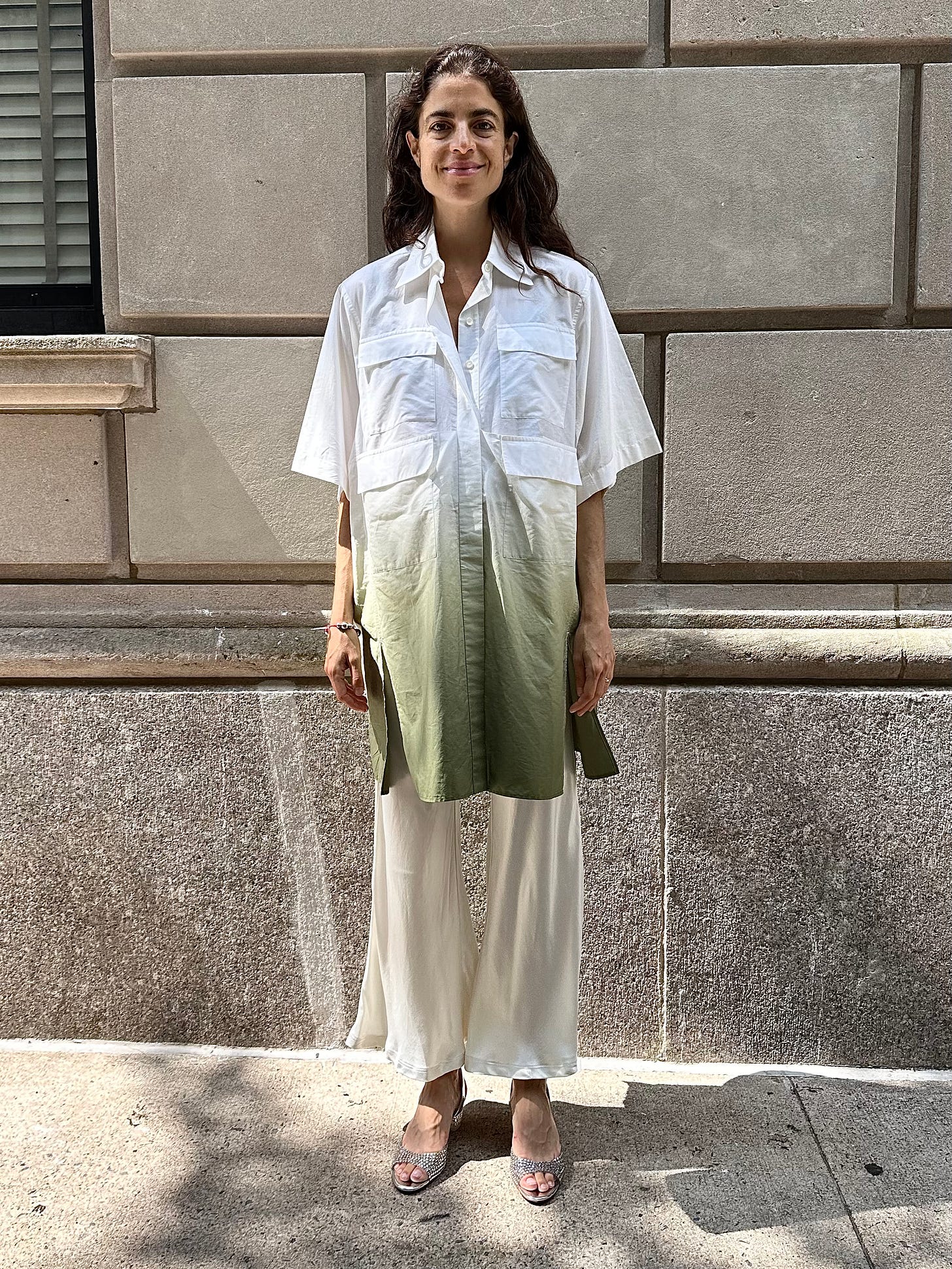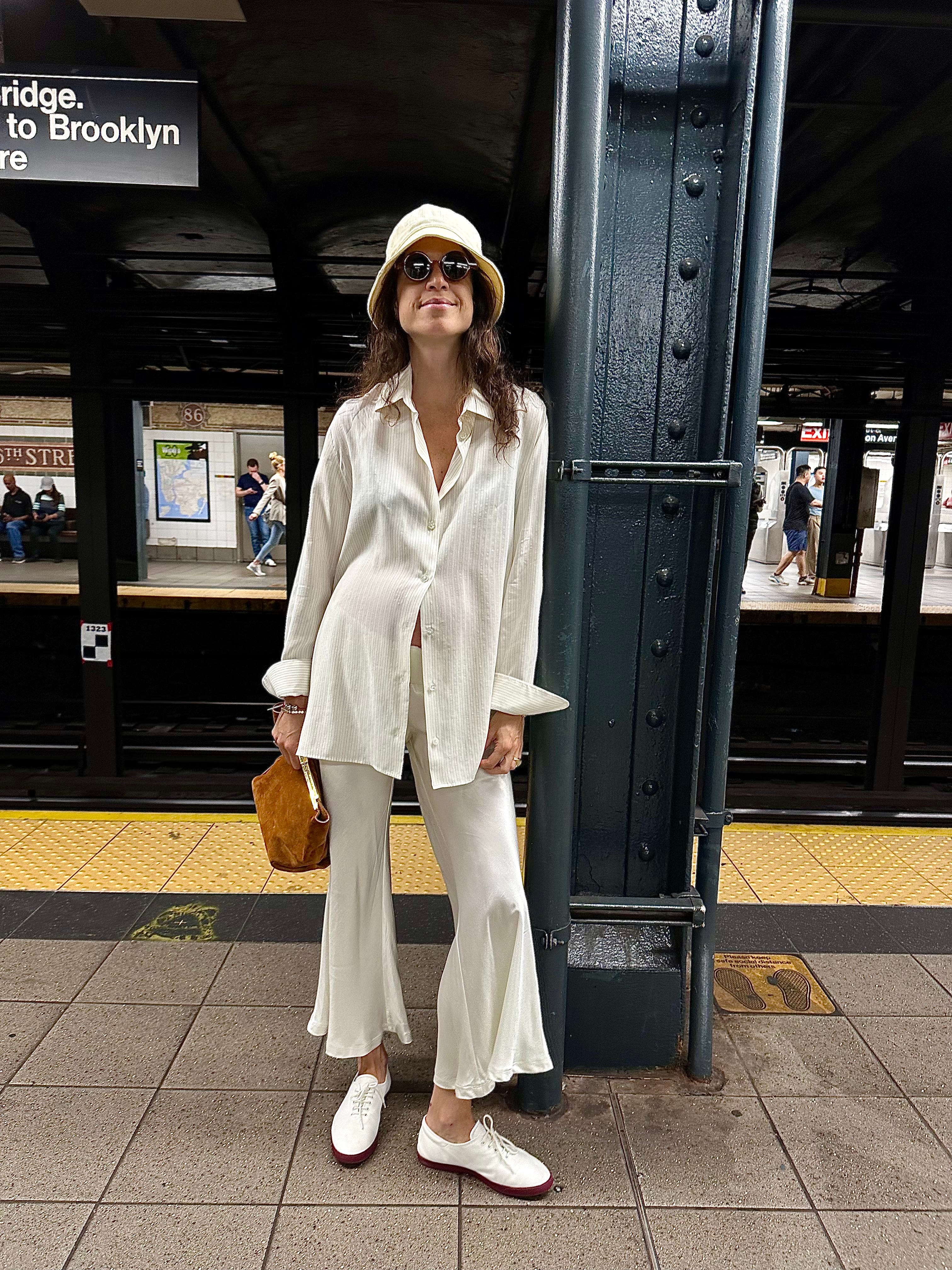 Here’s an ivory silk top to match (the color combo feels very The Row right now), with simple black sandals (Emme Parsons) and a pendant on a leather black chord to tie back to the shoes and anchor the rest of the look’s whimsy.
