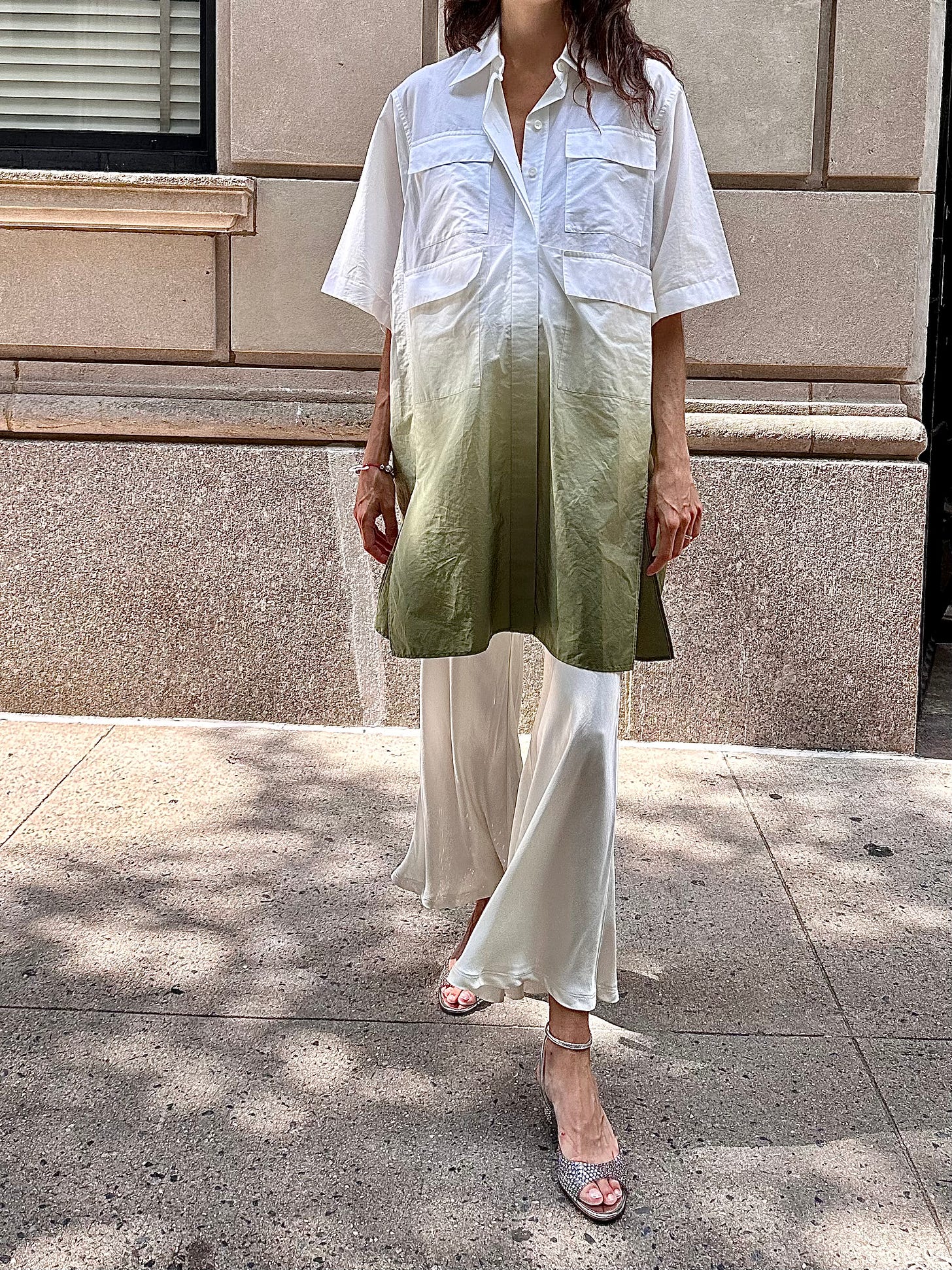 If one variable of your look is pretty extra just as these pants are, you’ll want to neuter the rest of the outfit, which is why I went with subtle wood-sole flip flops (so they’re casual but not like, rubber-casual) and a khaki button down shirt, also big!