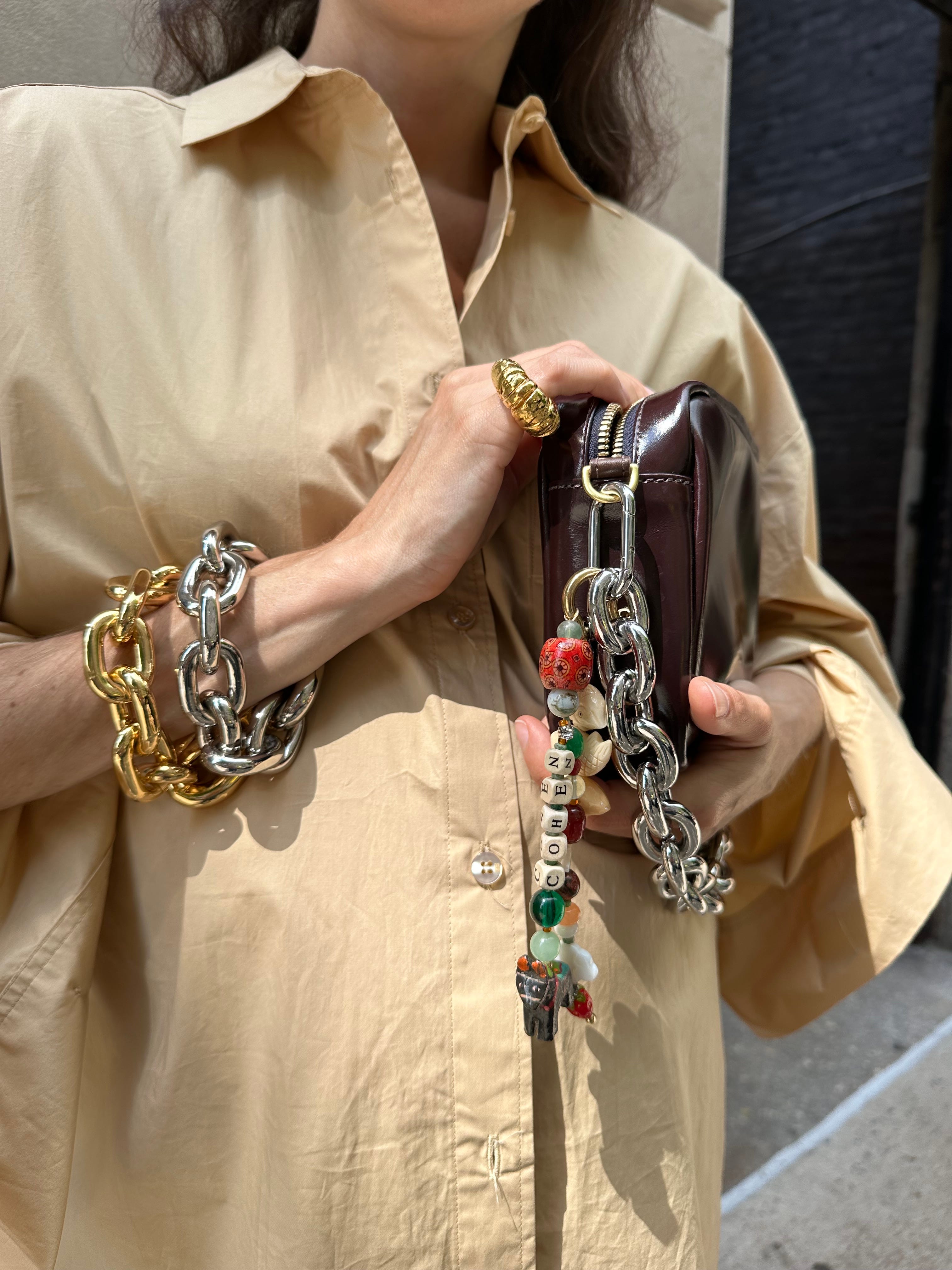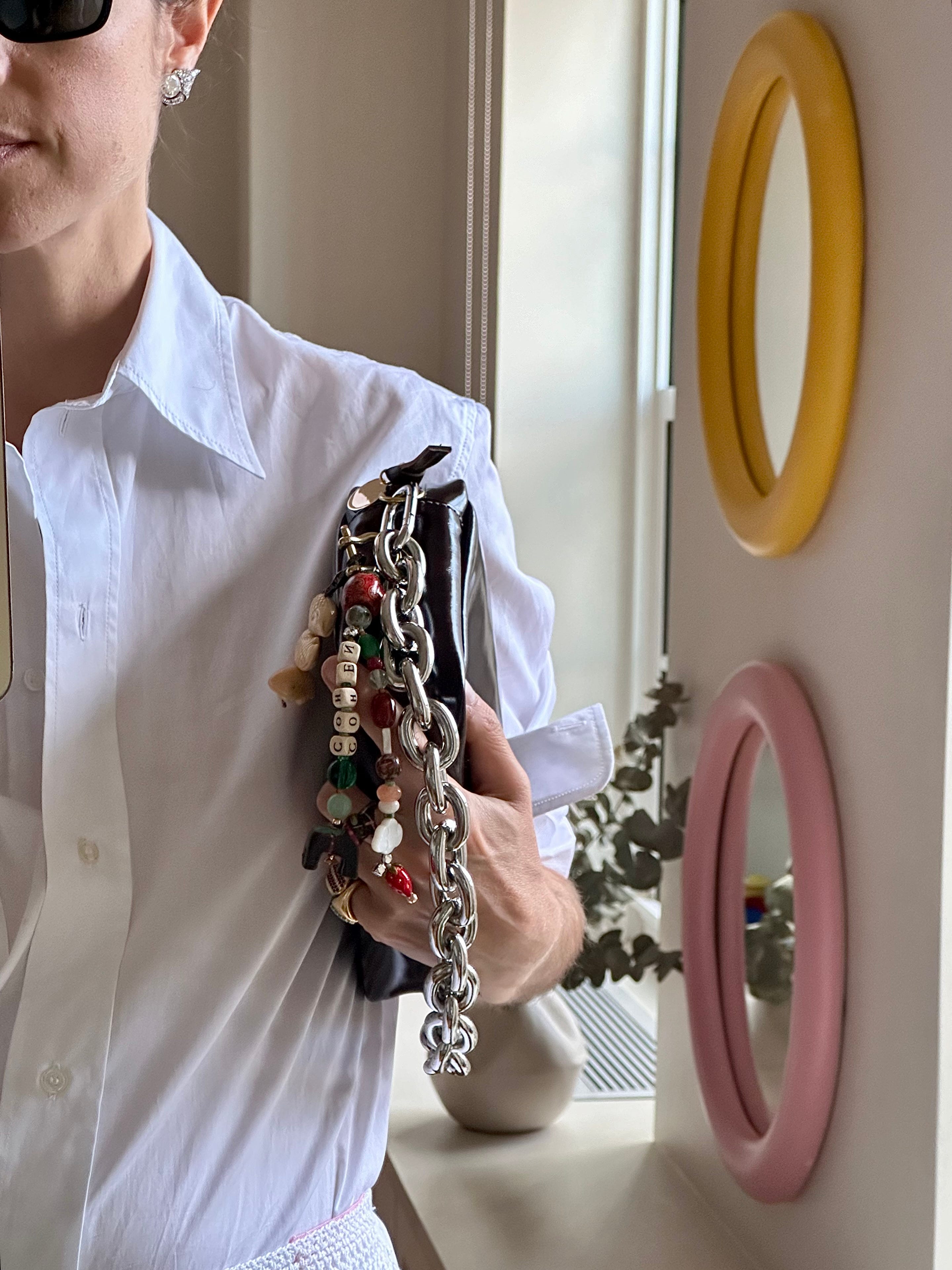 Here’s also the bag — busy with its heavy chain and the add of a playful keychain. One more flourish that doesn’t interfere much with the rest of the looks simplicity.