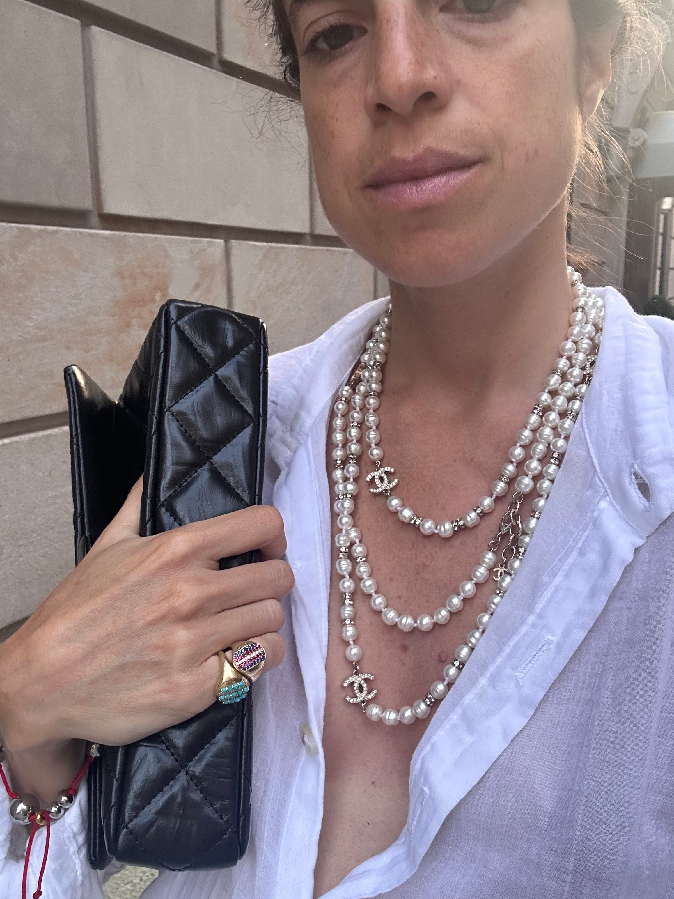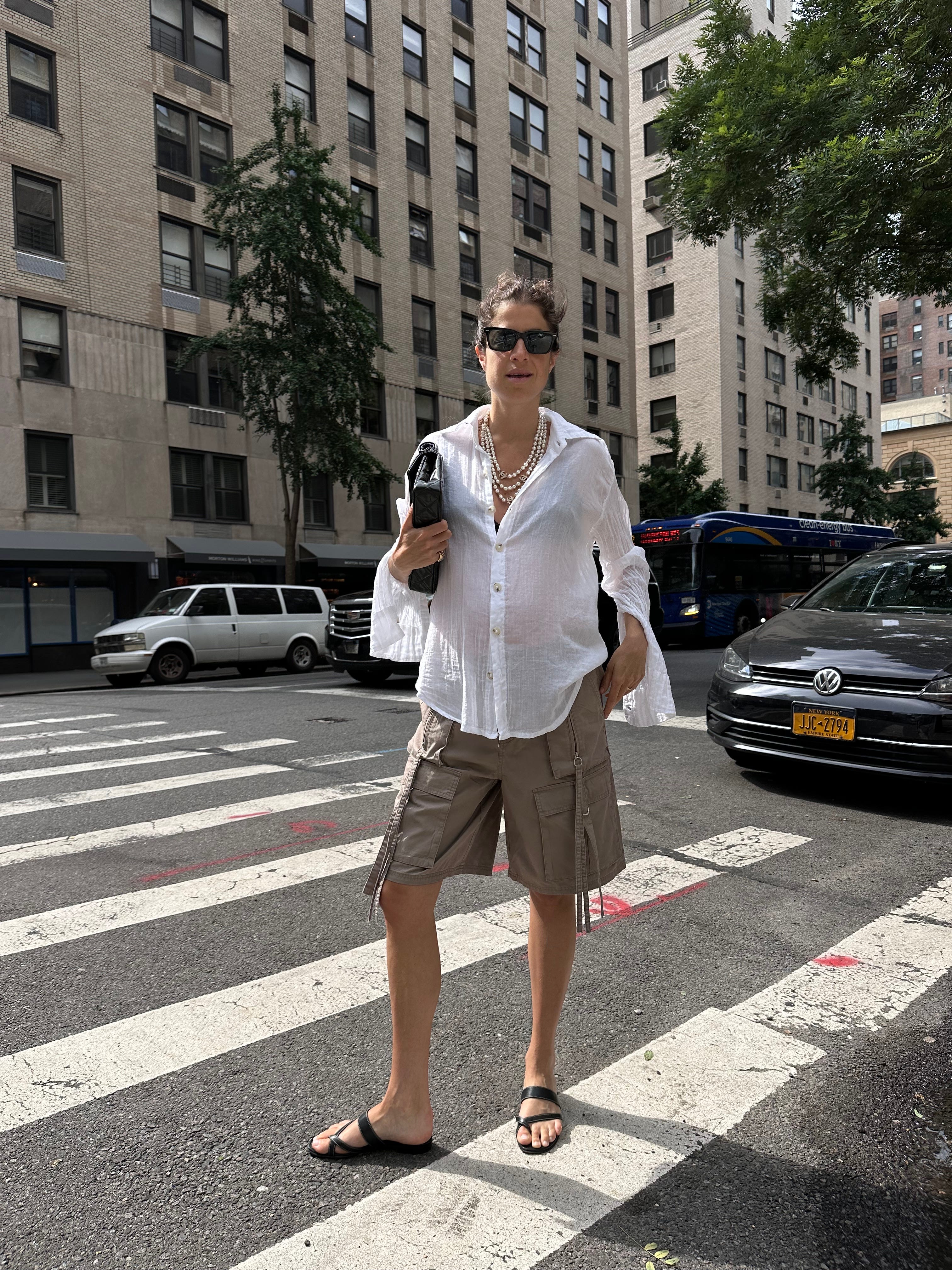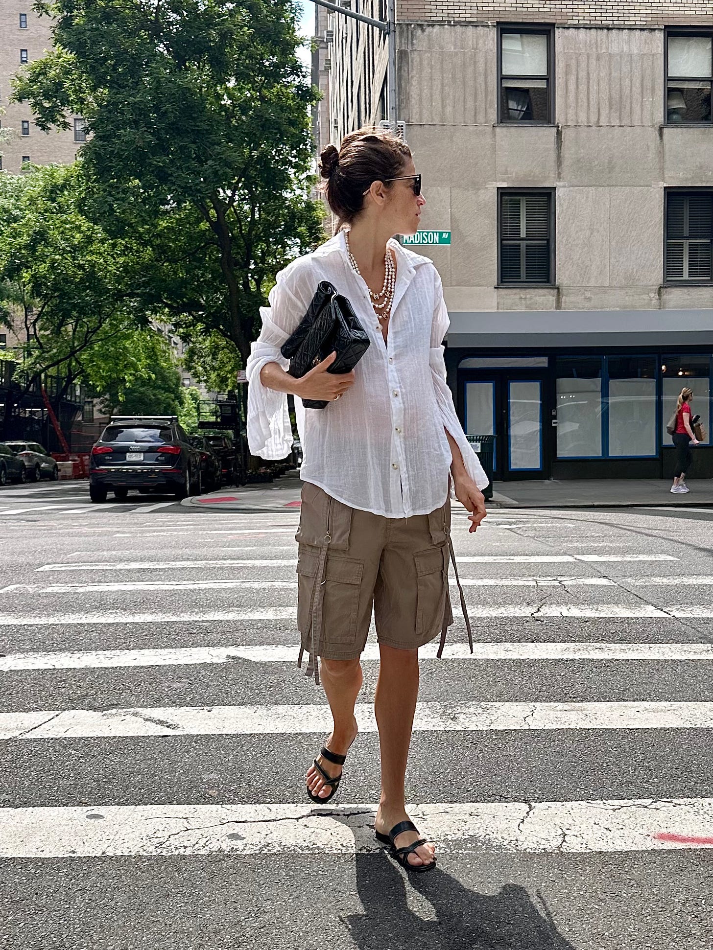 Here for example you’ve got a classic linen shirt with cargo shorts (from H&M — they are a recent purchase inspired by a walk through midtown wherein it occurred to me that this is the summer of ugly walking shorts) and subtle sandals, then the long strand of pearls (wrapped x3) adds an element of glamour that gives a bit of fantasy to the rest of the look’s constitution.