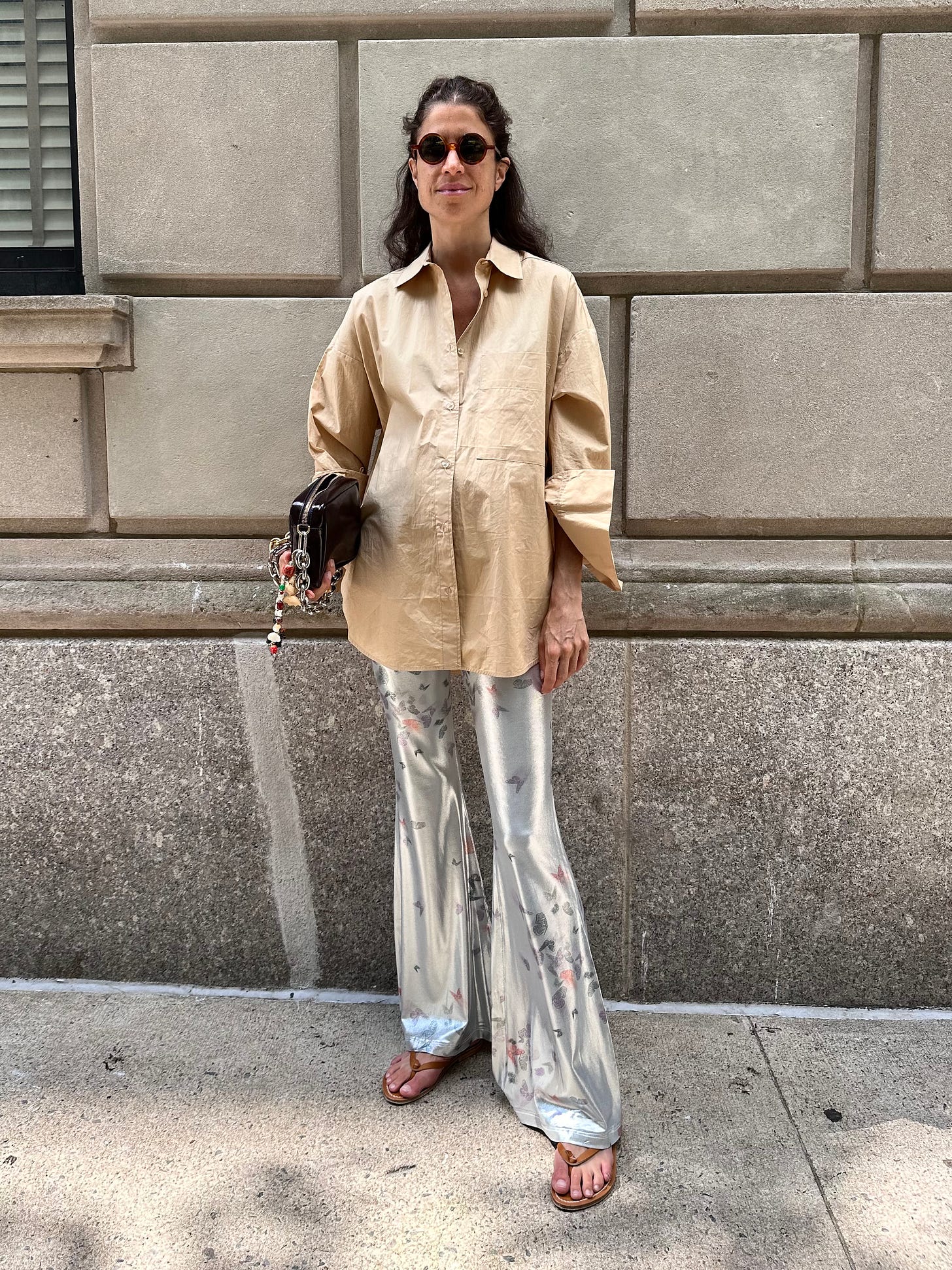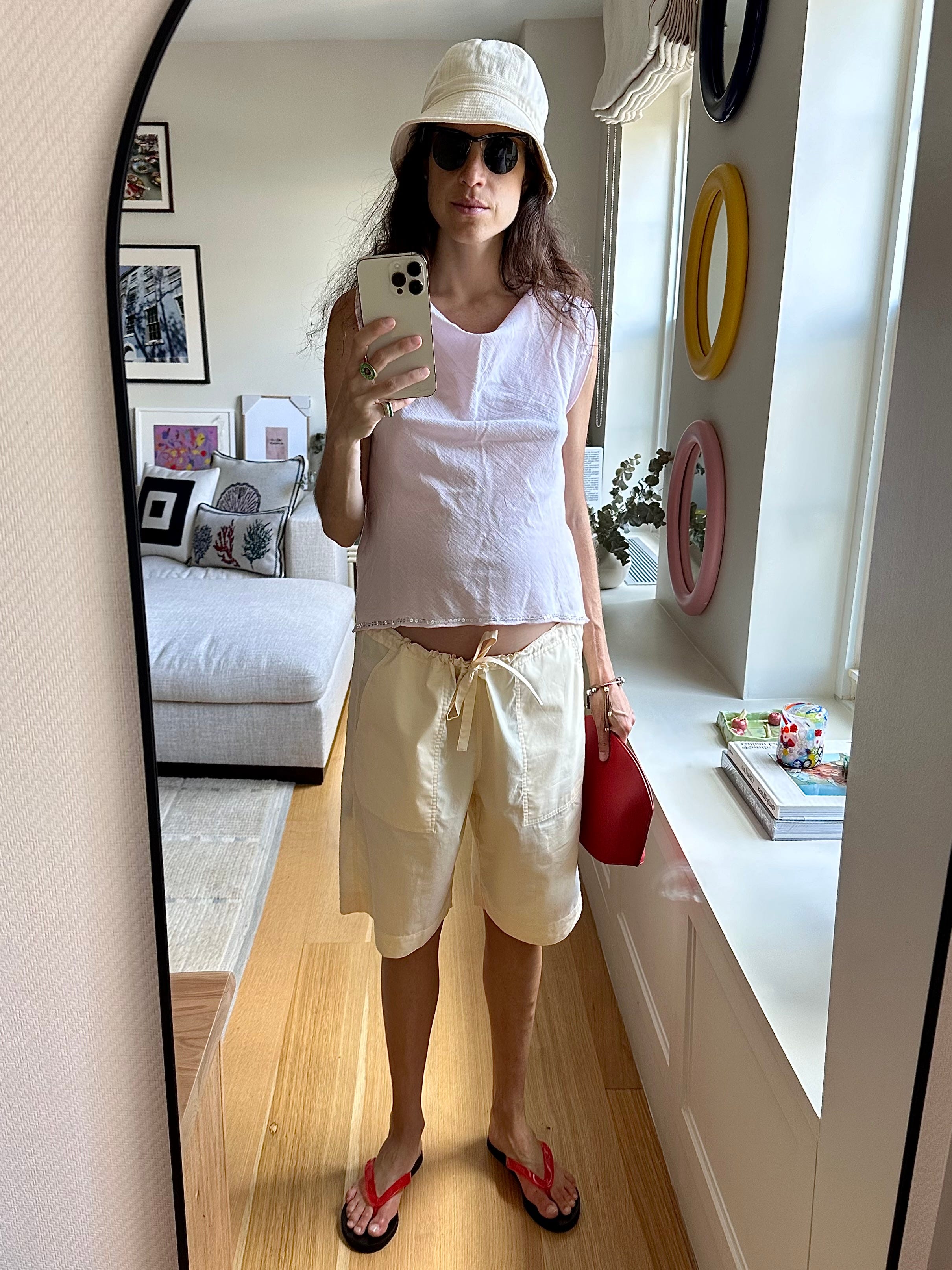When you’re pregnant, the belly serves as its own central piece, and this makes taking a maximalist fashion risk less appealing. So the clothes get simpler, easier (which is a more universal condition of dressing when it gets really hot). But if a plain pair of shorts and a t-shirt (full stop) never cut it prenatally, they probably won’t do it now. So nailing the balance is about gently combining the accessories you’re going to add and the one that’s attached to you.