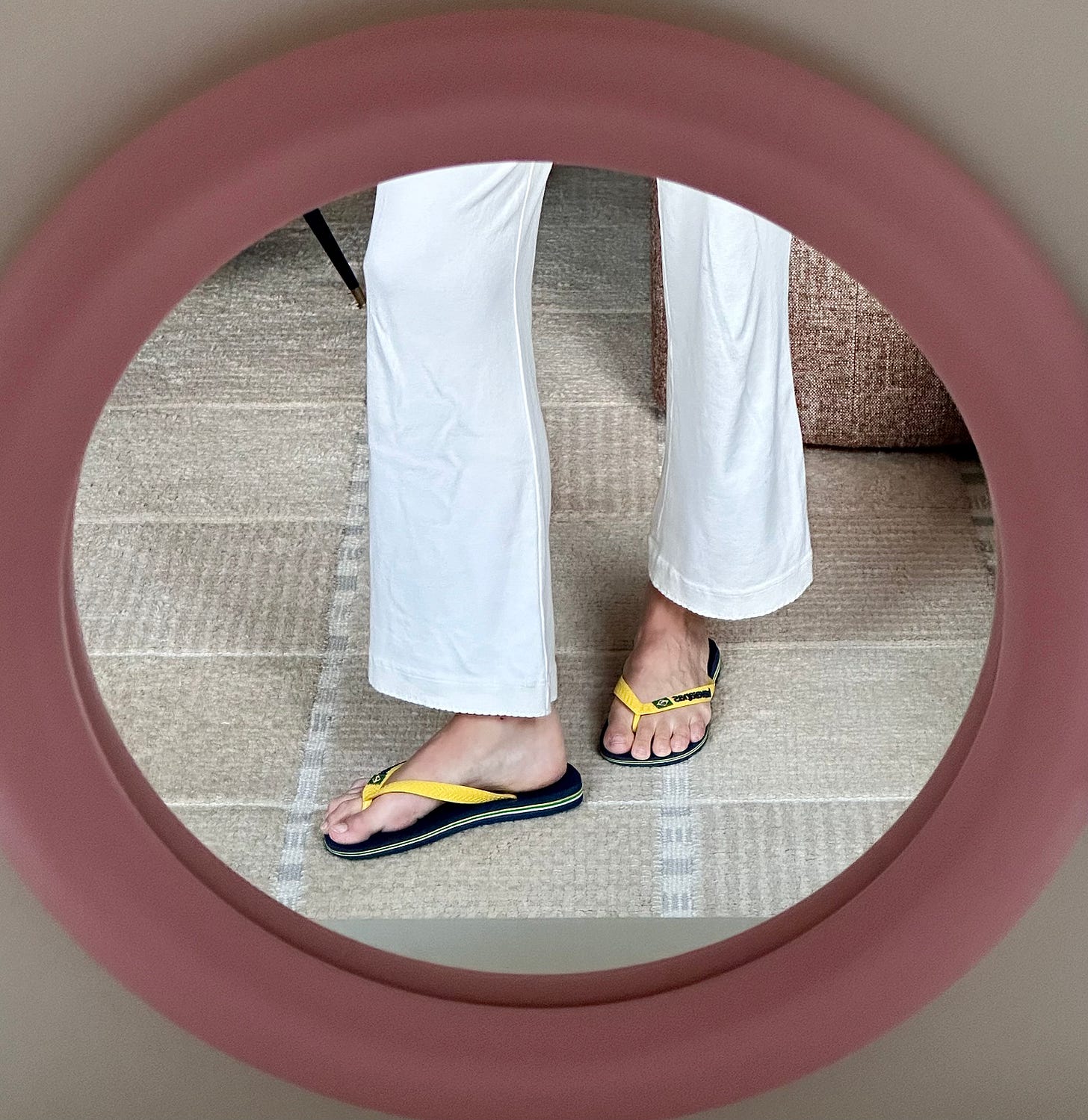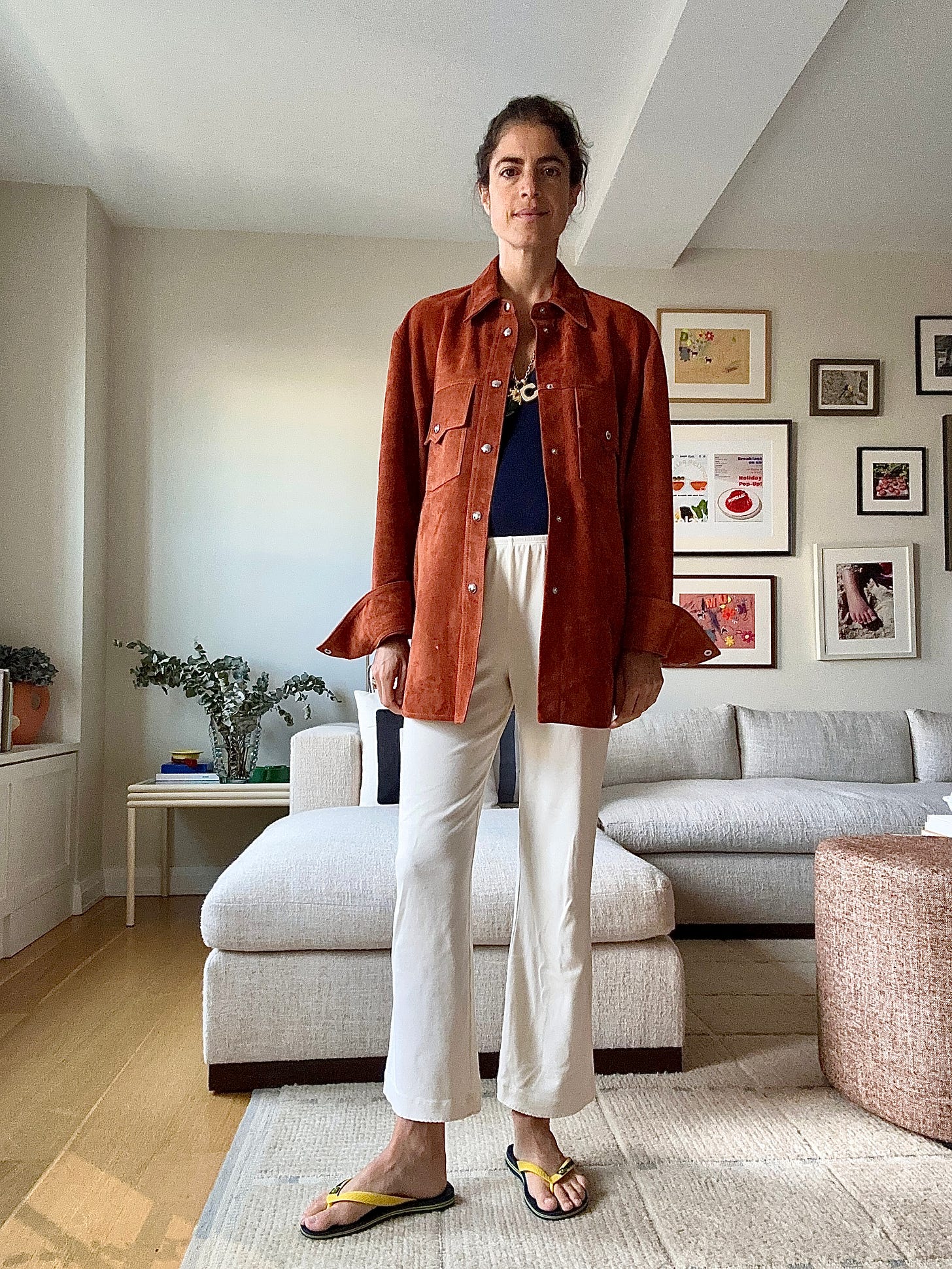 Here’s also just something I wore last week that made me feel like a million bucks. Interior pajamas (eg layers of fine weave cotton) that feel more dressy because of the overarching suede shirt (which doesn’t have to be suede btw — the same one comes in a myriad of options). And then there is something to the flip flops too, which christen the casual nature of the look, especially because of the yellow detailing.
