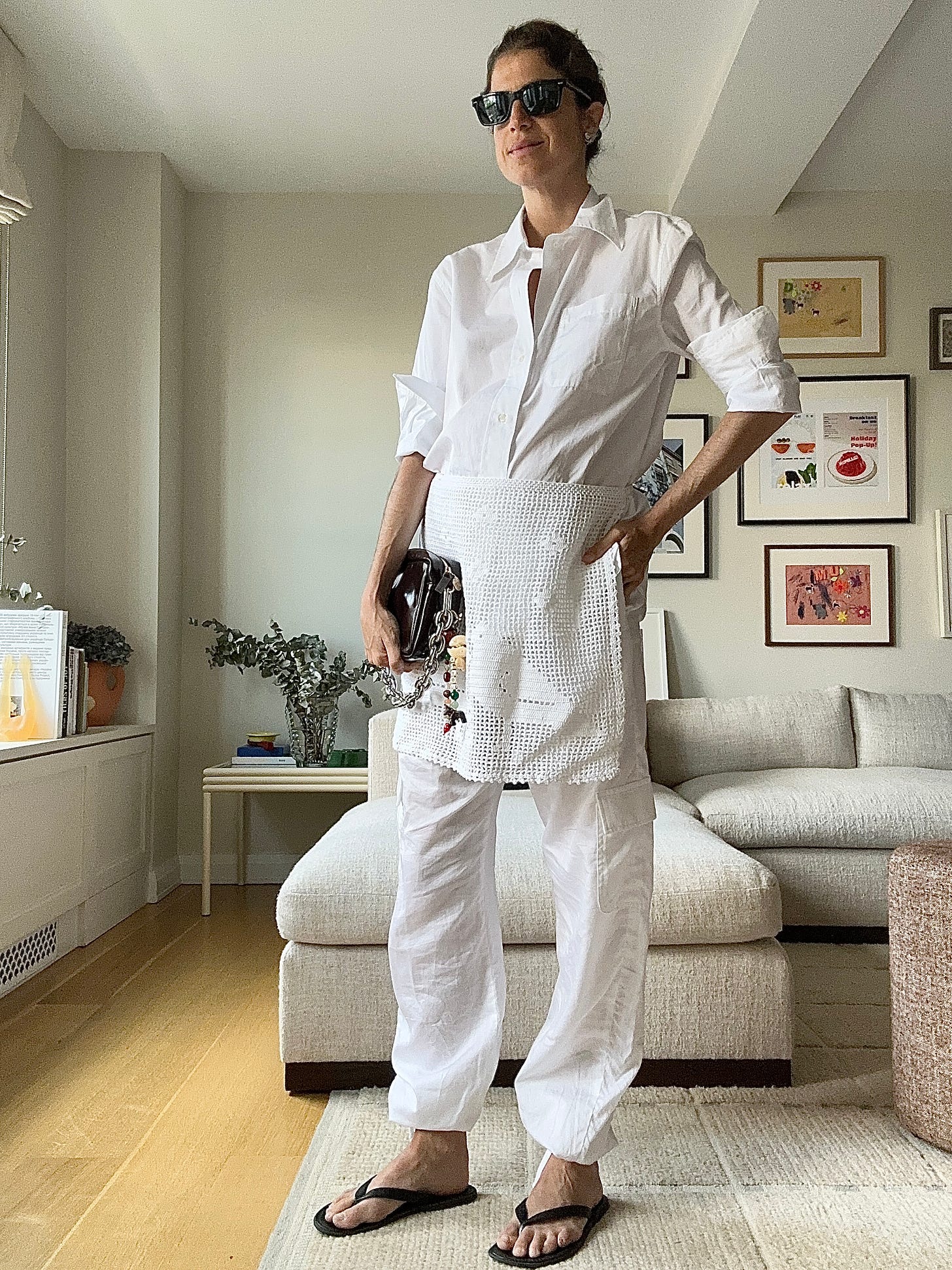 I’m not letting this one go without a fight — aprons are coming for us! A fine way to add a flourish to a simple look of breathable pants and shirt, and I suspect it will look way better when I have a waist again, can tie it up higher and style it more like a peplum. If I were you, I’d wear it like that, possibly with a skimpy tank top tucked into the apron, and maybe the breathable shirt styled over as a shacket.