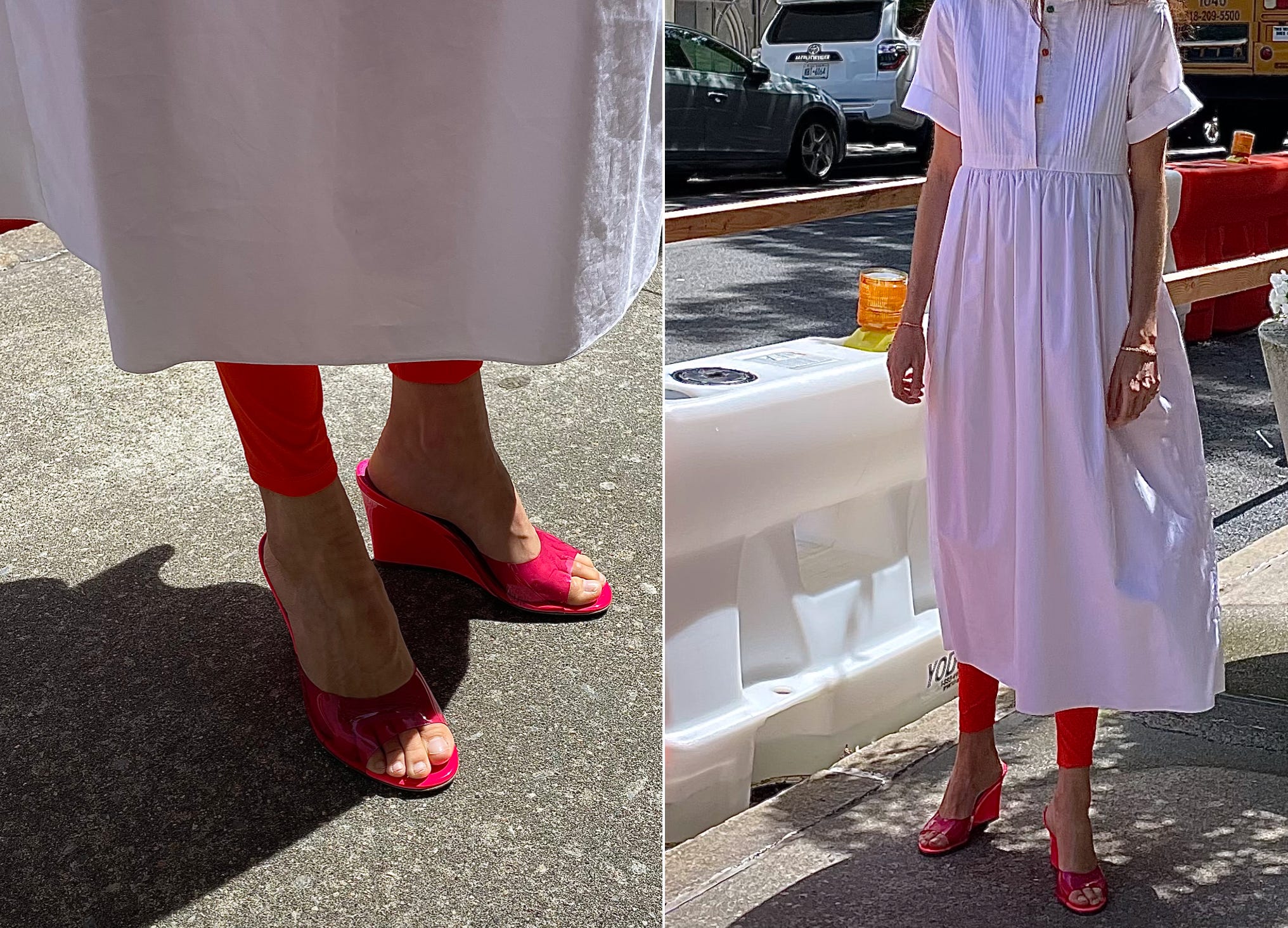 I love this! Question - the white dress outfit. Would the red Manolo leggings look okay with the pink ASOS mules? In your picture the red on red looks like a perfect match - is that what I should aim for?