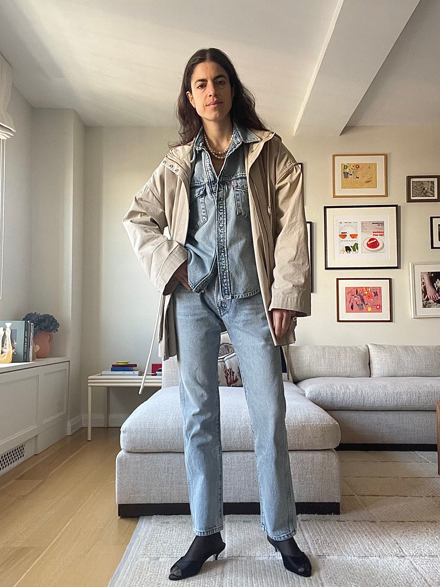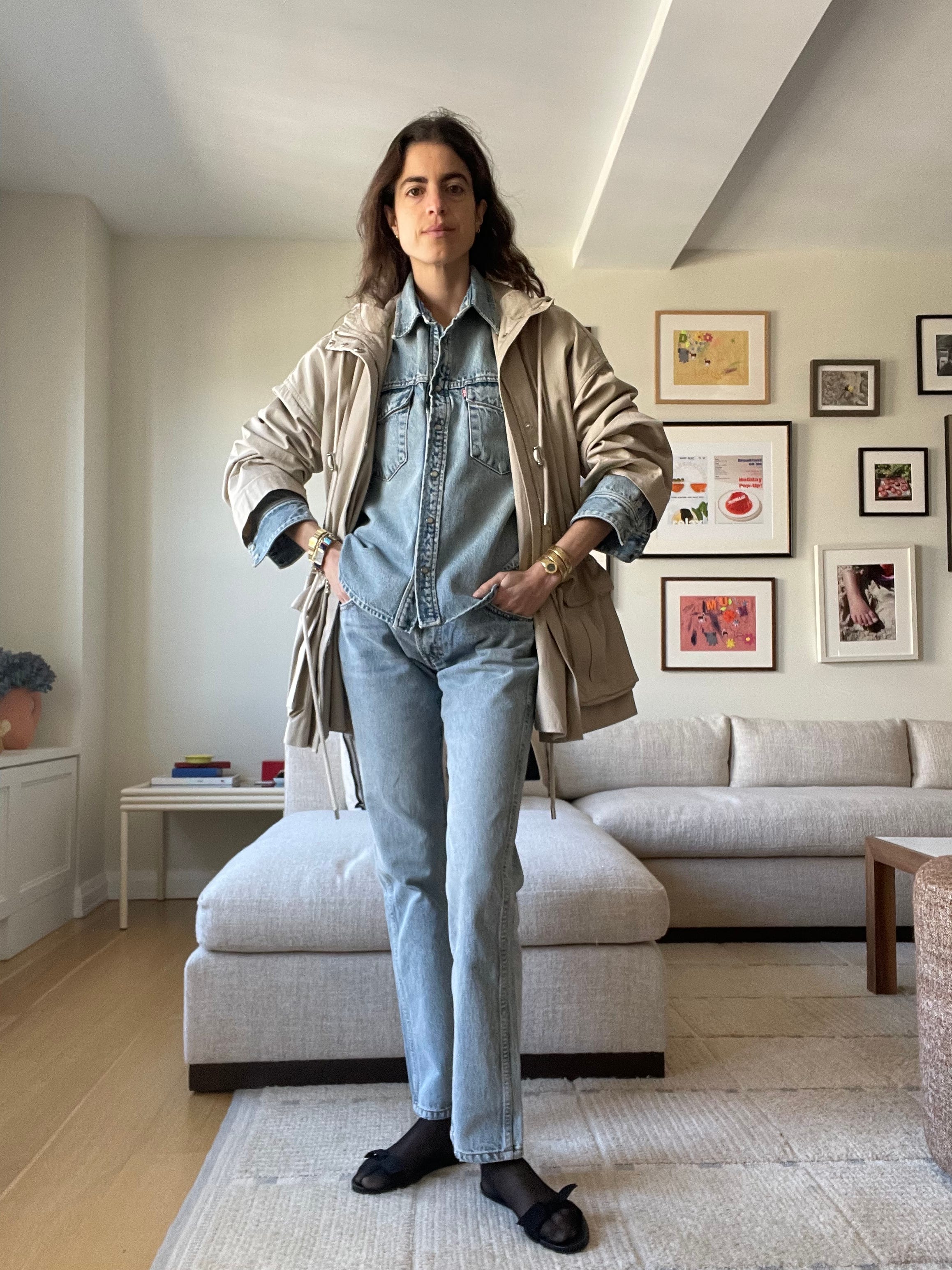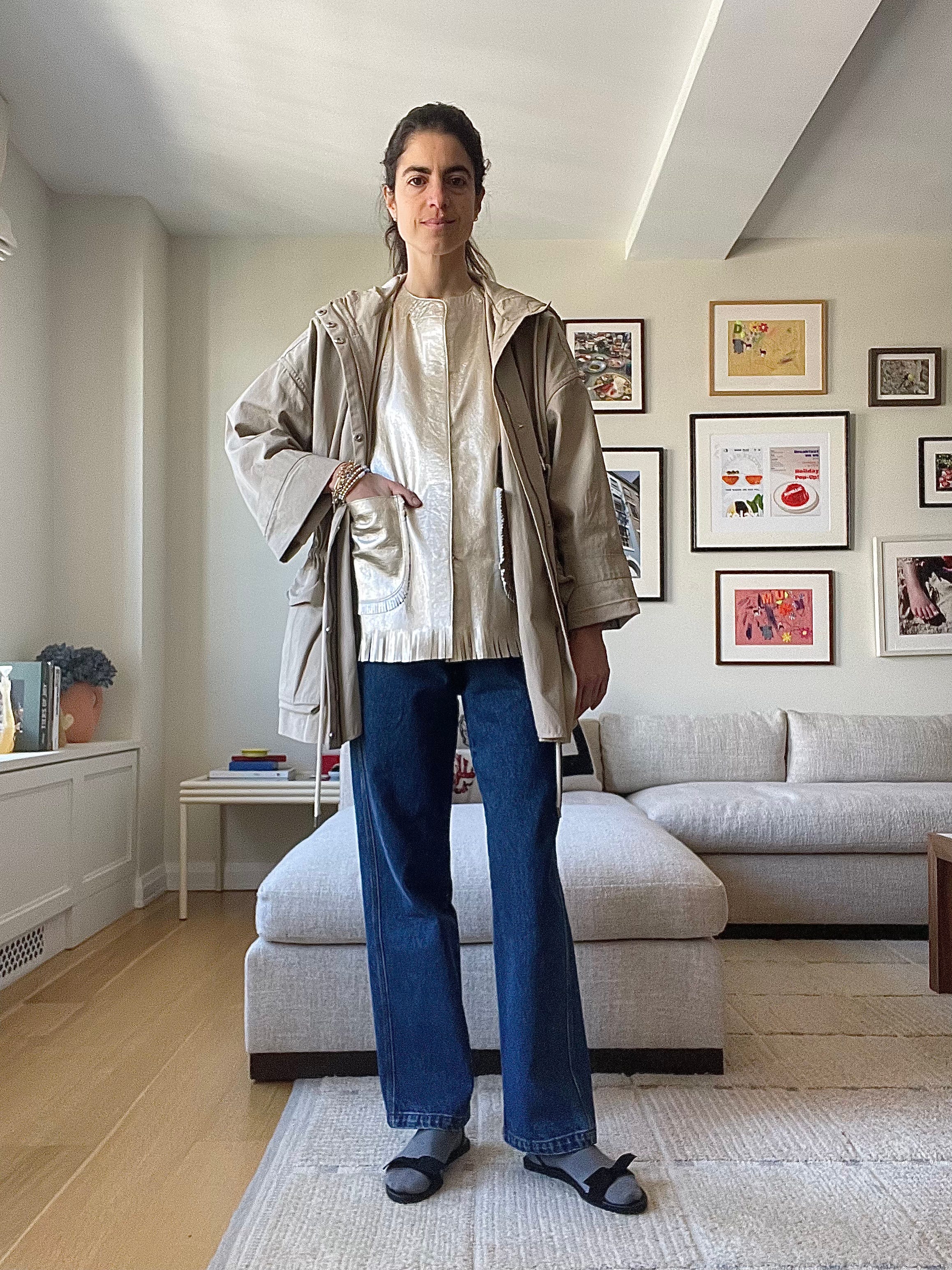 I cinch the jacket at the waist to give it more shape. Rest of the look includes a Wardrobe denim shirt, Khaite jeans (the ‘Kyle’) and sandals by The Row