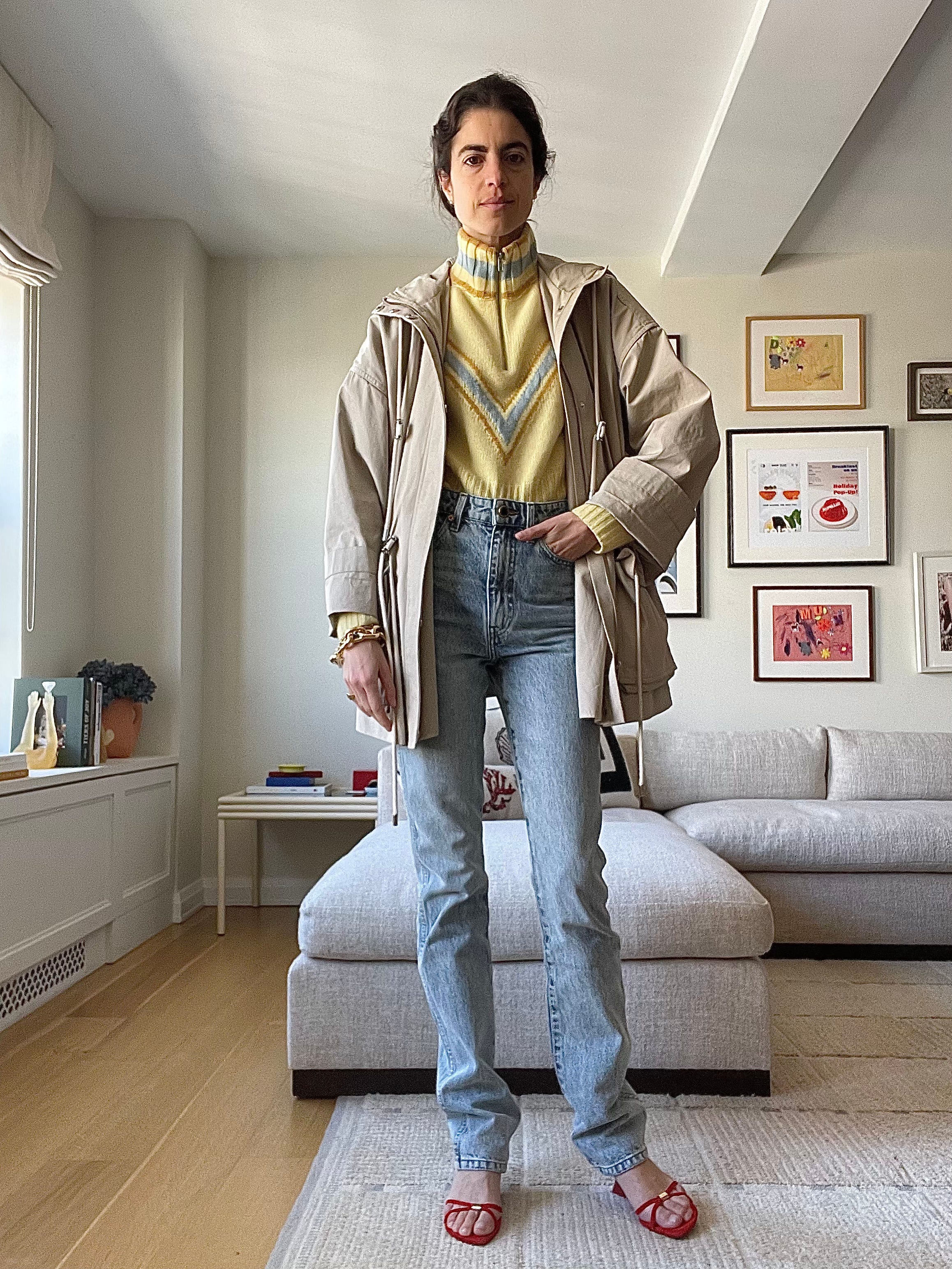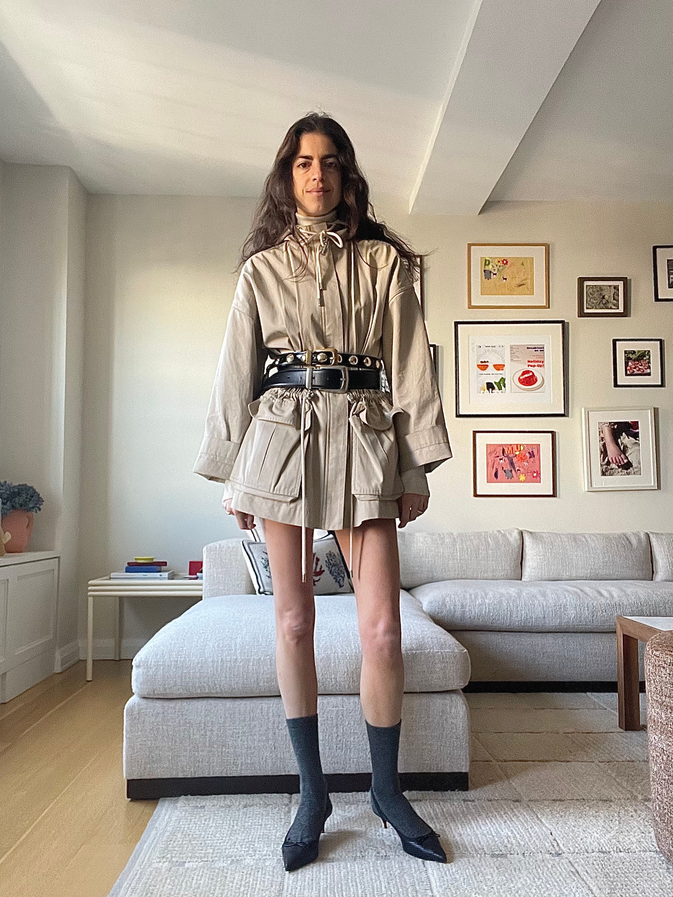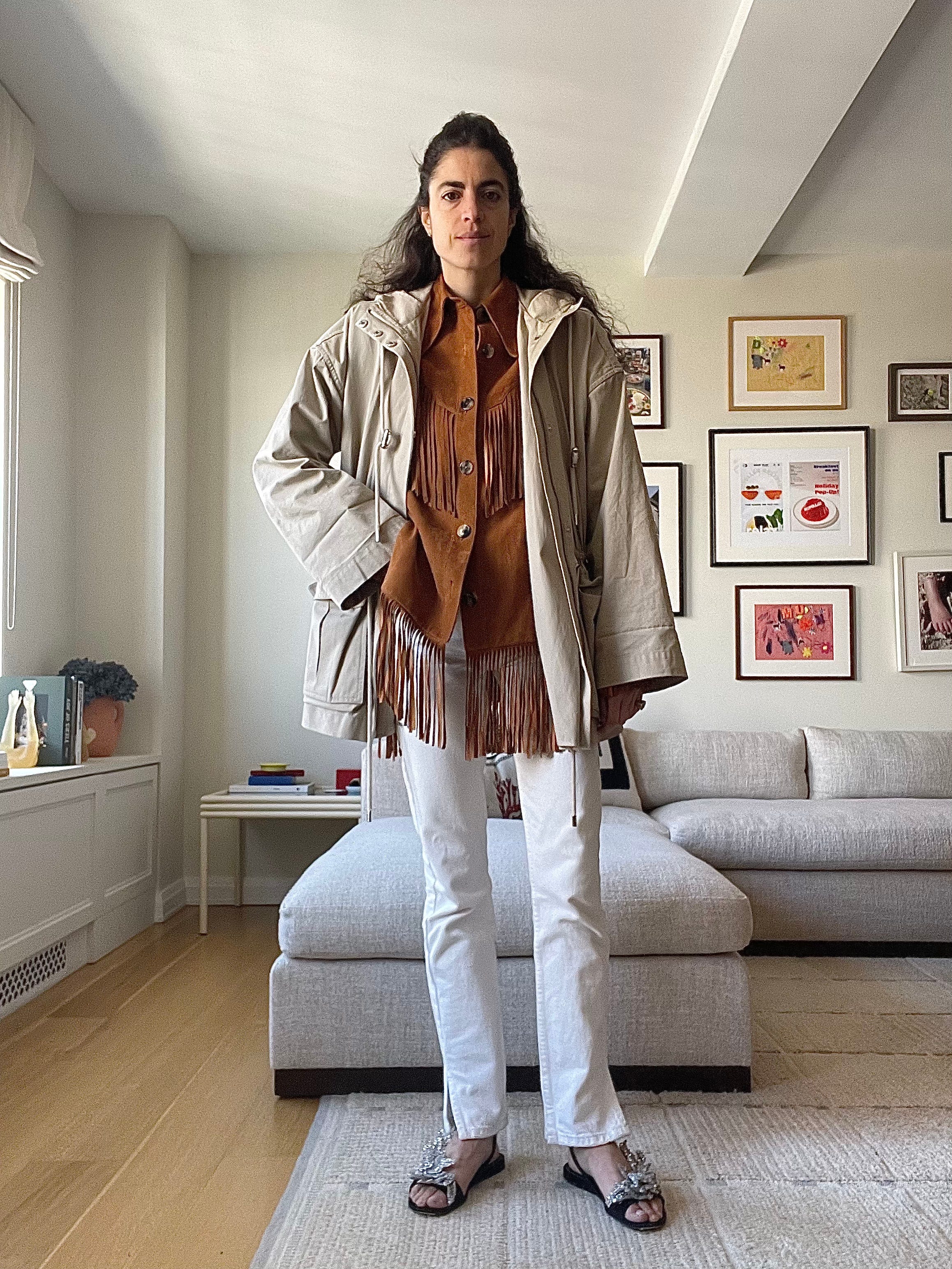 I cinch the jacket at the waist to give it more shape. Rest of the look includes a Wardrobe denim shirt, Khaite jeans (the ‘Kyle’) and sandals by The Row