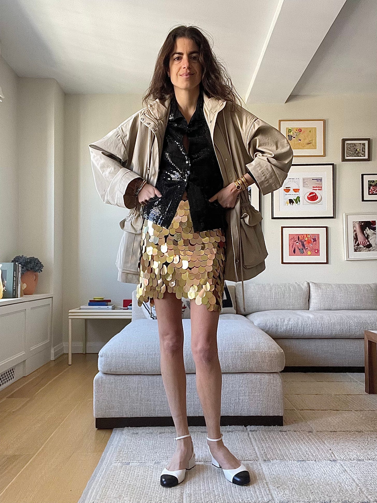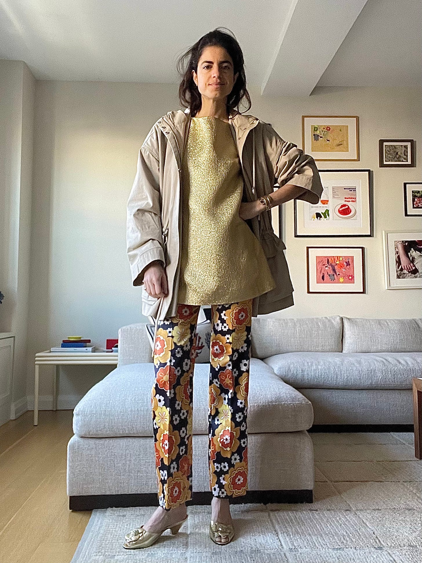 Consigned Michael Kors midi dress, hemmed to become very mini, Paco Rabanne pants from a collab with MyTheresa some years ago and literal house slippers from Europe that my grandma gave me because they don’t fit her. “Moving to America made my foot size grow 2x,” she says.