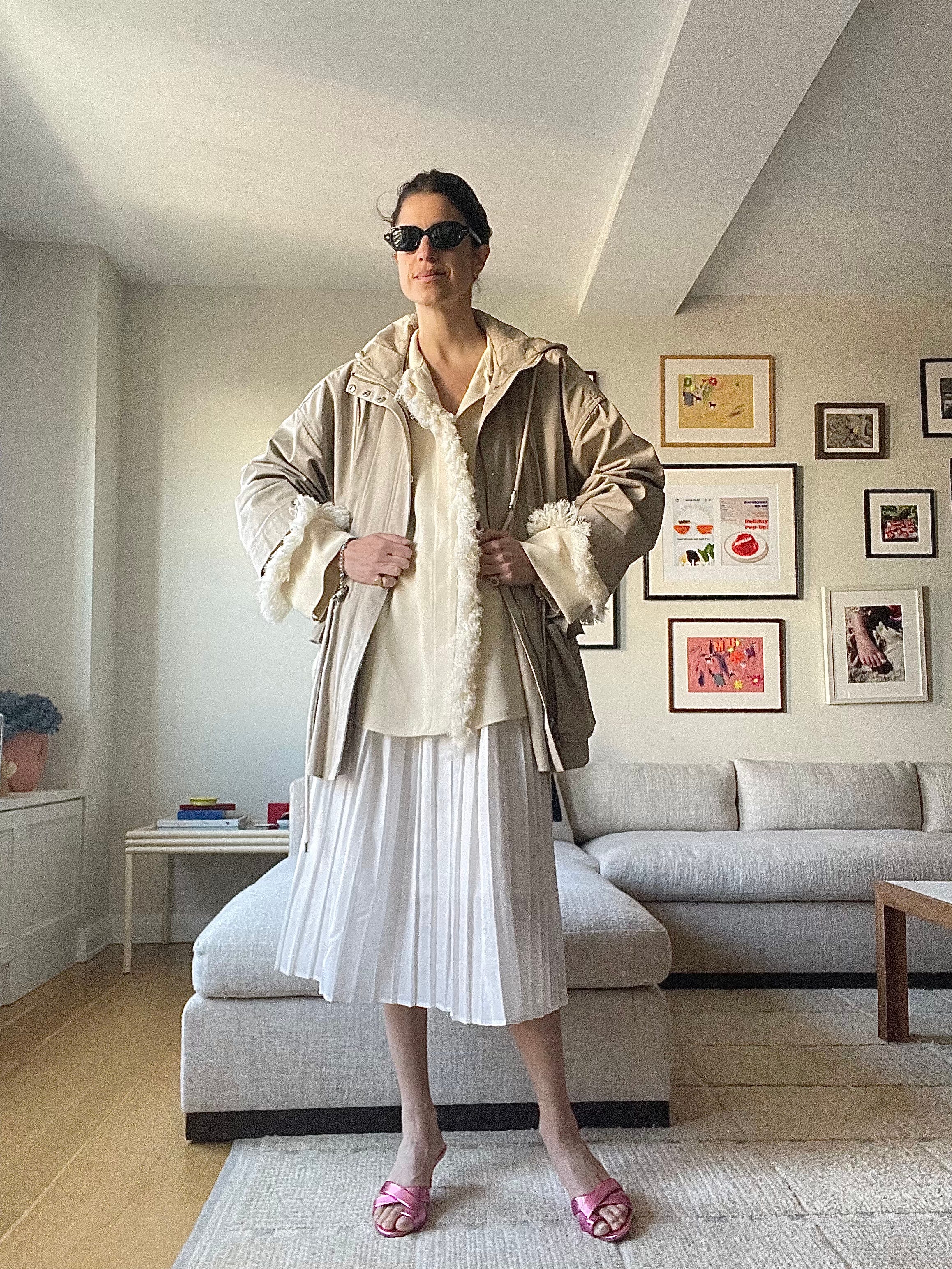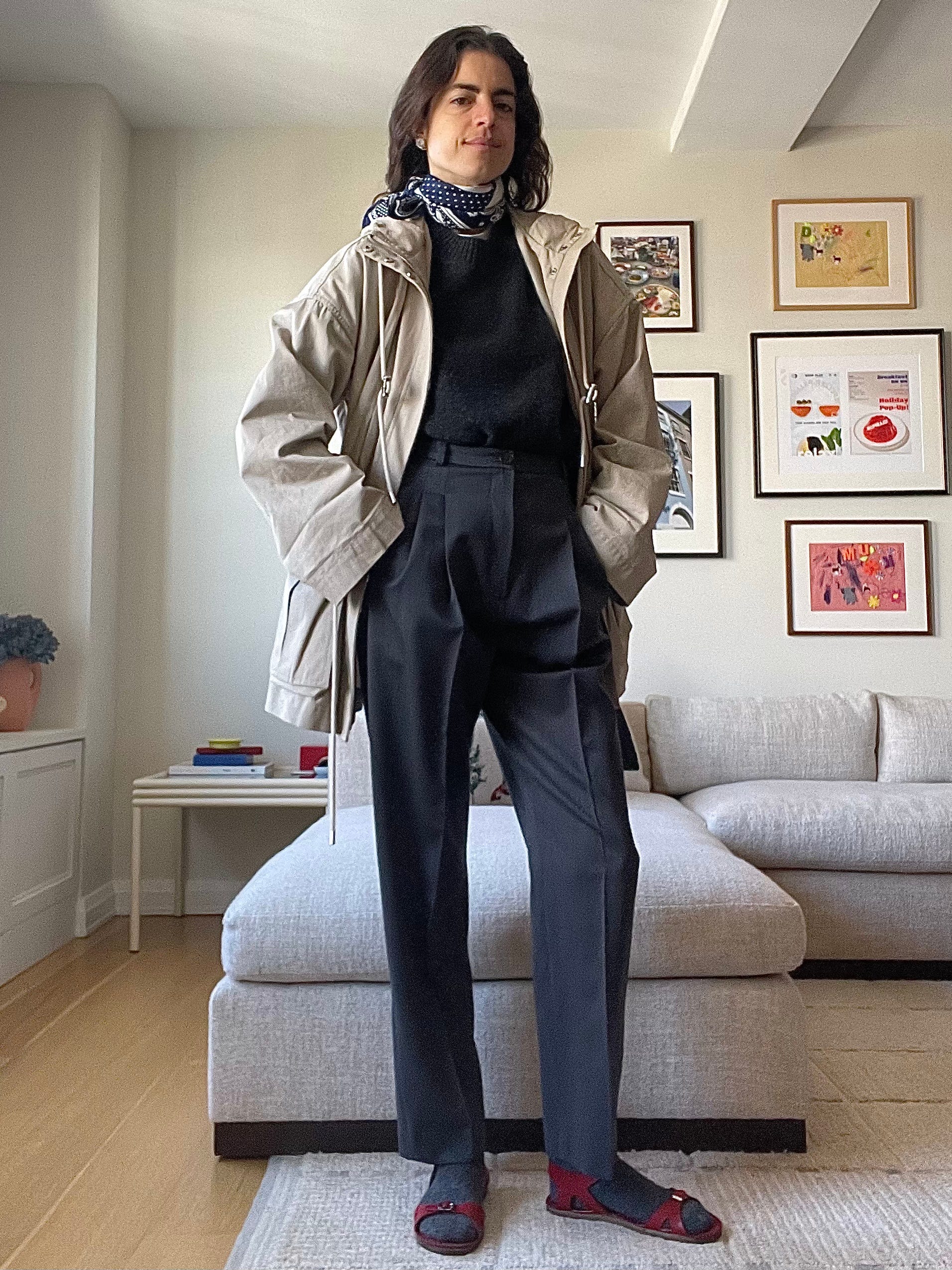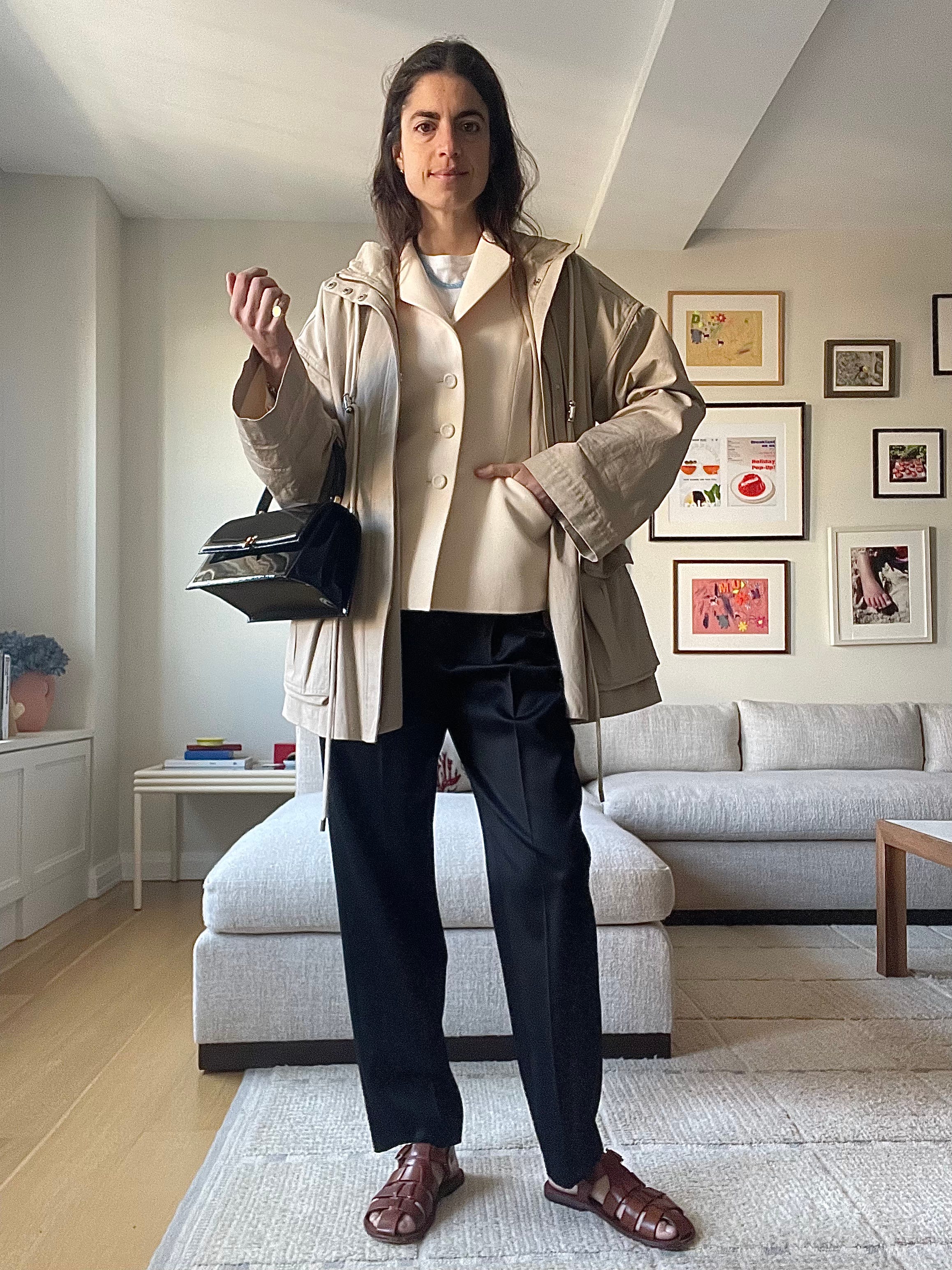 Wearing the parka with a Ven-store sweater, Emi Mess pants, socks from Ines and sandals from The Row, which you might recall as a dead ringer for these.