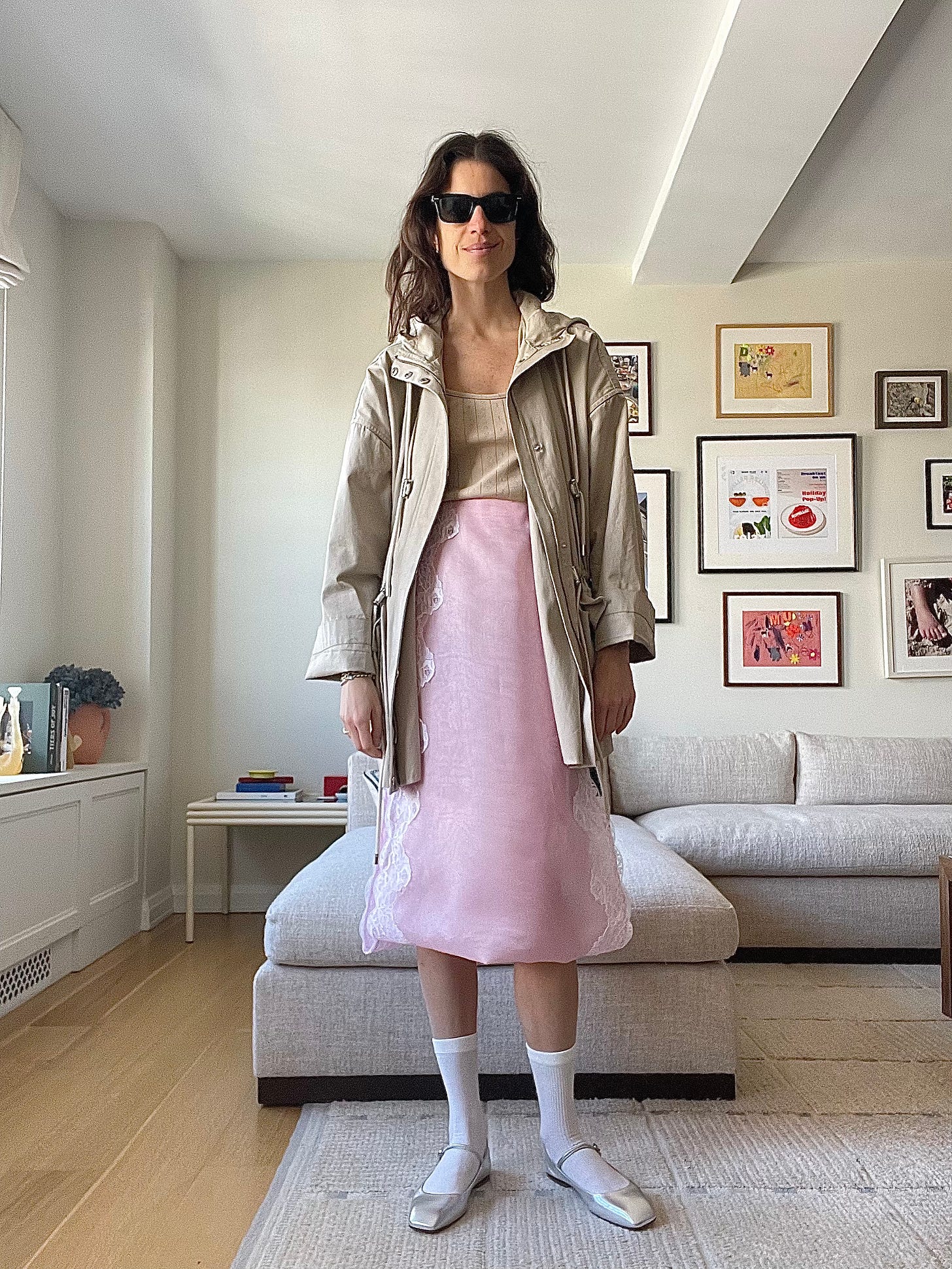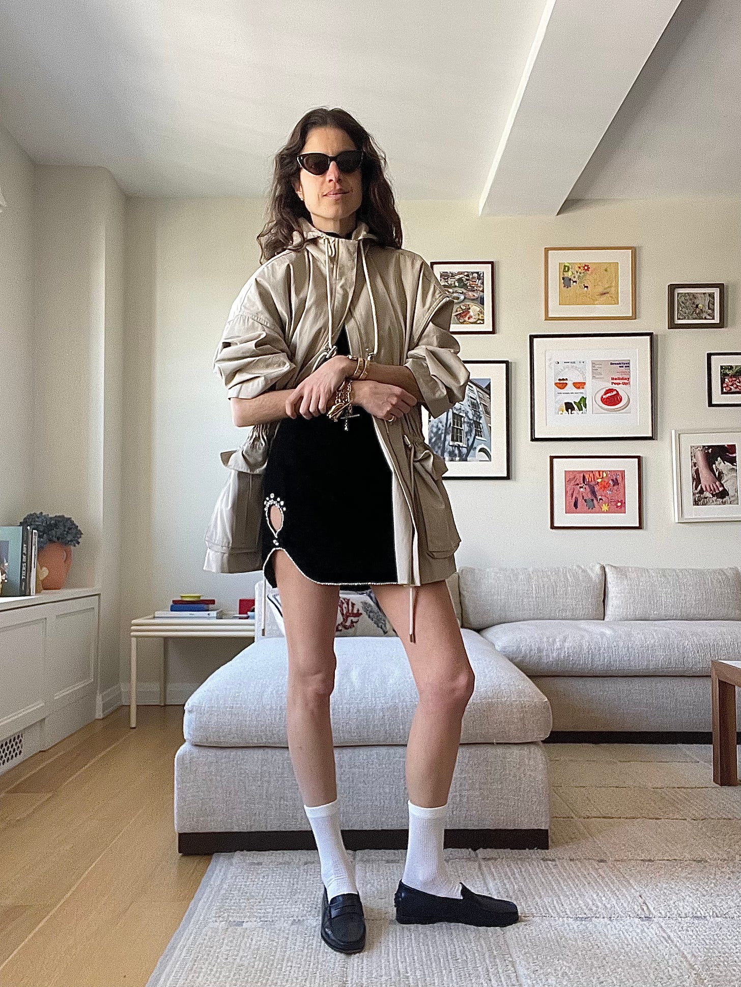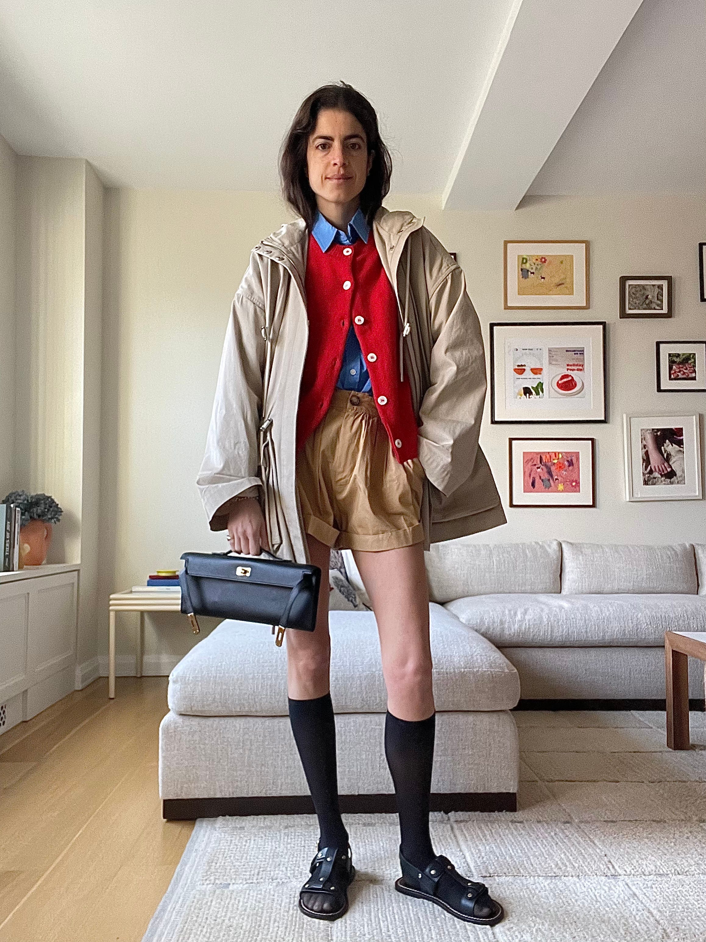 Wearing the parka with a Ven-store sweater, Emi Mess pants, socks from Ines and sandals from The Row, which you might recall as a dead ringer for these.