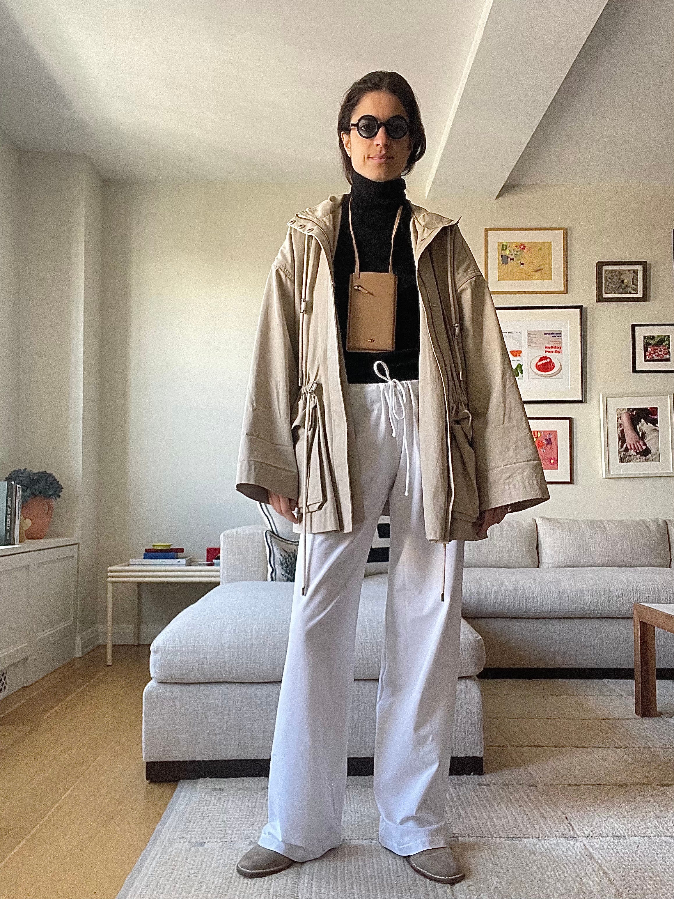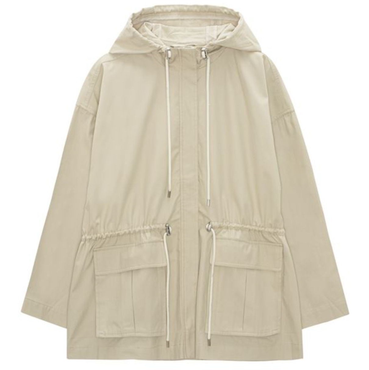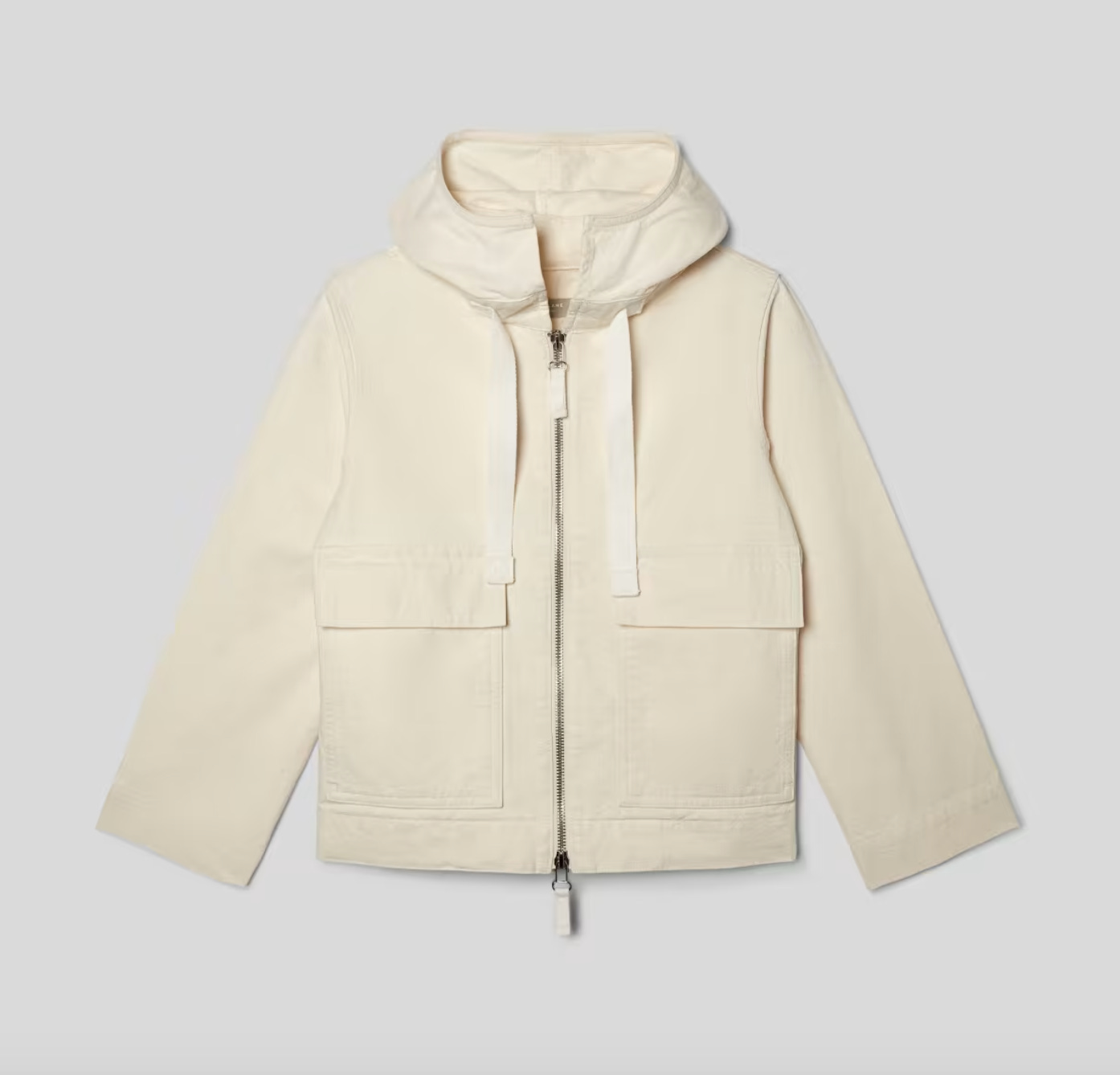 A trench coat is the most common answer to the question of what kind of jacket one should wear through the spring, but a cotton anorak (known otherwise as “a shell parka”) that is trench-y in material (cotton twill, often water resistant), a bit more informal in silhouette (soft shoulders, oversize arms), and most practically, hooded, might actually be the ideal thing to put over your outfit this time of year.