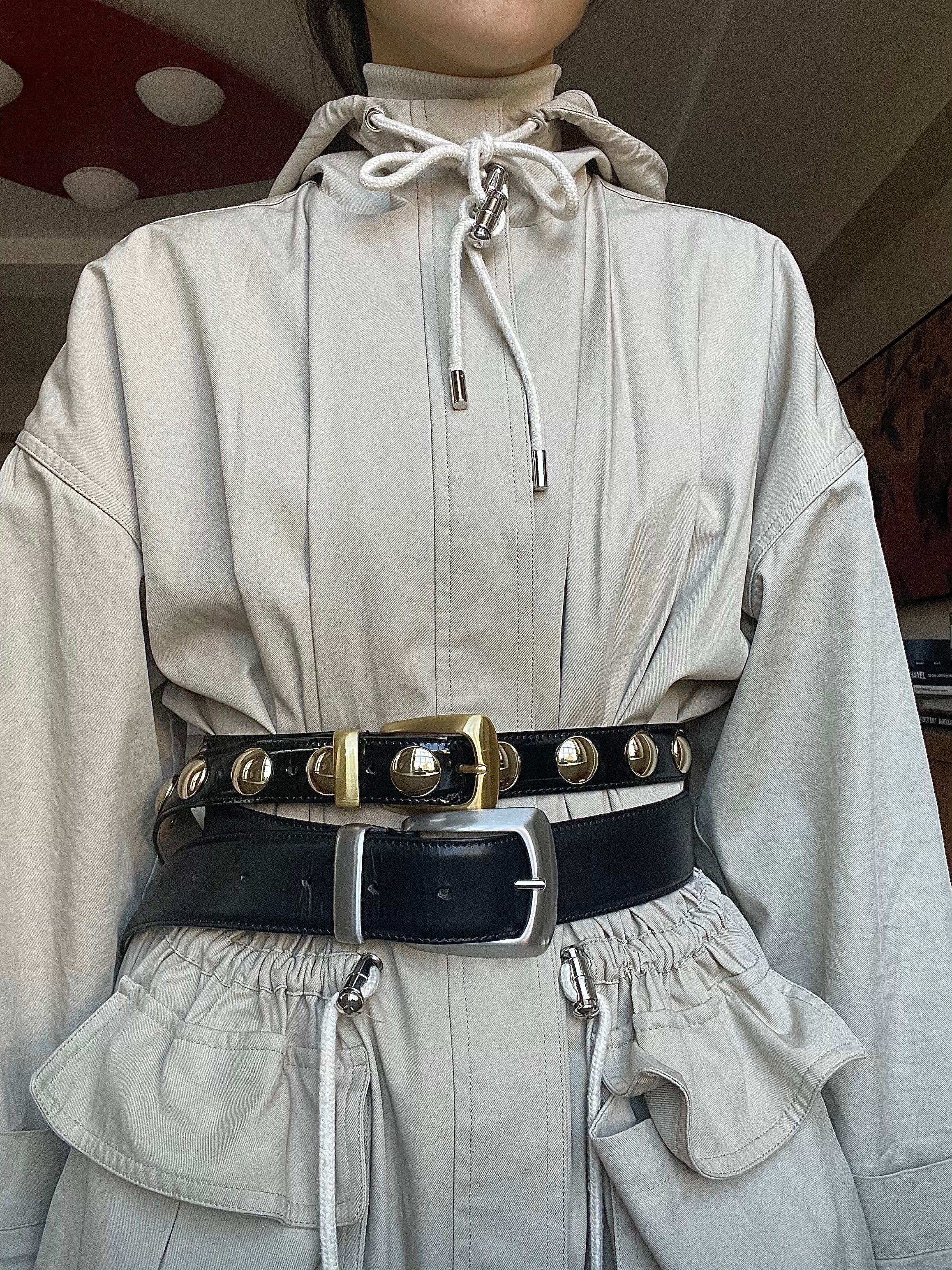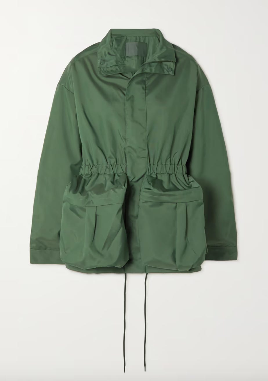 Hooded for weather convenience, neutral in color, soft in material — and lightweight too (good if you want to wear something over). But oversize enough to layer as many sweaters under as you’ll need — though a counter jacket (a fancy one!) works well too. Drawstrings to adjust the waist line and create a peplum effect and two large front pockets that rest right over the front of your hips when the jacket is closed, adding an almost Miu Miu effect in its mini skirt vibe to the piece. They (the pockets) May also just rest softly over the sides of your hips, as if you were in fact wearing a peplum. $395